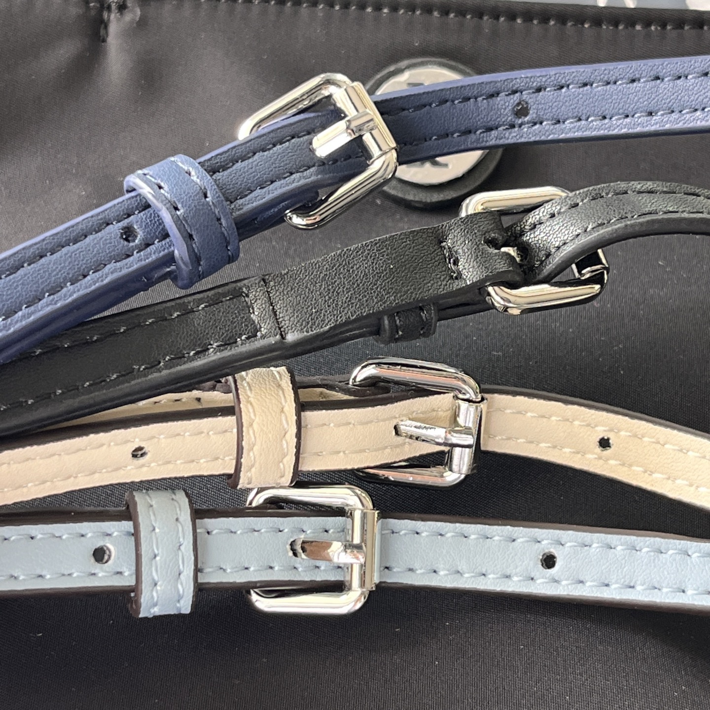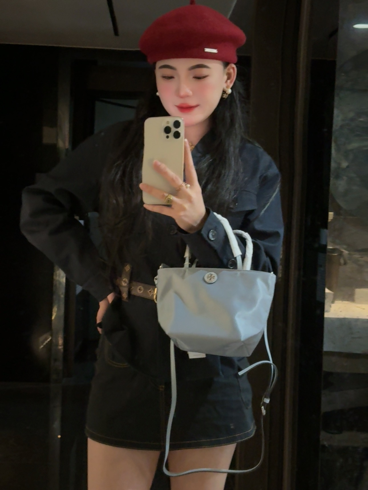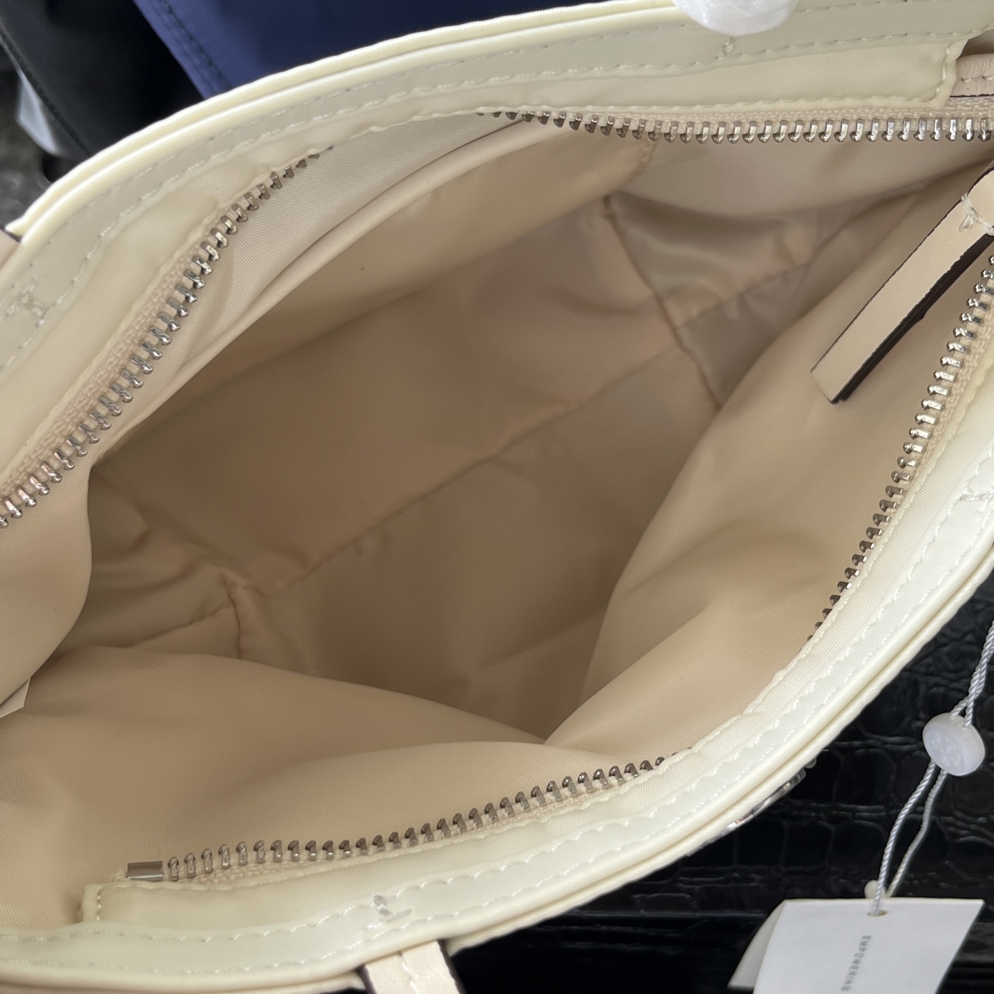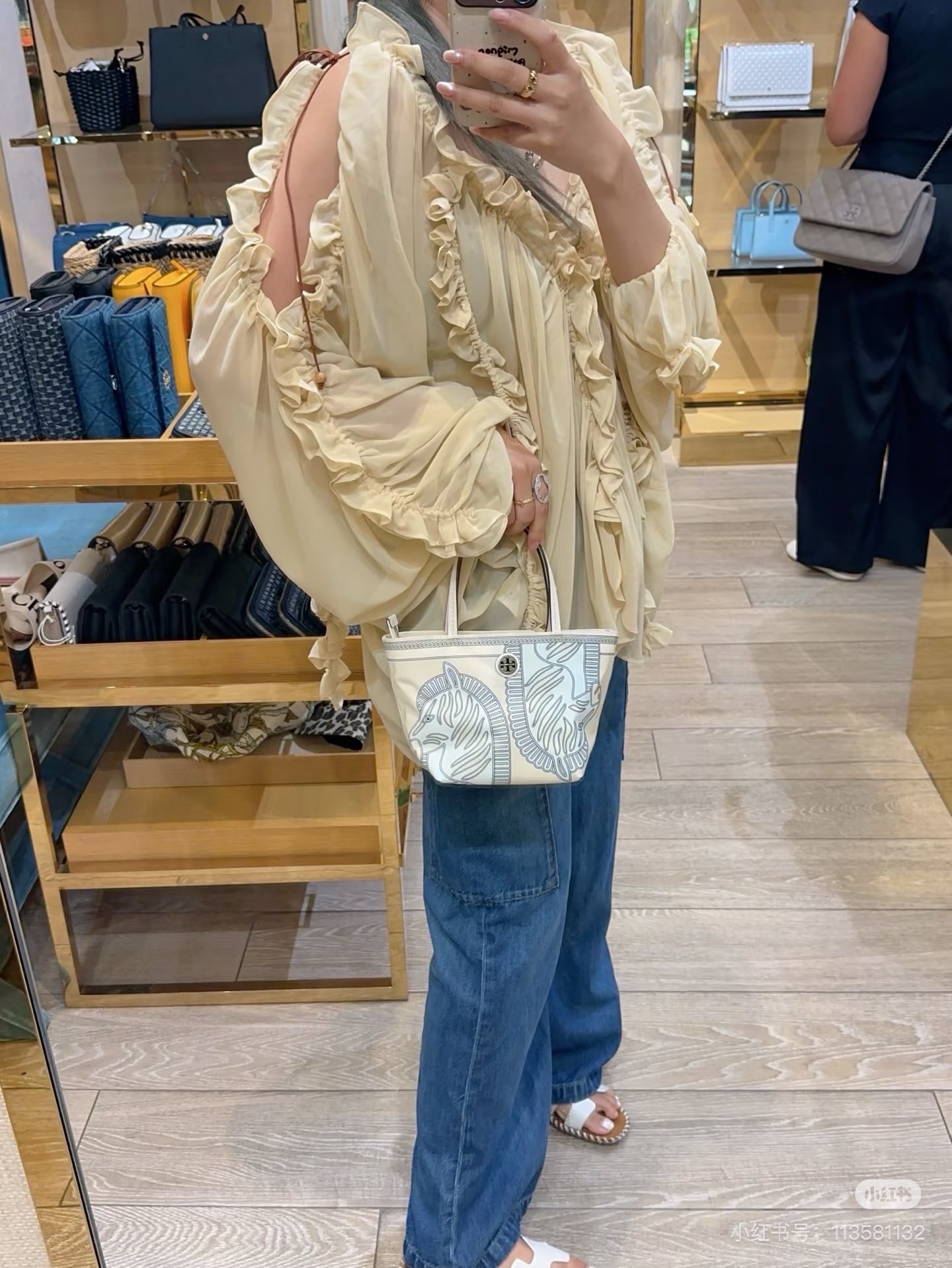 ① 材质:轻量耐造,通勤无负担 包身采用防水耐磨织物,搭配皮革饰边,自重轻到背满物品也不压肩,咖啡渍、灰尘一擦即净,通勤党/宝妈/学生党都能“粗放式使用”。 ② 容量:小身材装下大日常 别看包型秀气,内里空间足够容手机📱 水杯+mini伞+化妆包,内侧还有插袋收纳钥匙、口红,不用再翻包“寻宝”。 ③ 设计:经典双T,细节见质感 标志性双T金属Logo点缀包身,简约不张扬;提手做了柔软包边,手提/肩背都舒适;可拆卸长肩带,切换“手提精致感”或“斜挎松弛感”。4️⃣色都好看!(米白也叫冰川蓝)