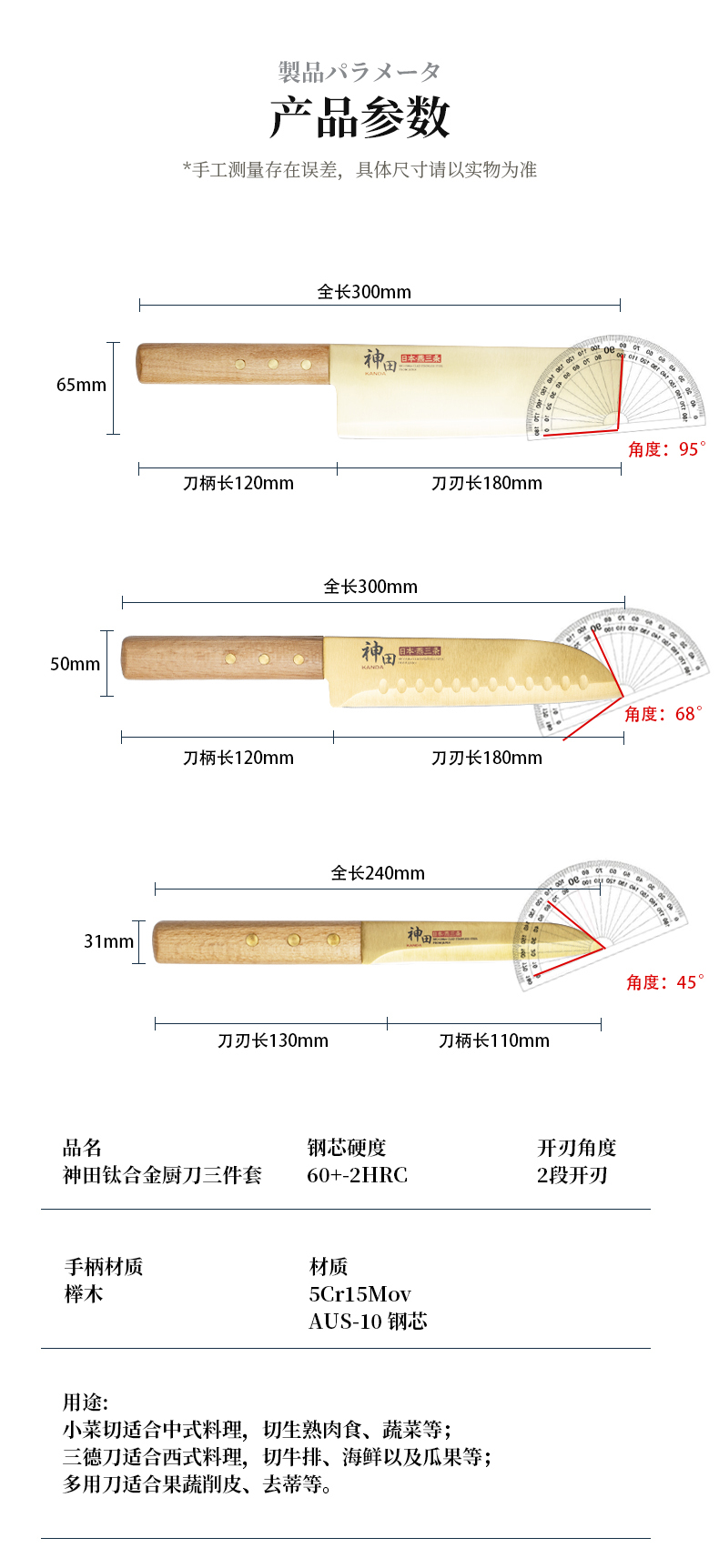 神田 匠系列厨房刀具中华菜刀三德刀多用刀套装三件套