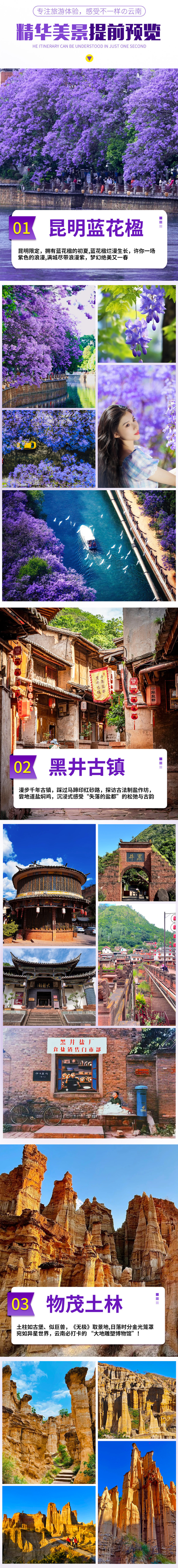 全天昆明市区酒店报道。如果抵达时间早的,可以自行到海埂大坝附近逛逛,那边有云南民族村景区和西山国家风景区,从民族村可以坐索道上去到西山风景区,到风景区龙门可以远眺整个滇池和大片昆明市区,风光很美。还可到翠湖公园附件逛逛陆军讲武堂,翠湖南门也有一些蓝花楹可以欣赏;去南屏步行街品尝当地最特色的汽锅鸡或过桥米线,也可品尝关上野生菌火锅等特色美食;春城路和宝海公园等其它昆明10余处,也满是“蓝紫色”的身影,处处是它尽显绰约风姿的舞台。酒店可全天办理入住手续哦。