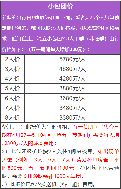 5.【单人房差】平常800元/人,第3期1000元/人,五一节1100元/人(行程住宿按照双人标准间安排,单人报名拼房不成,单房差由我司承担,如队员个人要求单住则需补齐房差!)