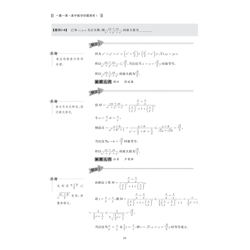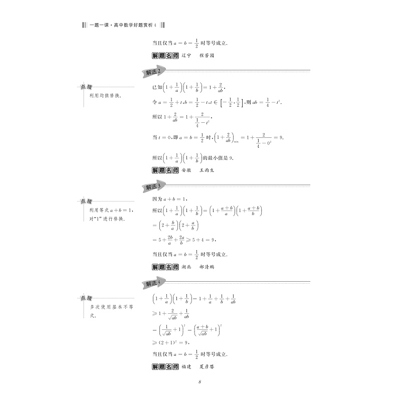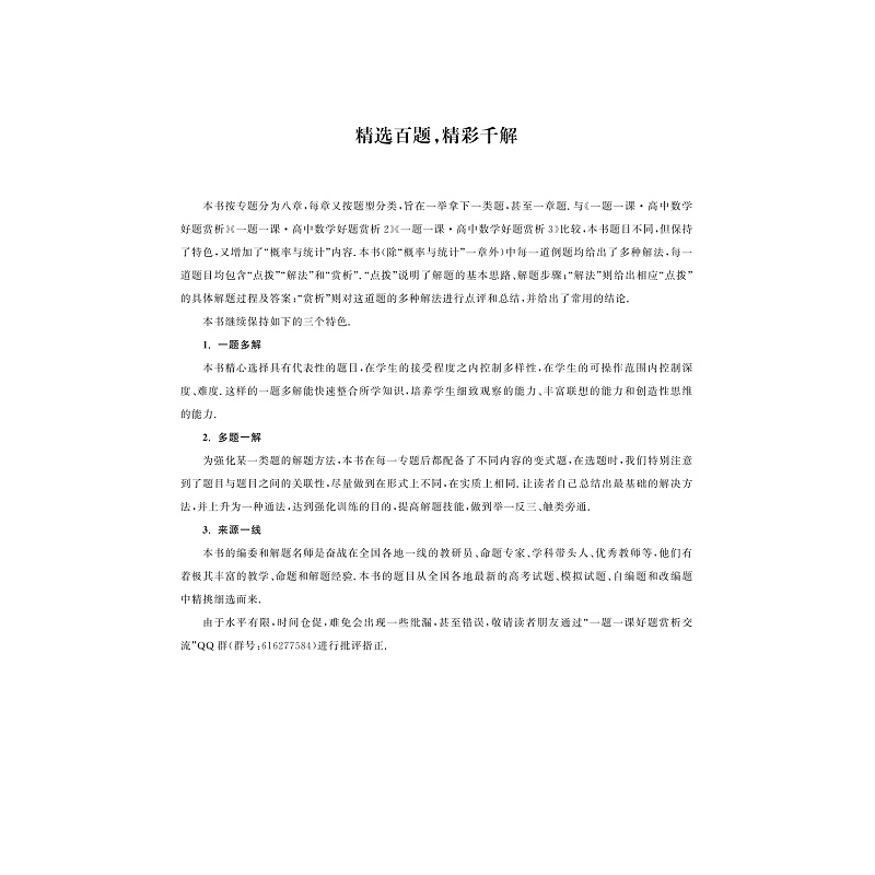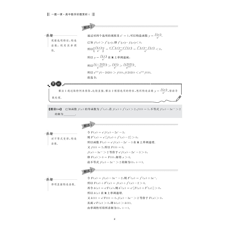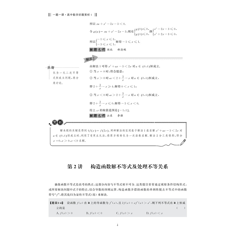 《高中数学好题赏析4》是继《高中数学好题赏析》《高中数学好题赏析2》《高中数学好题赏析3》后一本全新的、来源于教学实践的解题指导类图书。书中每一道例题均给出了多种解法(每一种解法均包含“点拨”)及 “赏析”。“点拨”说明这种解法的基本思路、解题步骤,“详细解答”则给出解题的具体过程及答案,“赏析”对该道题的多种解法进行点评。