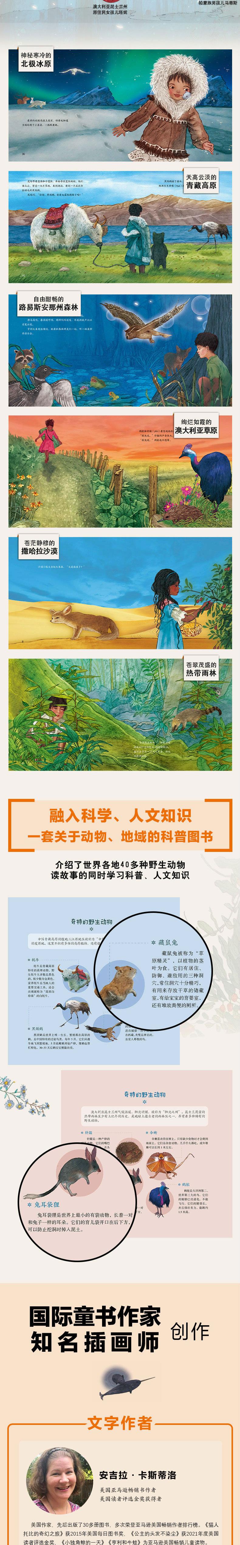 介绍了40多种野生动物,每个动物都有其独特之处,读故事的同时学习科普、人文知识。故事涉及6个地域、6个不同种族,展示世界的多元化和大自然的多样性。