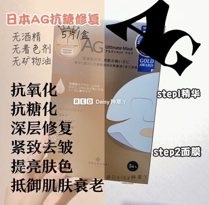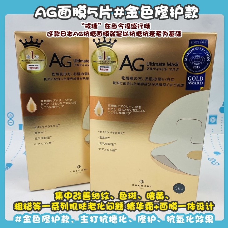 AG面膜5片#金色修护款 👍“戒糖”在当今很盛行哦🔥,这款日本AG抗糖面膜就是以抗糖抗衰老为基础👊,集中改善细纹、色斑、暗黄、粗糙等一系列肌肤老化问题💆,精华霜+面膜一体设计。💛#金色修护款,主打抗糖化、修护、抗氧化效果。特别添加含有丰富DNA和维生素E的深海鱼肝油🐠,能抗衰老紧致提亮肤色✨,胎盘素精华的加入,还可以促进肌肤新陈代谢。💁适合暗沉肌肤、毛孔粗大、痘痘肌和需要抗衰的宝宝们!