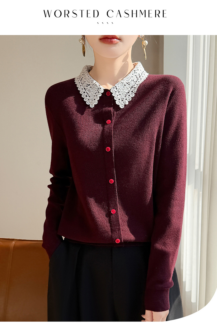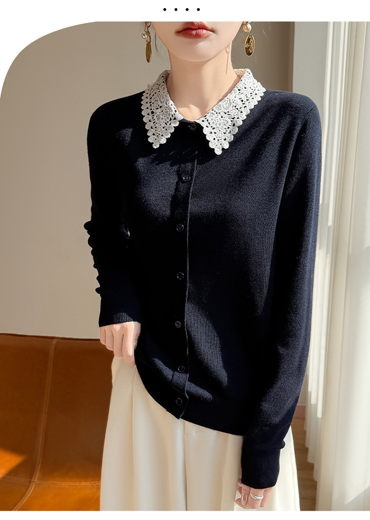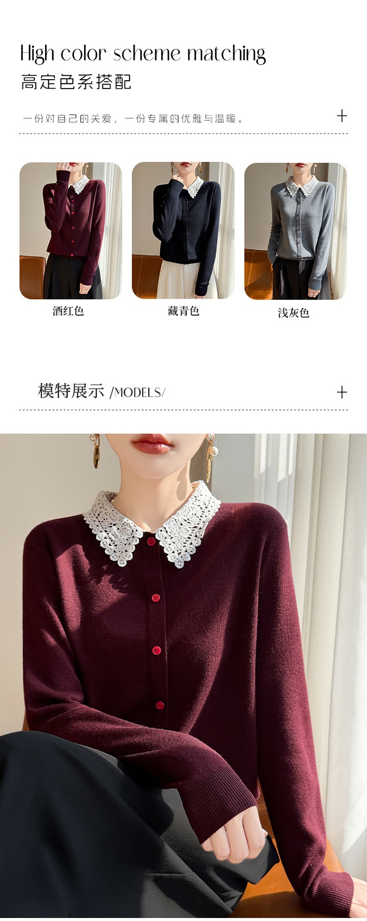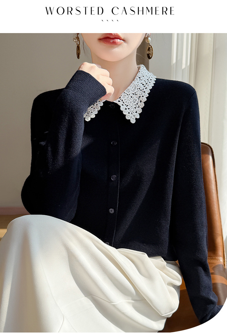 「自」全新升级【铂金会员220/天猫289/差价69】(03727)洛诗琳撞色拼接镂空翻领开衫2025秋冬精纺羊毛修身针织外套