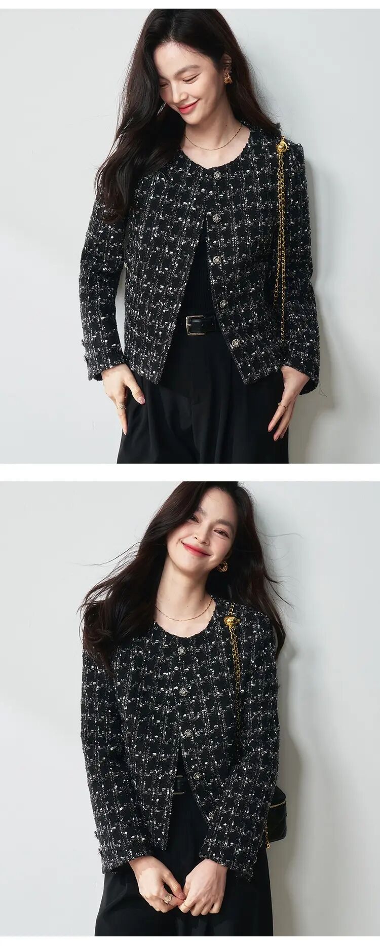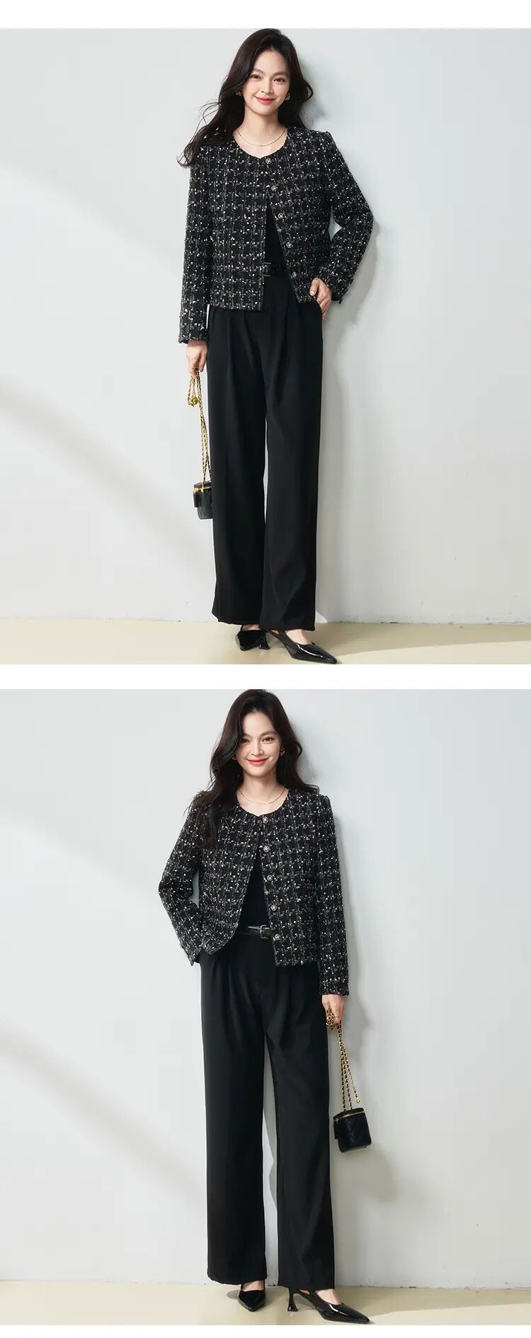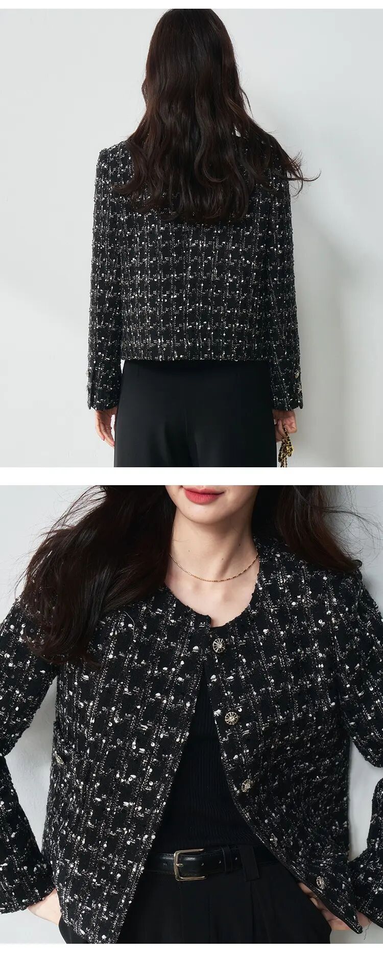【高货sh】全新升级【铂金会员349/天猫469/差价120】(05436) 洛诗琳25春法式亮片格纹小香风外套黑色显瘦百搭上衣