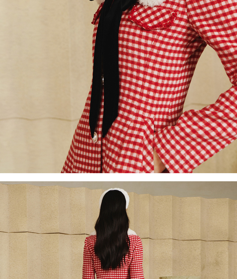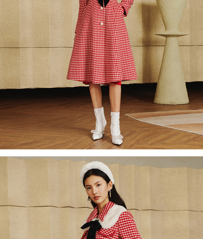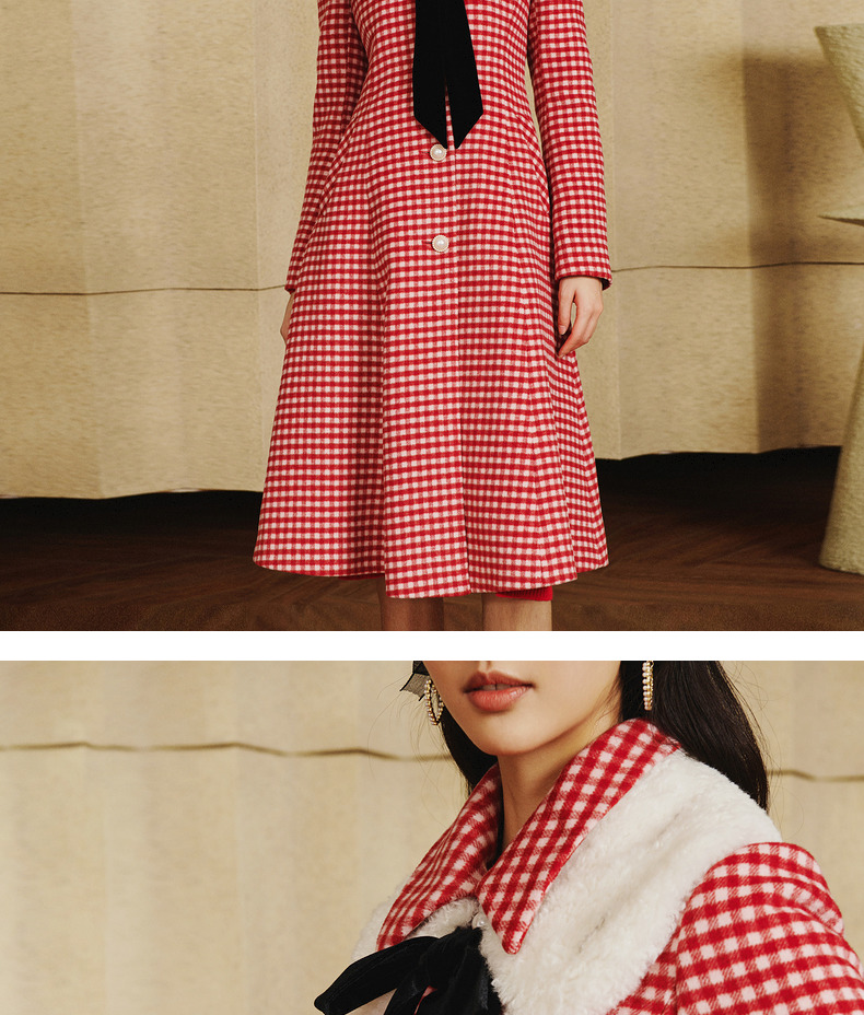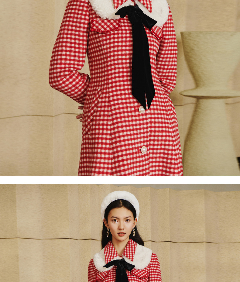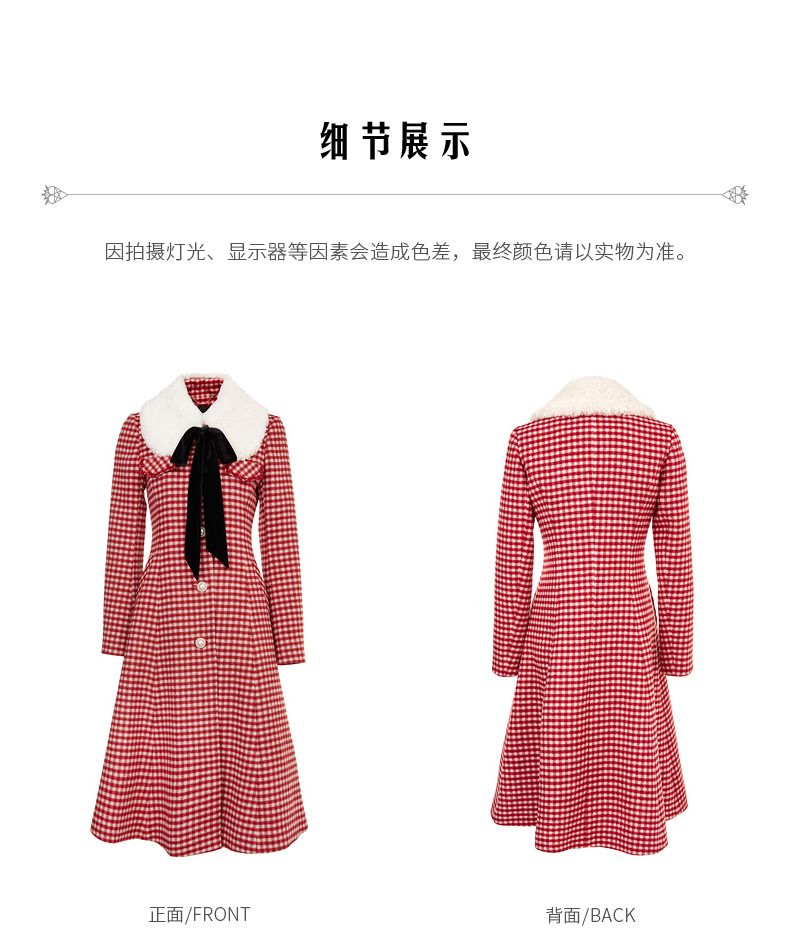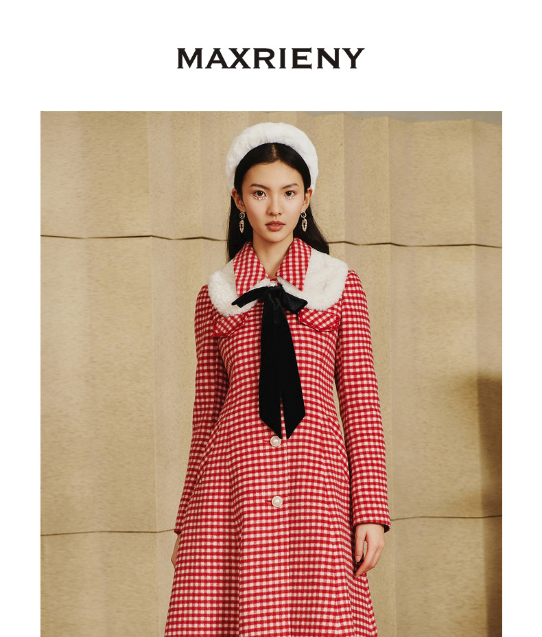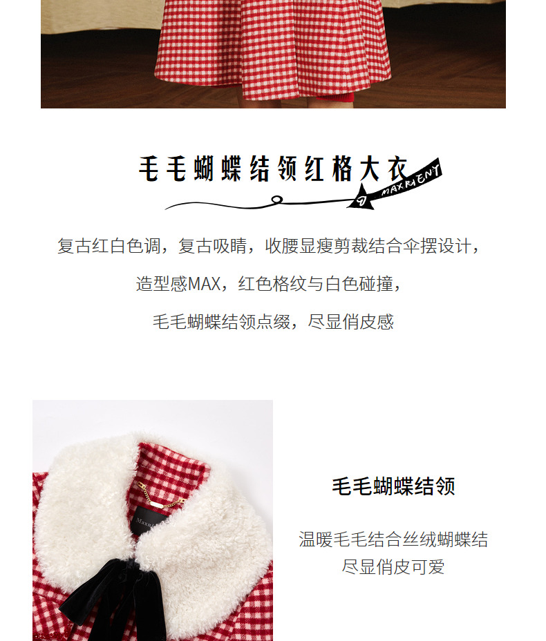 MAXRIENY红白格纹大衣蝴蝶结毛翻领风衣毛呢外套(货号:MC87CT783)