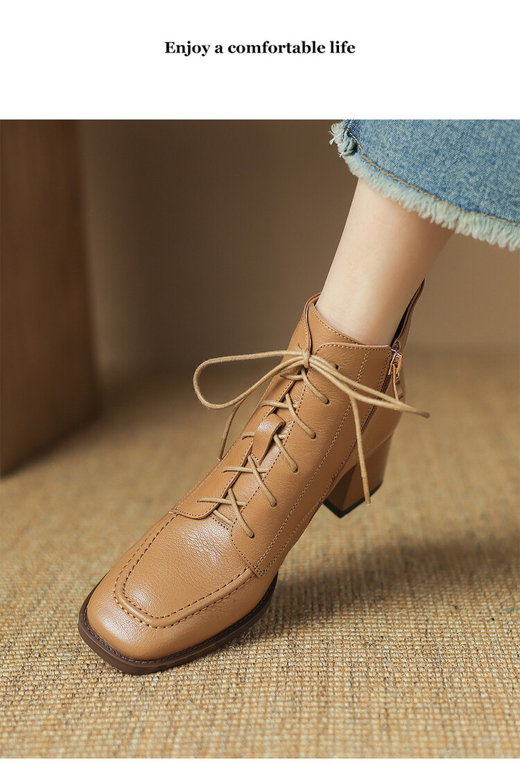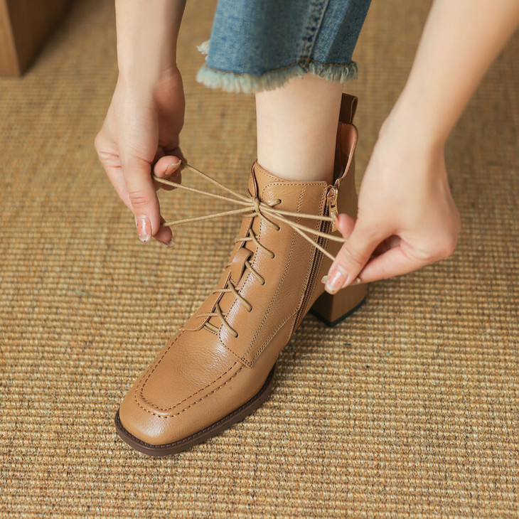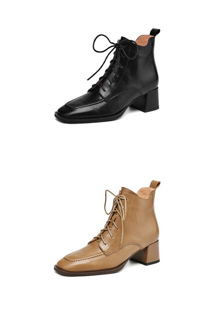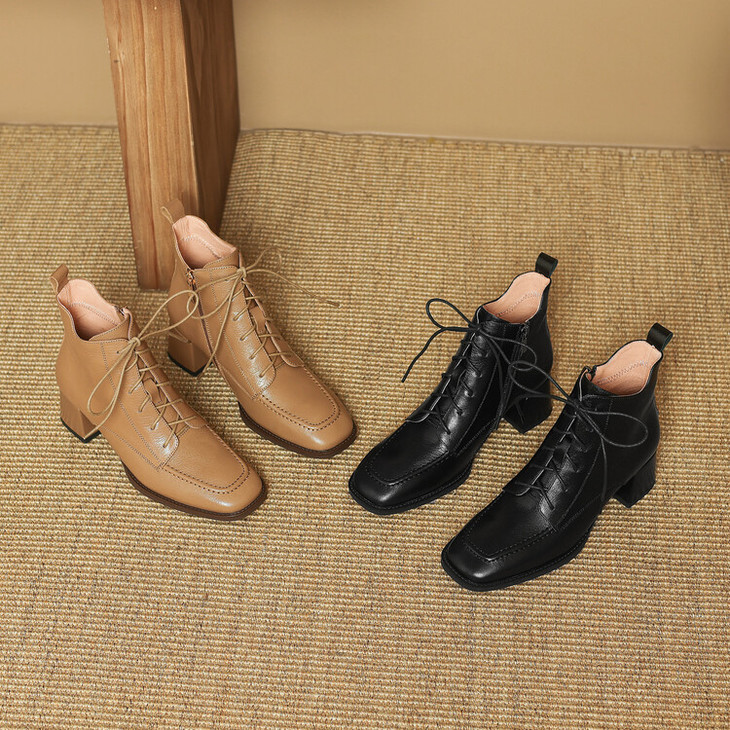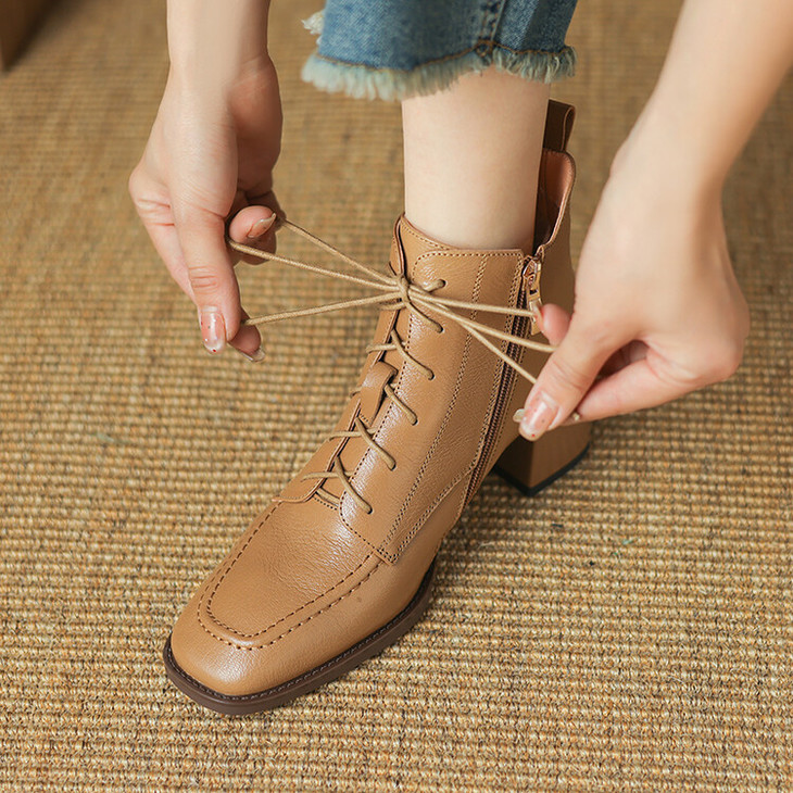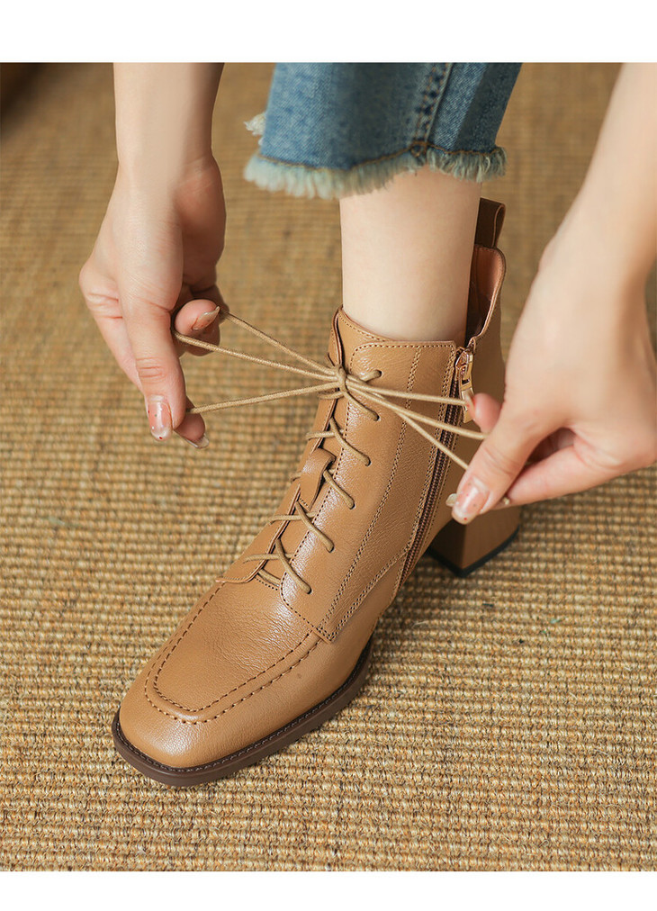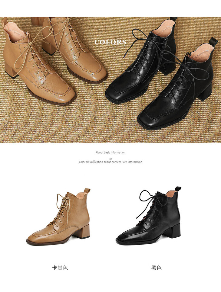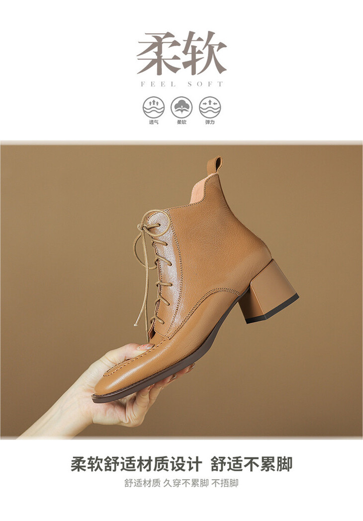 【预售5天】复古真皮系带马丁靴女英伦风短筒方头粗跟黑色卡其色高跟气质短靴女LD&6954