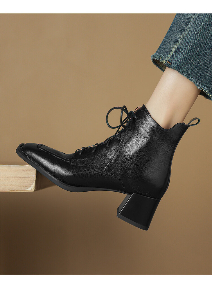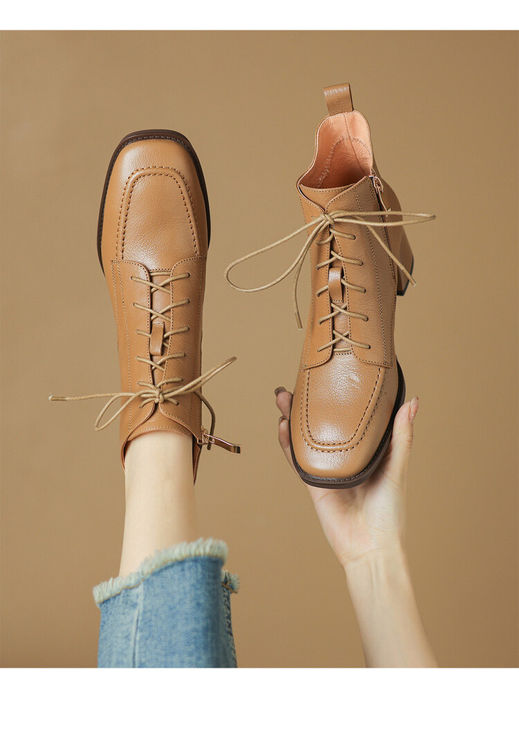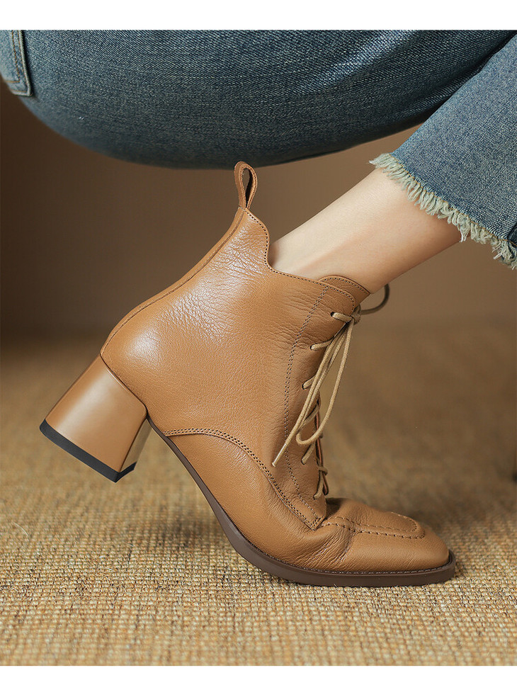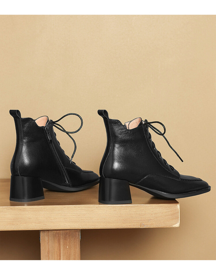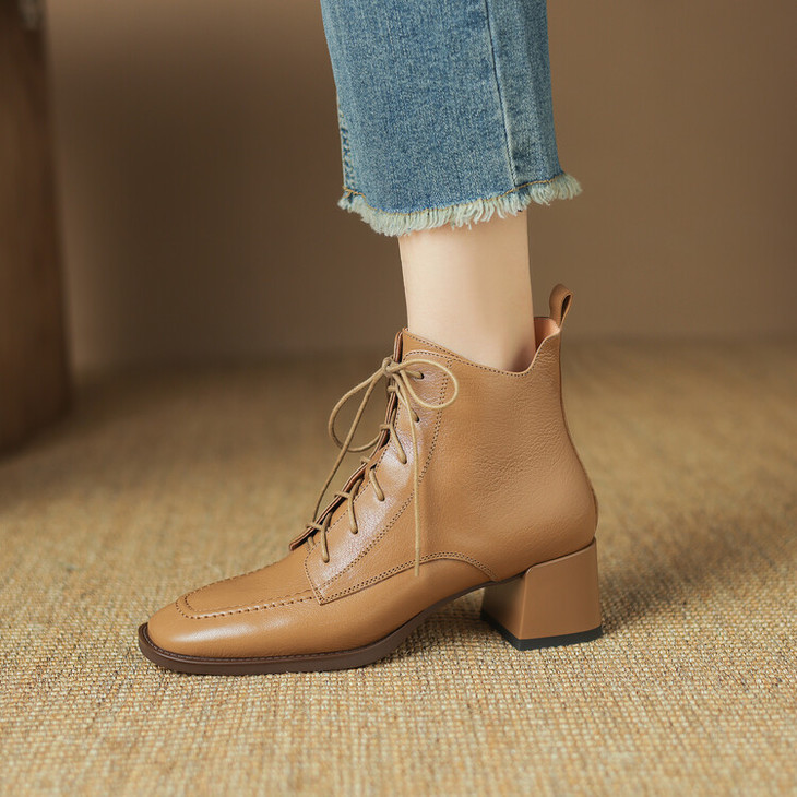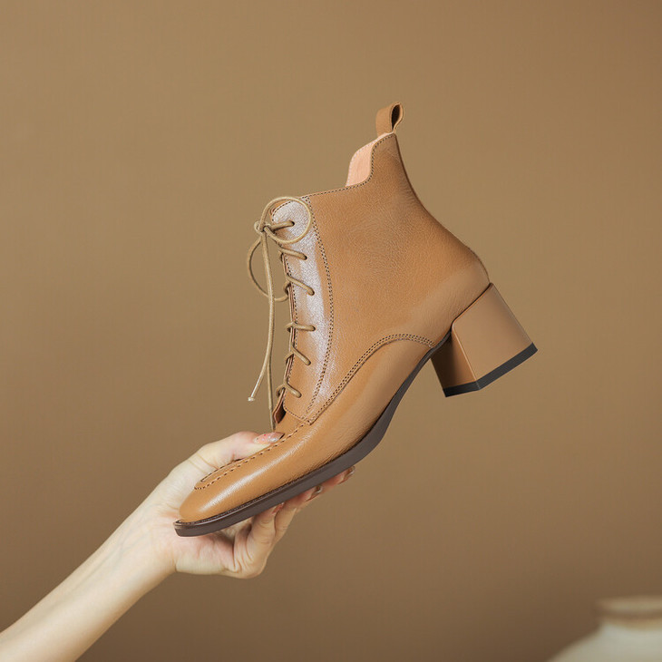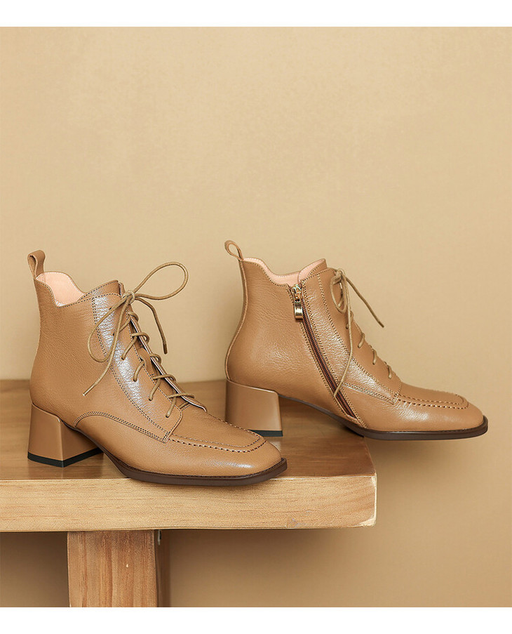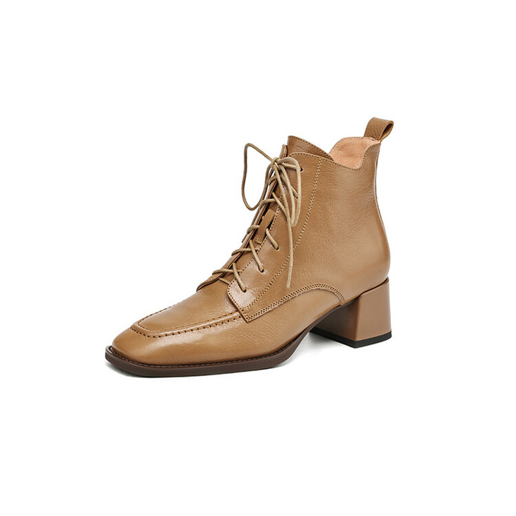 【预售5天】复古真皮系带马丁靴女英伦风短筒方头粗跟黑色卡其色高跟气质短靴女LD&6954