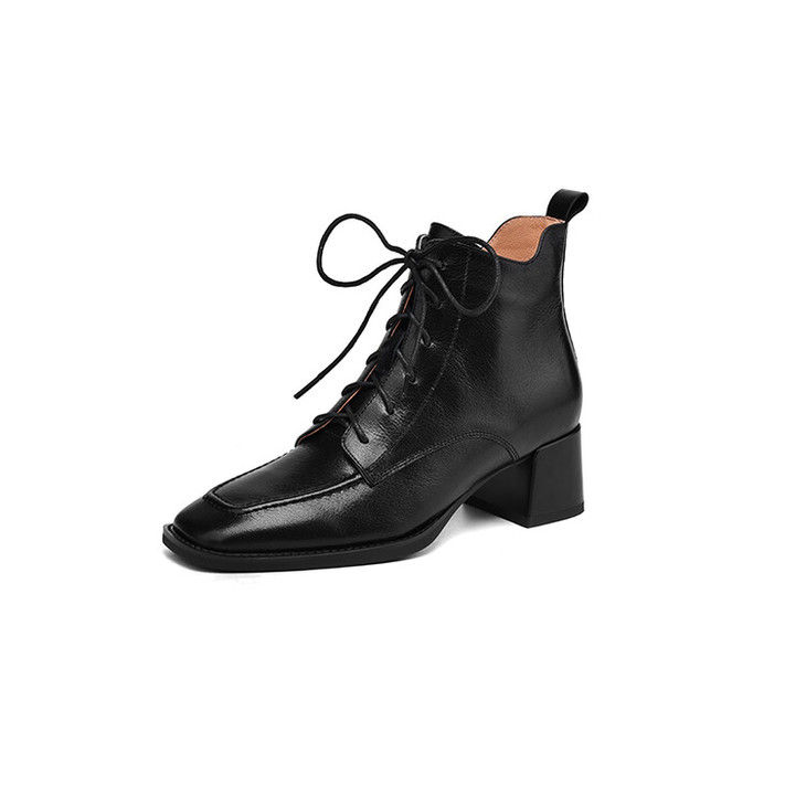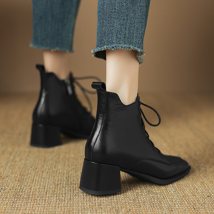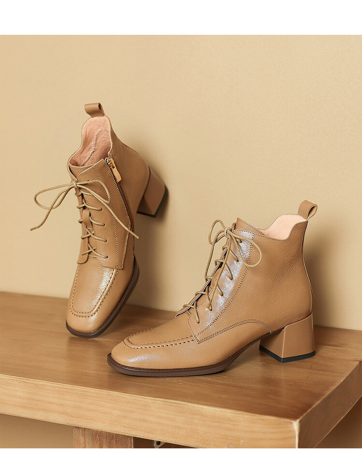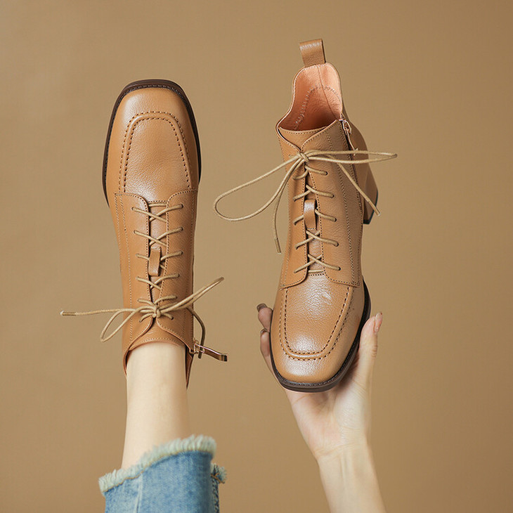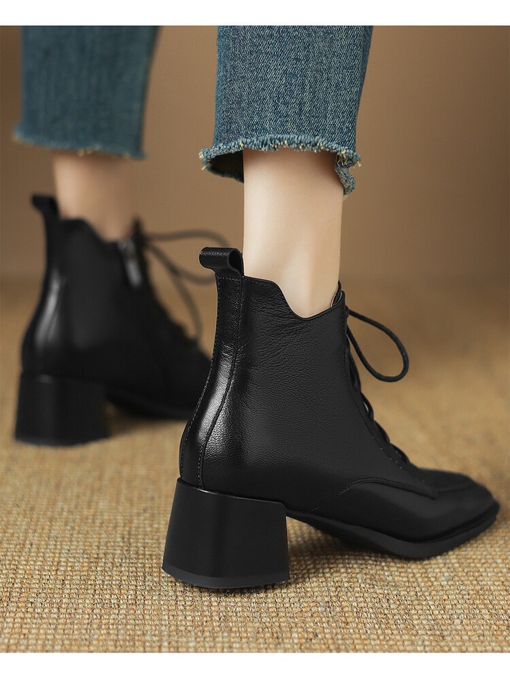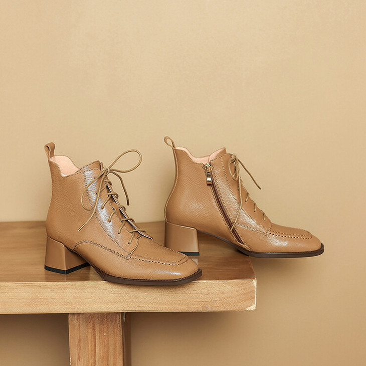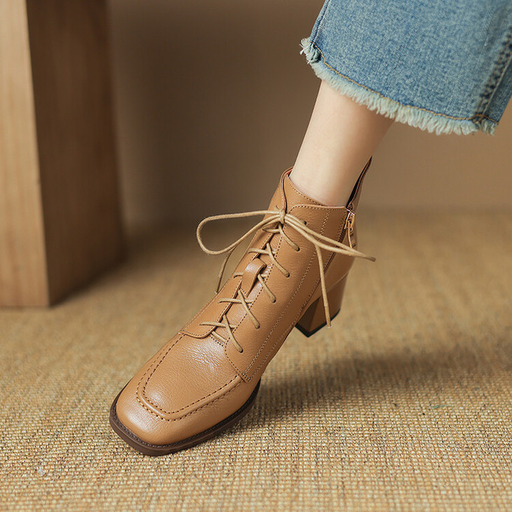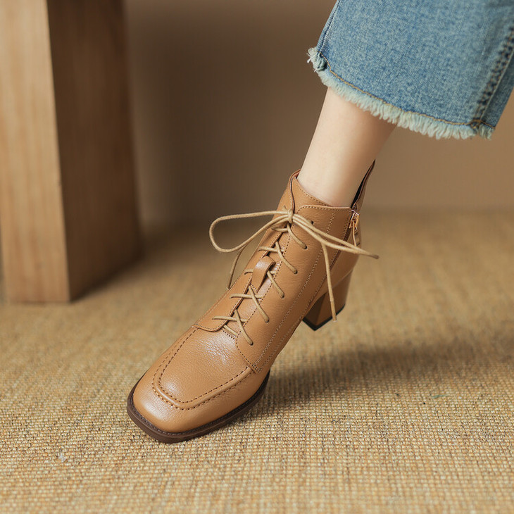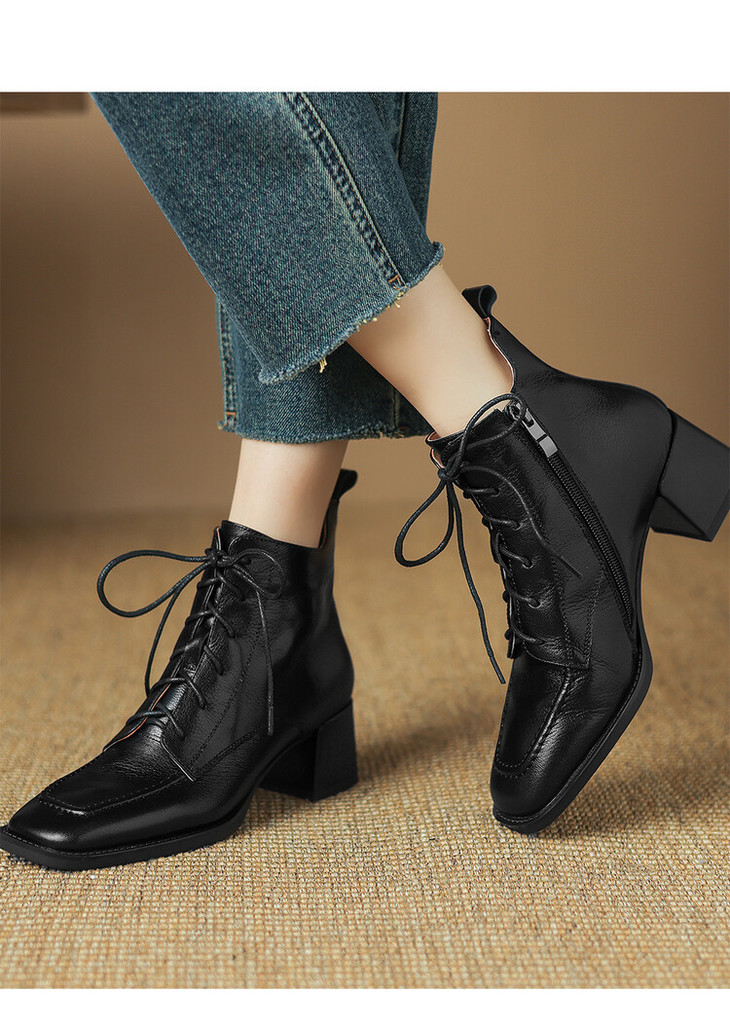 【预售5天】复古真皮系带马丁靴女英伦风短筒方头粗跟黑色卡其色高跟气质短靴女LD&6954