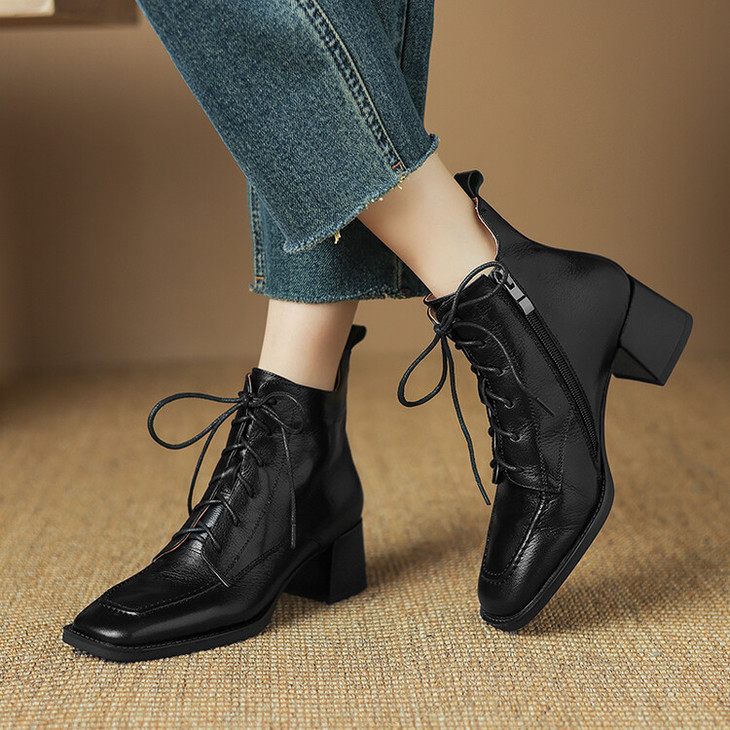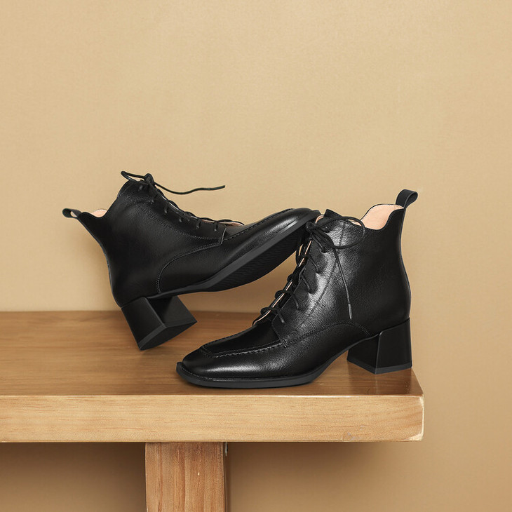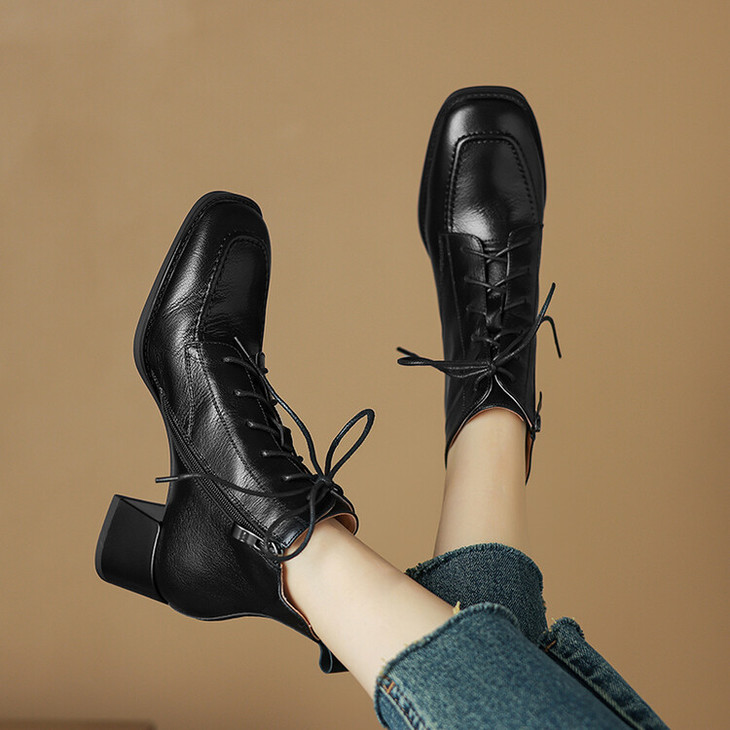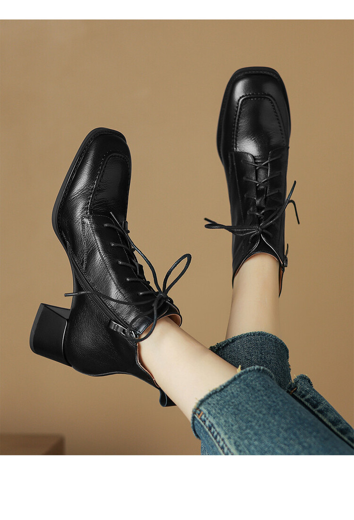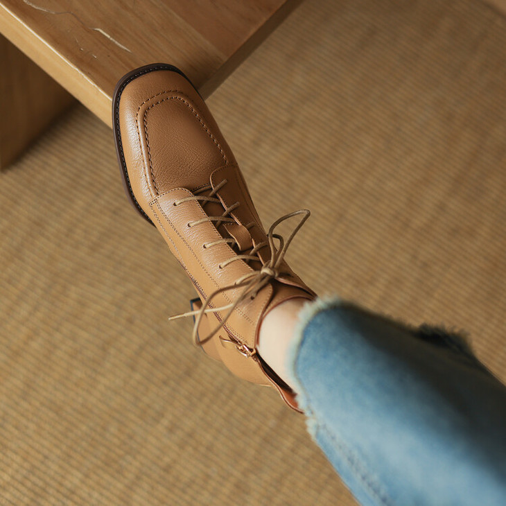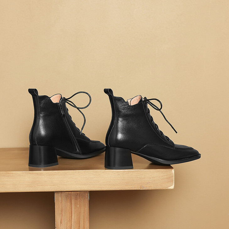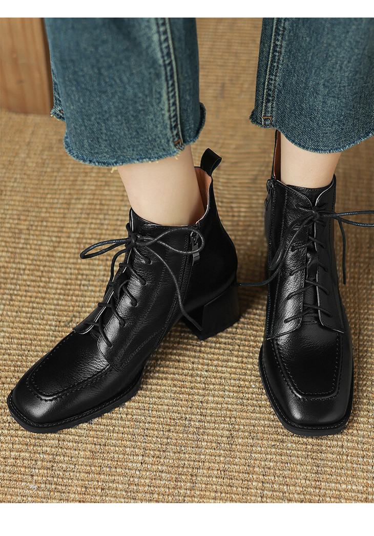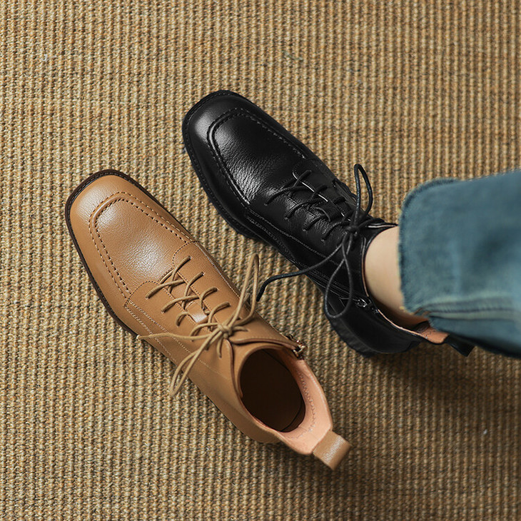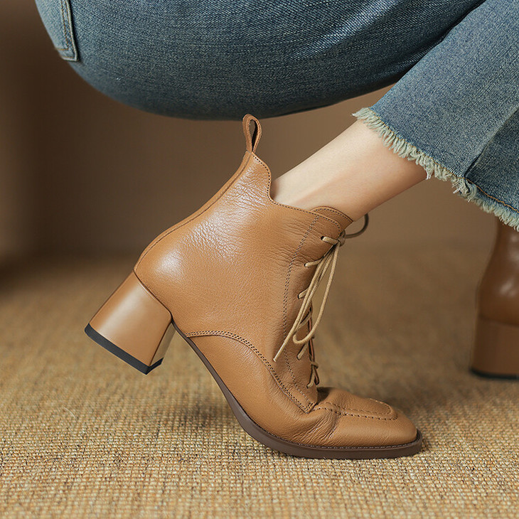 【预售5天】复古真皮系带马丁靴女英伦风短筒方头粗跟黑色卡其色高跟气质短靴女LD&6954