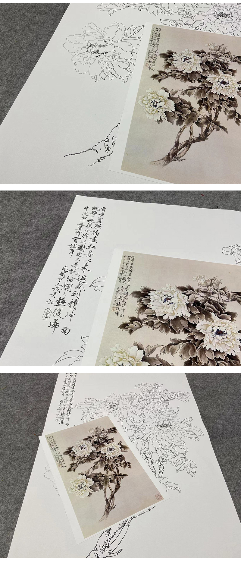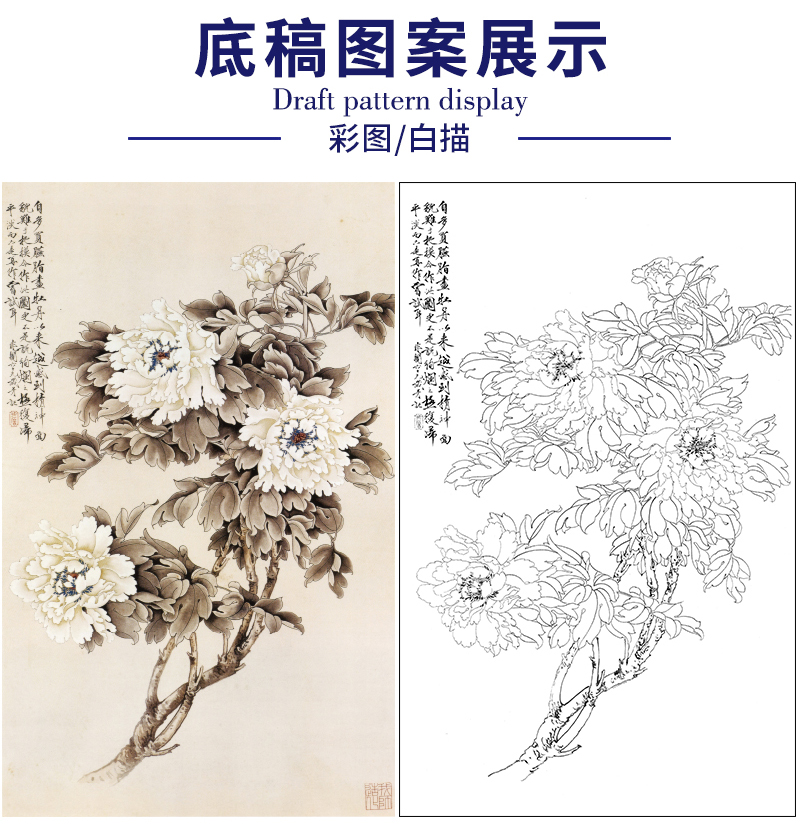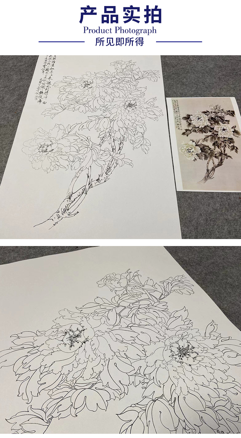 龚雪青横幅工笔花鸟白描底稿-牡丹鲤鱼《富贵有余》-多种白描尺寸可选-XQ67