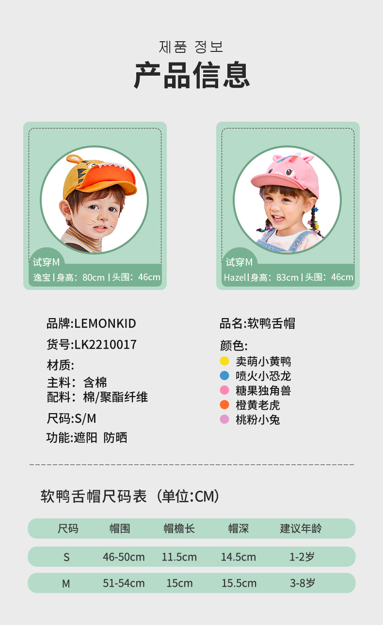 lemonkid柠檬宝宝婴儿帽子春秋款儿童鸭舌帽男童宝宝帽子春秋棒球帽女童虎头帽男孩