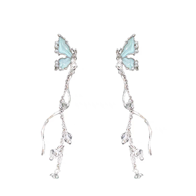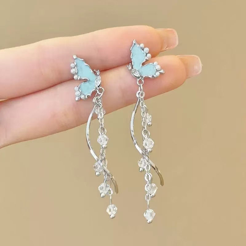 JU-122蓝色蝴蝶流苏长款珍珠耳环女2024新款小众设计感气质耳钉爆款耳饰
