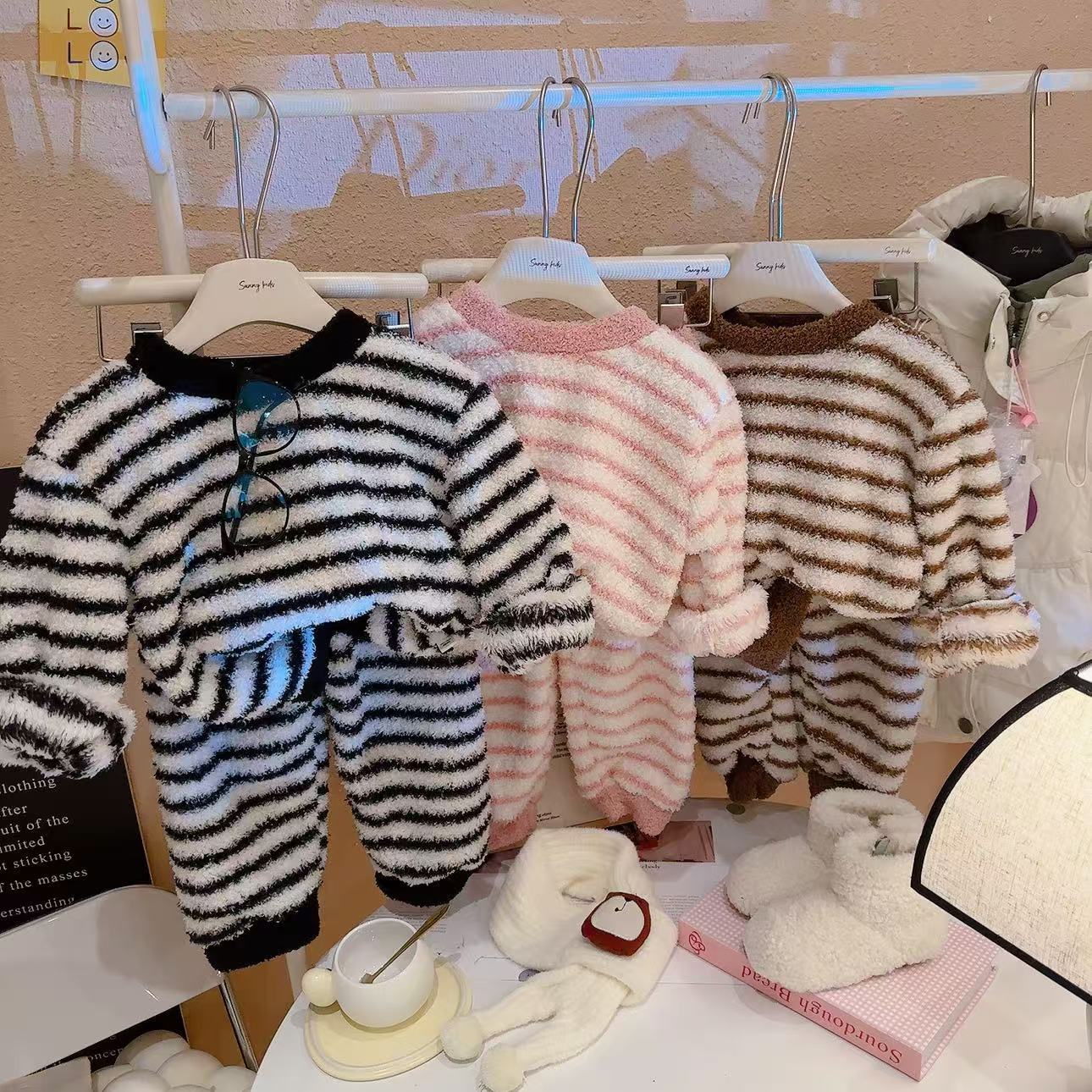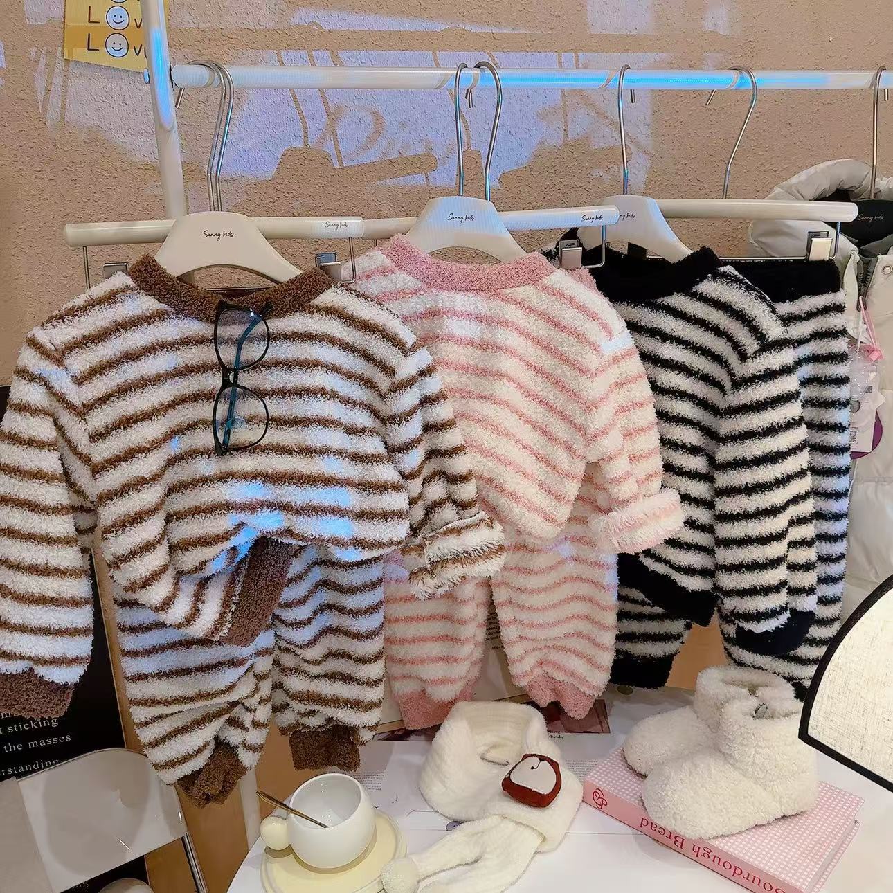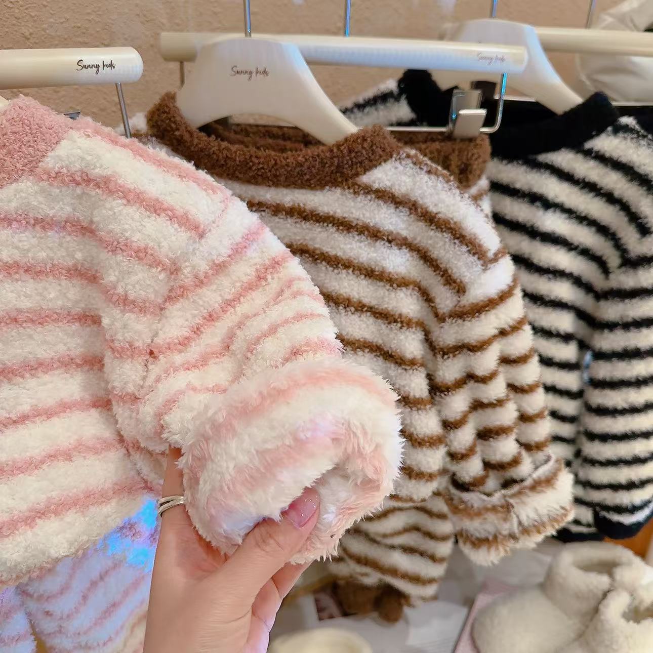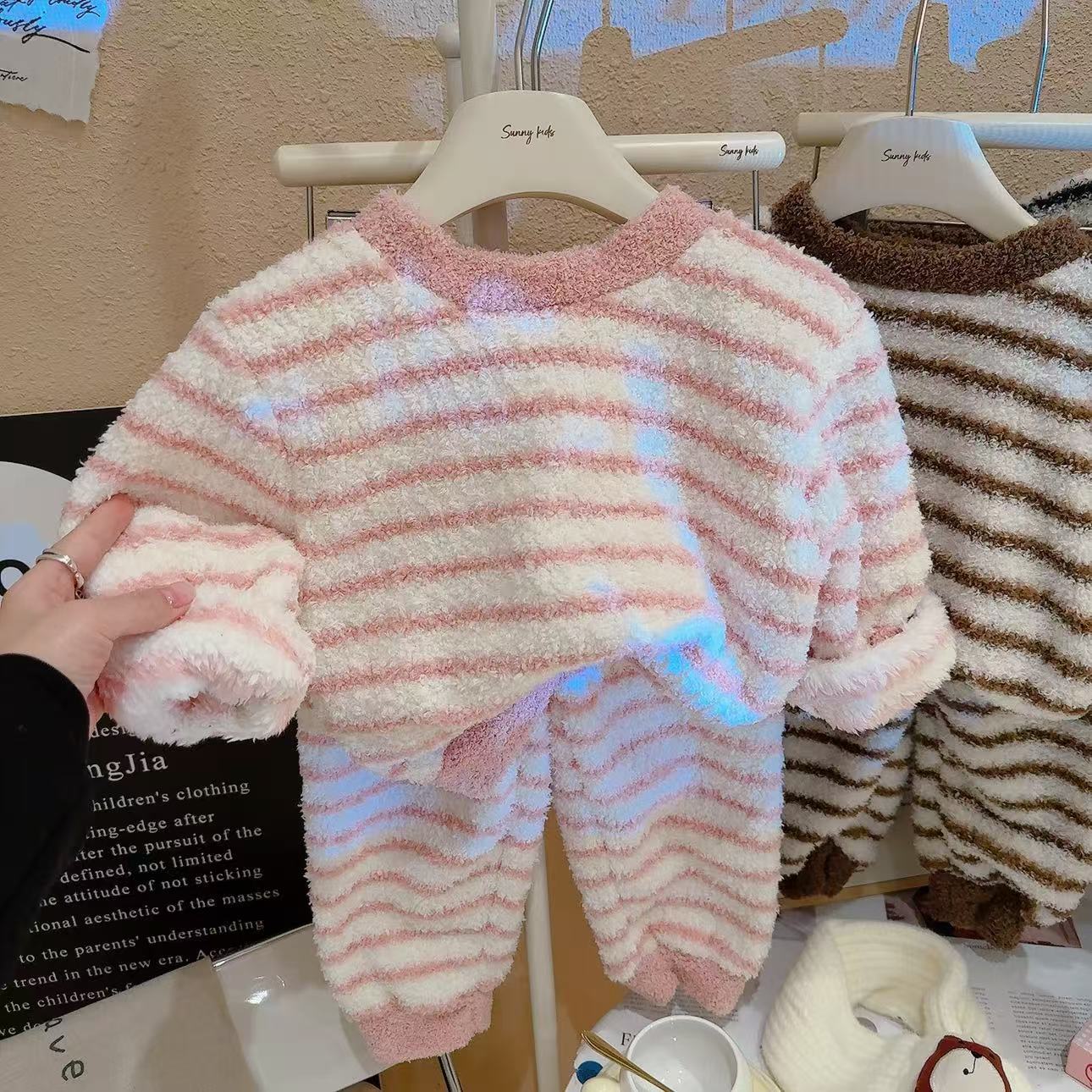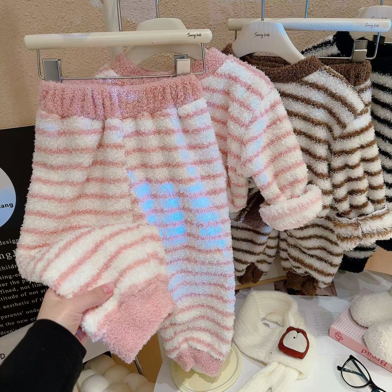 轻·软·萌·暖【品质云朵绒,细腻不掉毛,软糯舒服】儿童双面绒套装秋冬季宝宝毛绒亲子家居服两件套男女童条纹睡衣zb