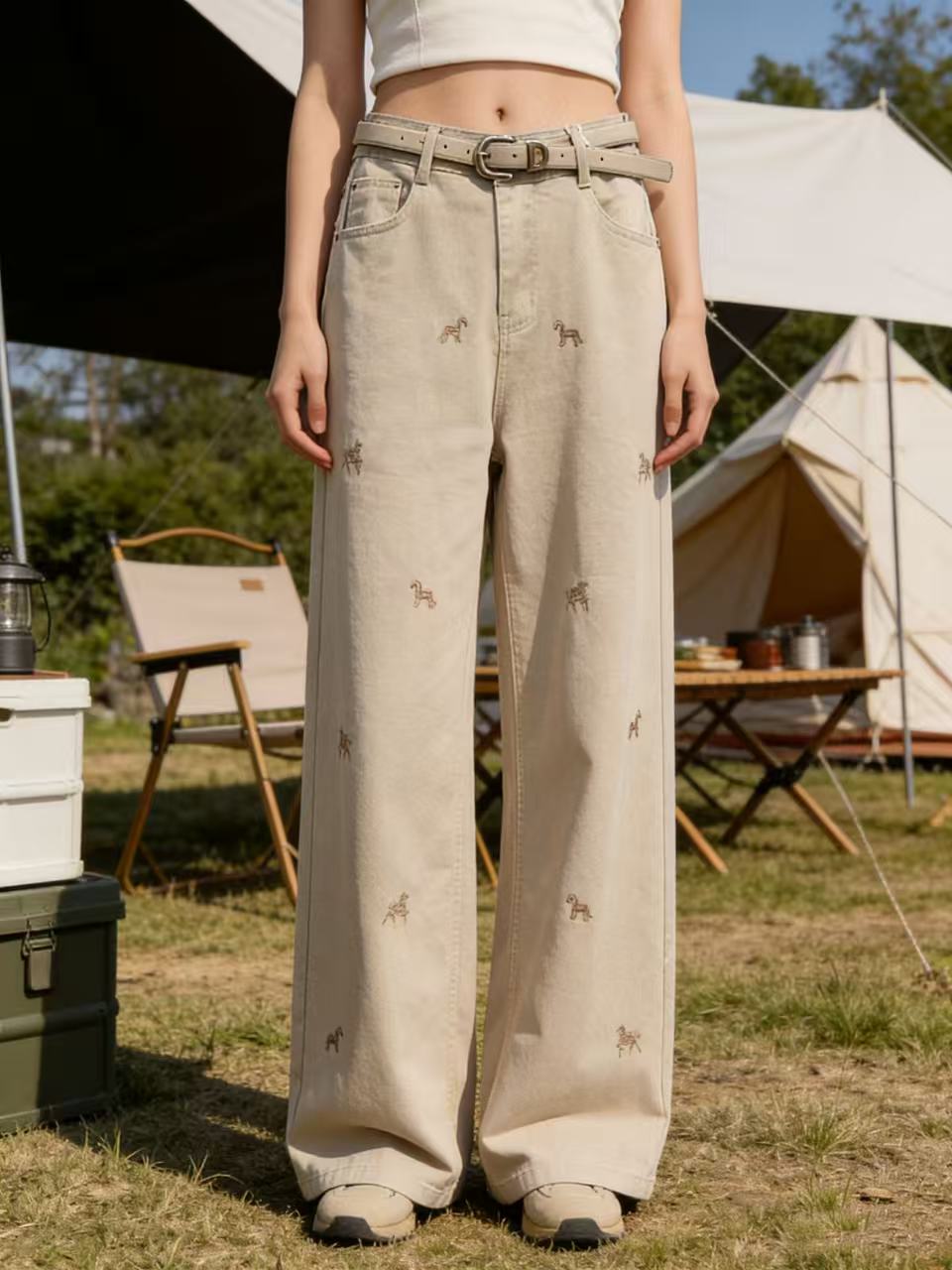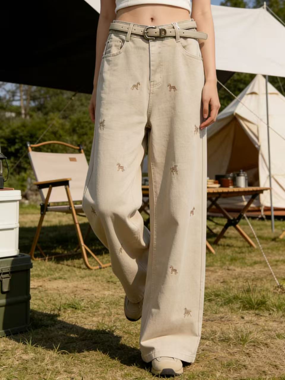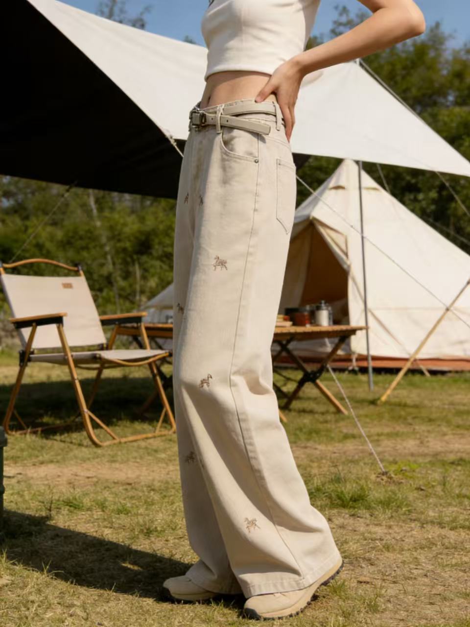 爆款刺绣马【自营】8666美式复古设计感小马刺绣牛仔裤高腰宽松垂感显瘦阔腿直筒裤-喜出