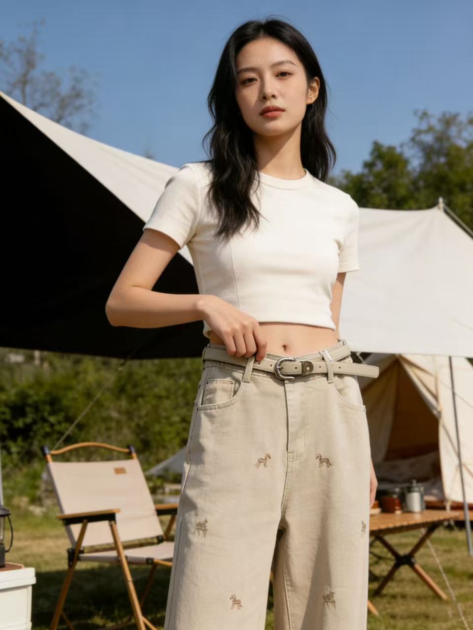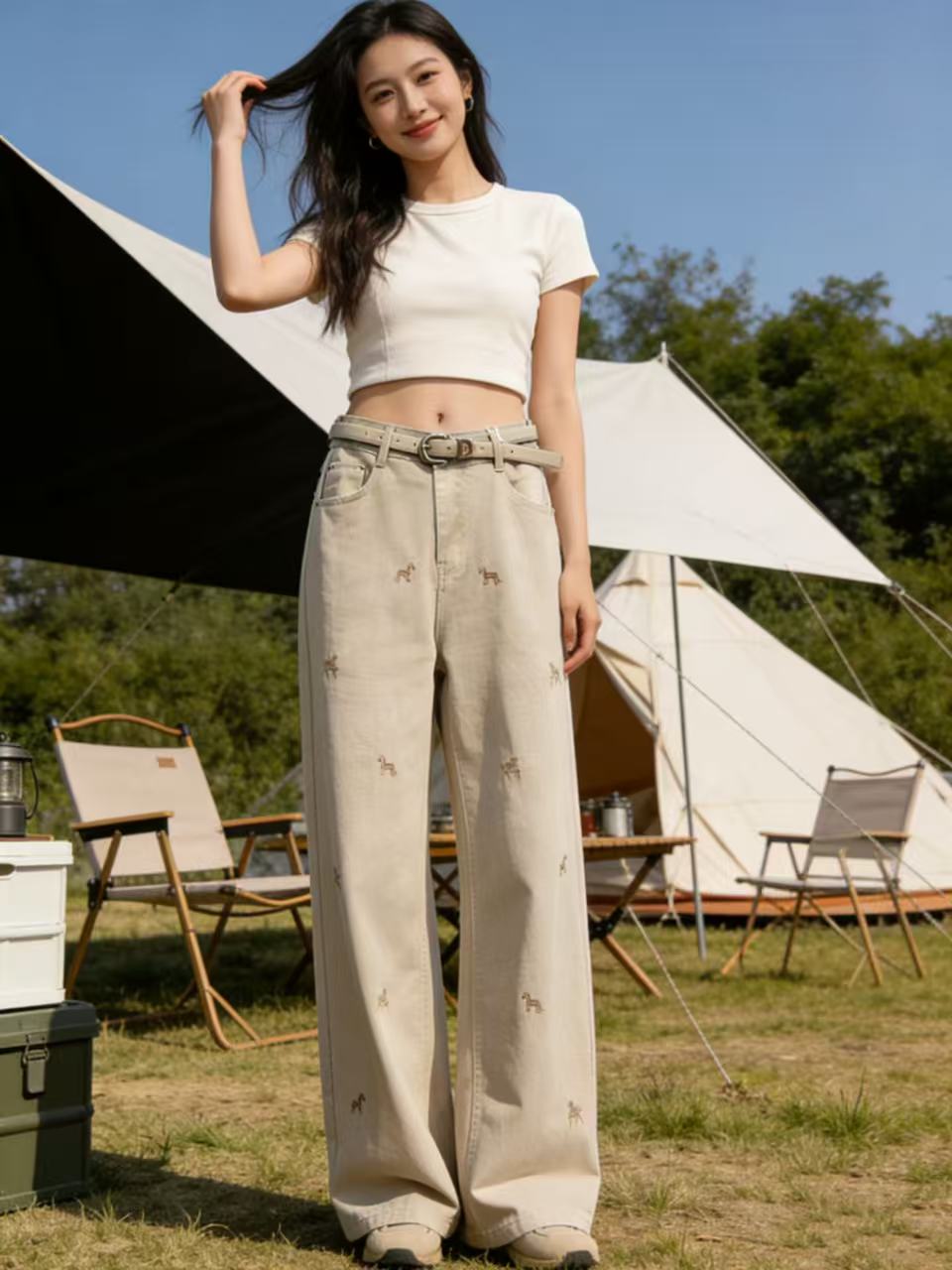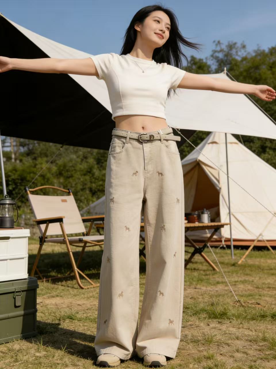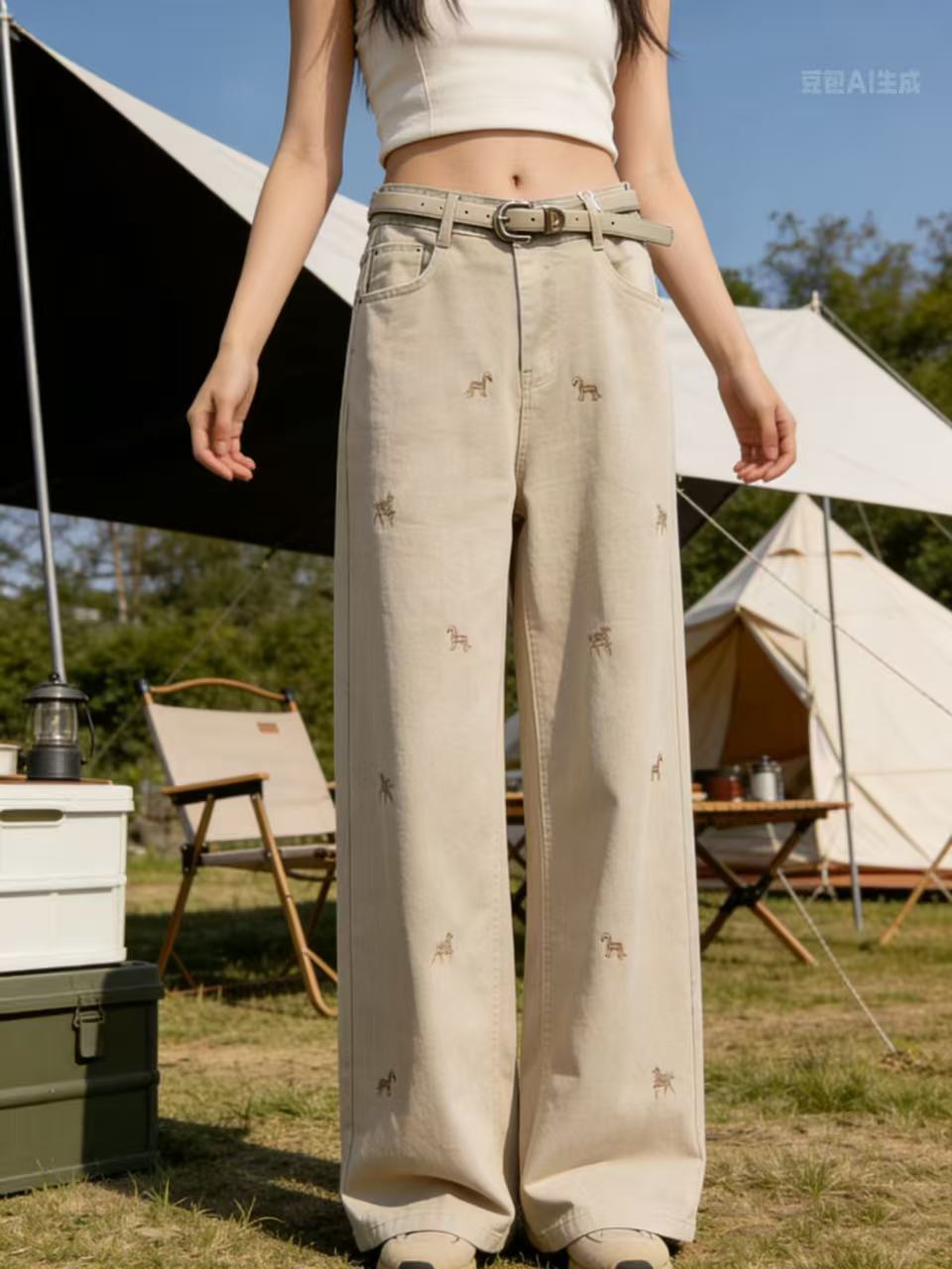 爆款刺绣马【自营】8666美式复古设计感小马刺绣牛仔裤高腰宽松垂感显瘦阔腿直筒裤-喜出