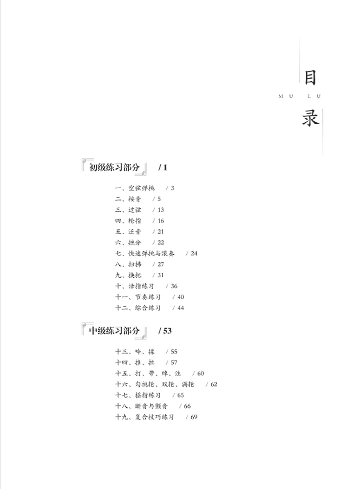 本书遵循由浅入深、循序渐进的原则,分为初级练习和中级练习两个部分,共十九个板块,以各技术项目之间的难易程度作为排列先后顺序的依据,如:从最简单的右手空弦弹挑练习开始,经过各把位的按音练习到音阶琶音练习;从各种常用的技巧、指法练习直至较为复杂和难度较大的过弦、换把及综合练习。考虑到每个部分练习内容自身的独立性和完整性,有时前部分后面的练习比后部分前面的练习技术难度更大些,读者可根据具体情况灵活选用,也可结合其他同等程度的练习曲或乐曲进行穿插练习。 为了提高琵琶学习者的兴趣,我们精心挑选了各类乐曲,意在让初学者接触不同的音乐风格。书中除创作的练习曲外,还加工改编了数首刘德海大师创作的经典练习曲,以及一些由他订谱、订指法的脍炙人口的小乐曲。 |