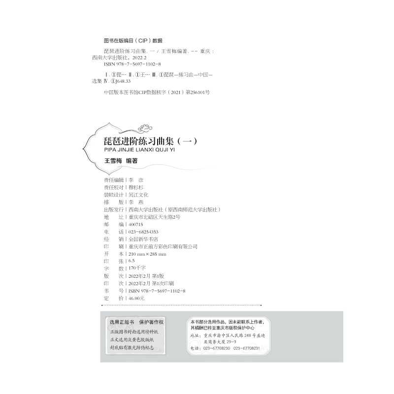 *书名:琵琶进阶练习曲集(一) | *ISBN:978-7-5697-1102-8 |