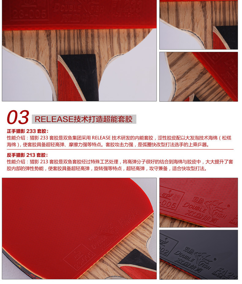 配置:正面猎影FL233内能反胶套胶,反面猎影FA213内能反胶套胶