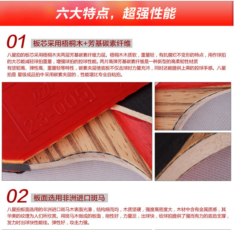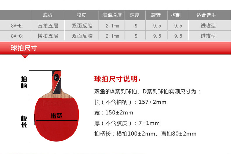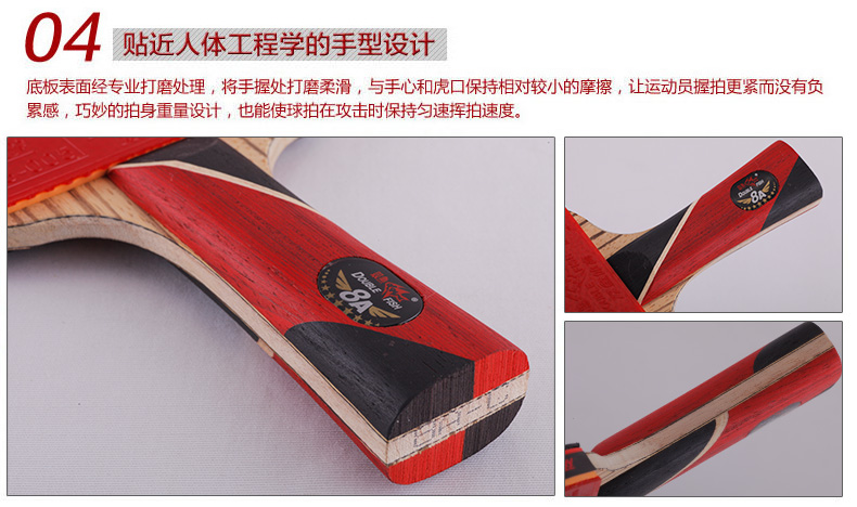 简介:适合进攻性弧圈快攻型打法,性能均衡,柔中带刚,吃球稳,速度快。