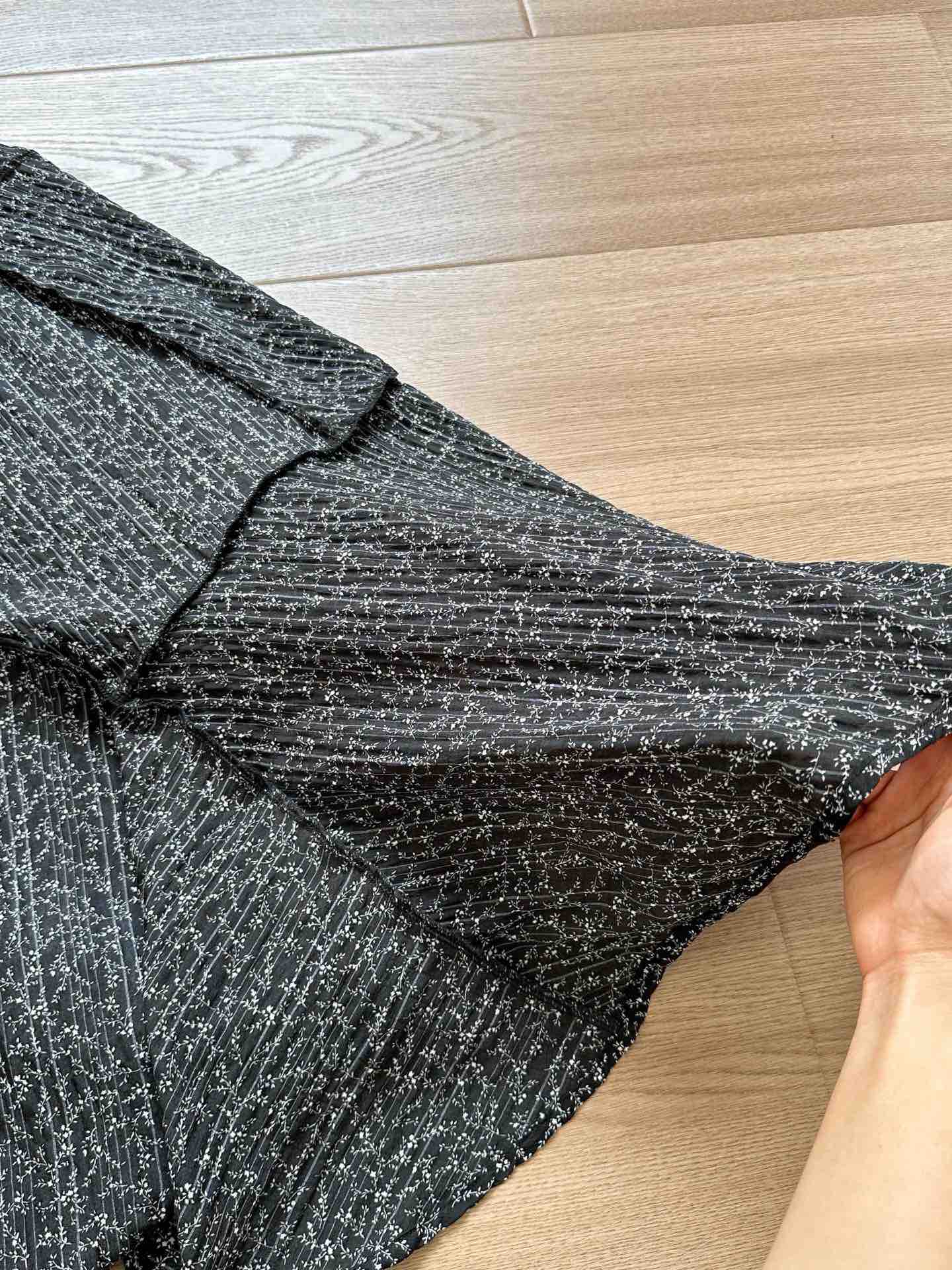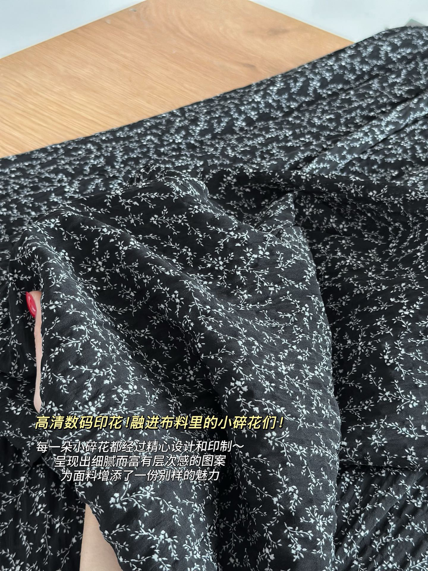 客供100%聚酯纤维碎花印花面料,这个料子开发成本比较高 表面全部是有肌理压纹的 经过高温定型 本身质感非常出色!而且这种面料的优点就是会加垂坠 具有立体感!