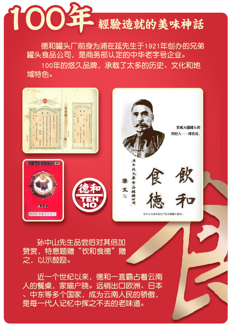 昆明德和罐头厂是中国最早开始生产制造罐头的企业之一,至今已有九十八年的悠久历史,现已形成以罐头食品为主,腌腊制品、糕点月饼等为辅的云南省规模最大和最具影响力综合食品制造企业,奠定了云南罐头行业的基石。