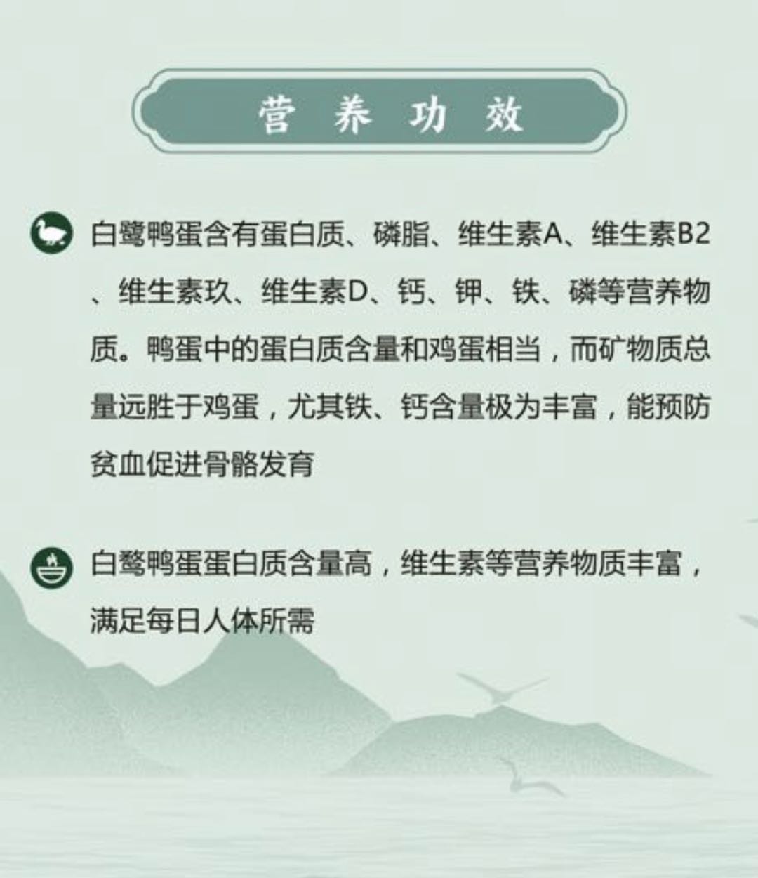 白鹭鸭蛋适用于男、女、老、少、孕、弱等各种人群。