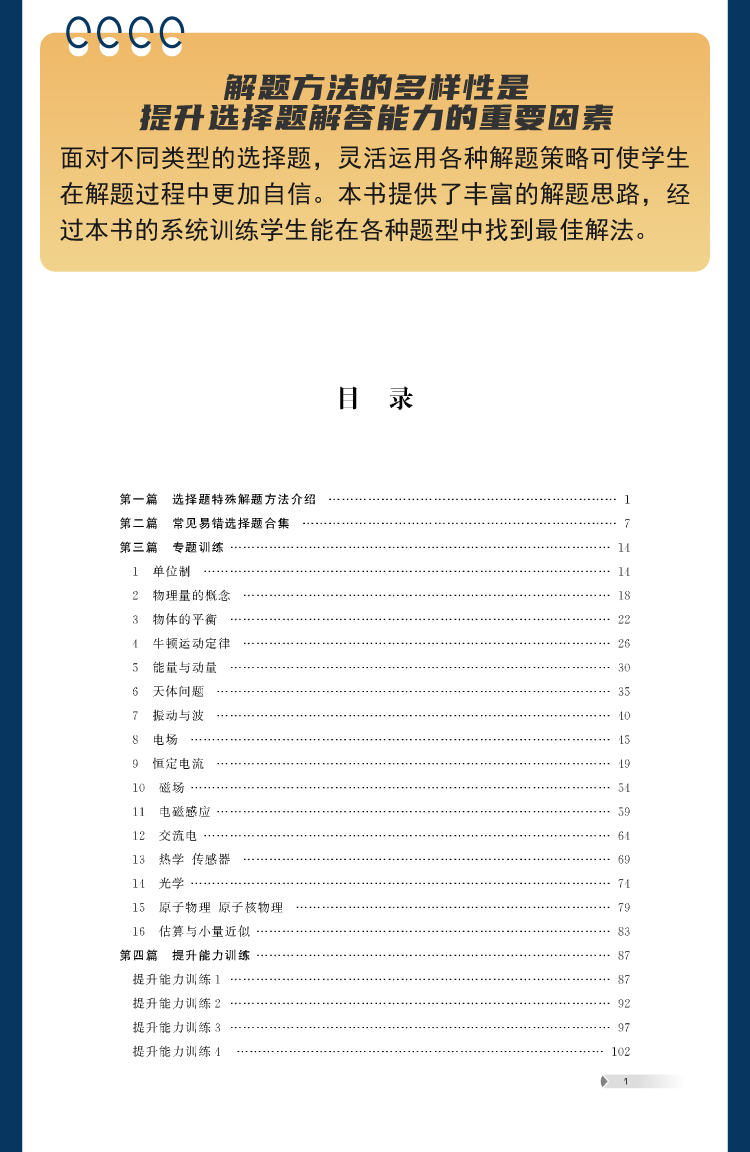 本书主要针对高考物理中的选择题部分进行全方位地专项突破,本书内容主要包括:选择题的特殊解题方法,选择题的易错例析,选择题的专项特训及10份押题卷。第一章的特殊解题方法,囊括了高考物理选择题中需要用的基本方法和基本技能,通过一题多解,让学生熟练掌握方法和技巧;第二章易错例析,摘选高考物理中的易错选择题,帮助学生分析做题时的盲点;第三章专项训练,按照知识体系,将选择题进行分类,帮助学生快速熟悉各个模块的选择题类型,最后10份押题卷,帮助学生模拟高考场景,让他们能更好地模拟高考场景,拿下高考选择题。
