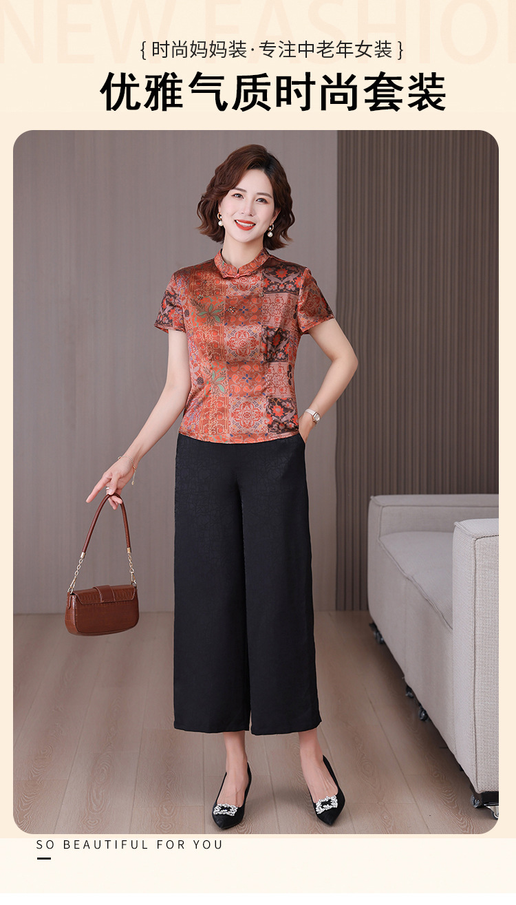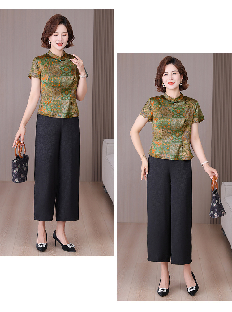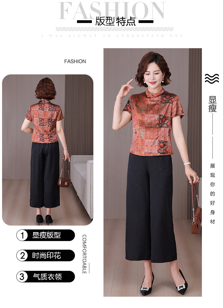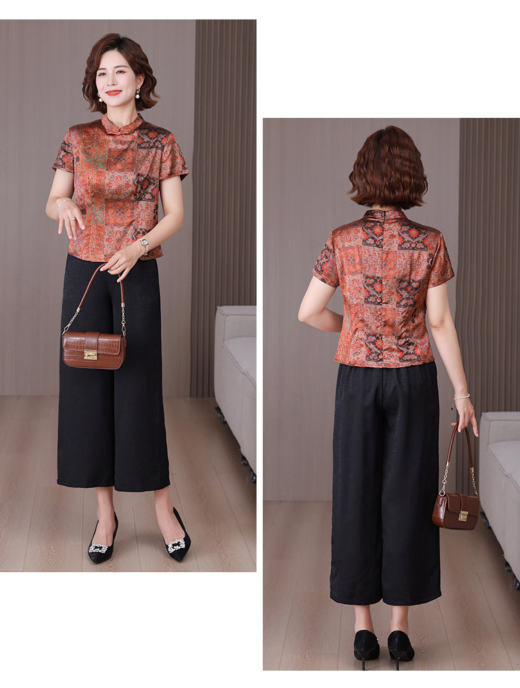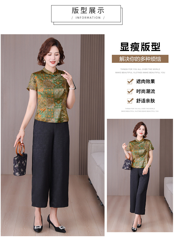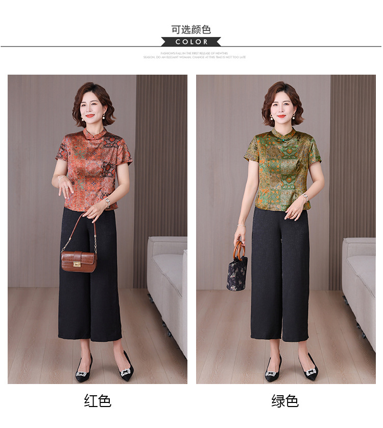 A34494品质气质妈妈新中式时尚复古钉珠真丝短款衬衫阔腿裤二件套装夏