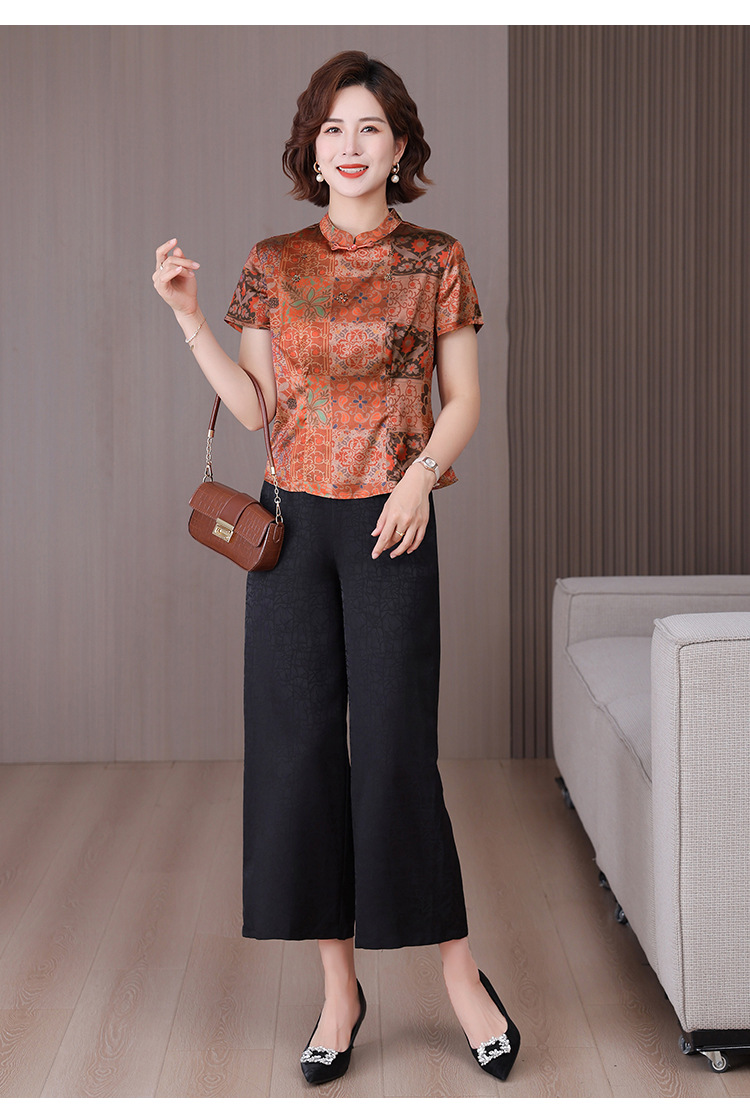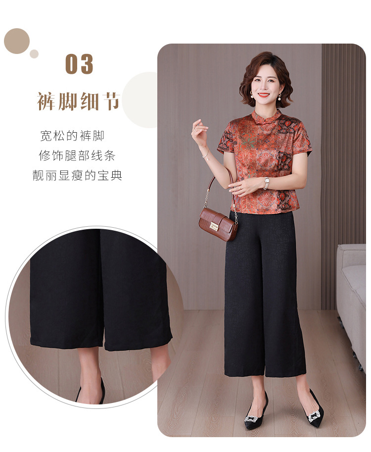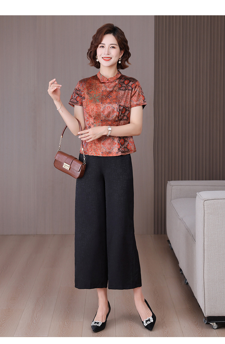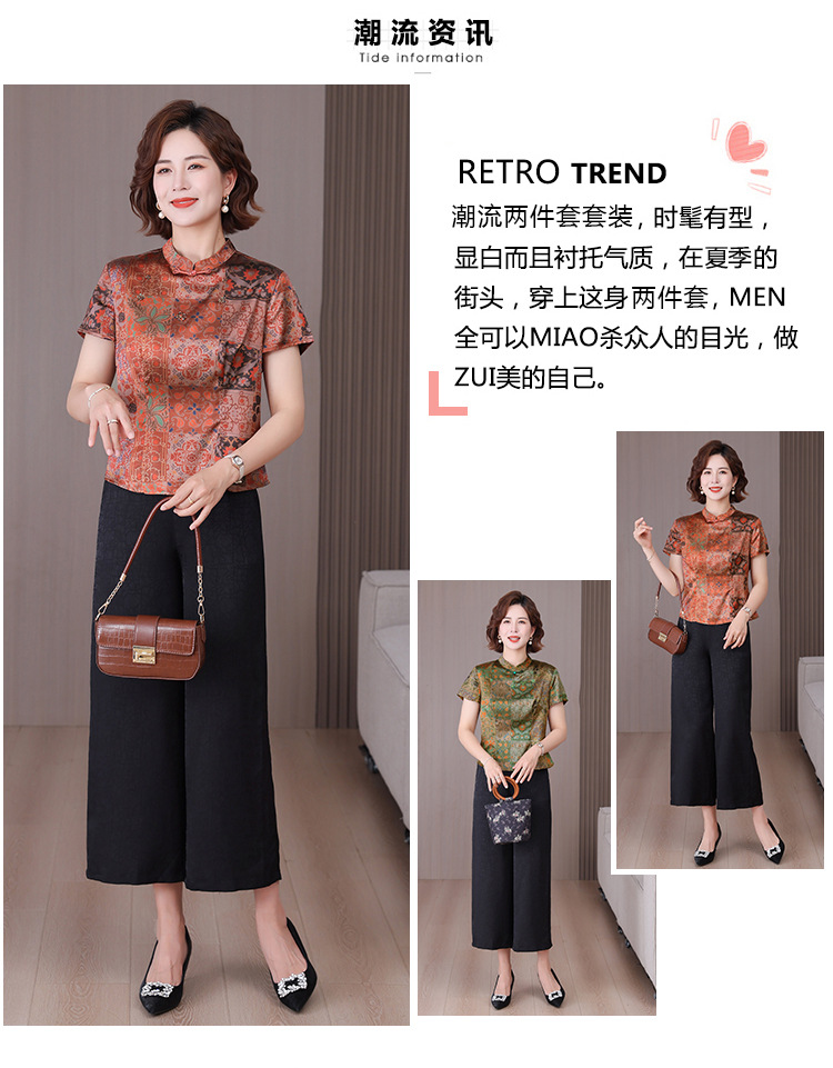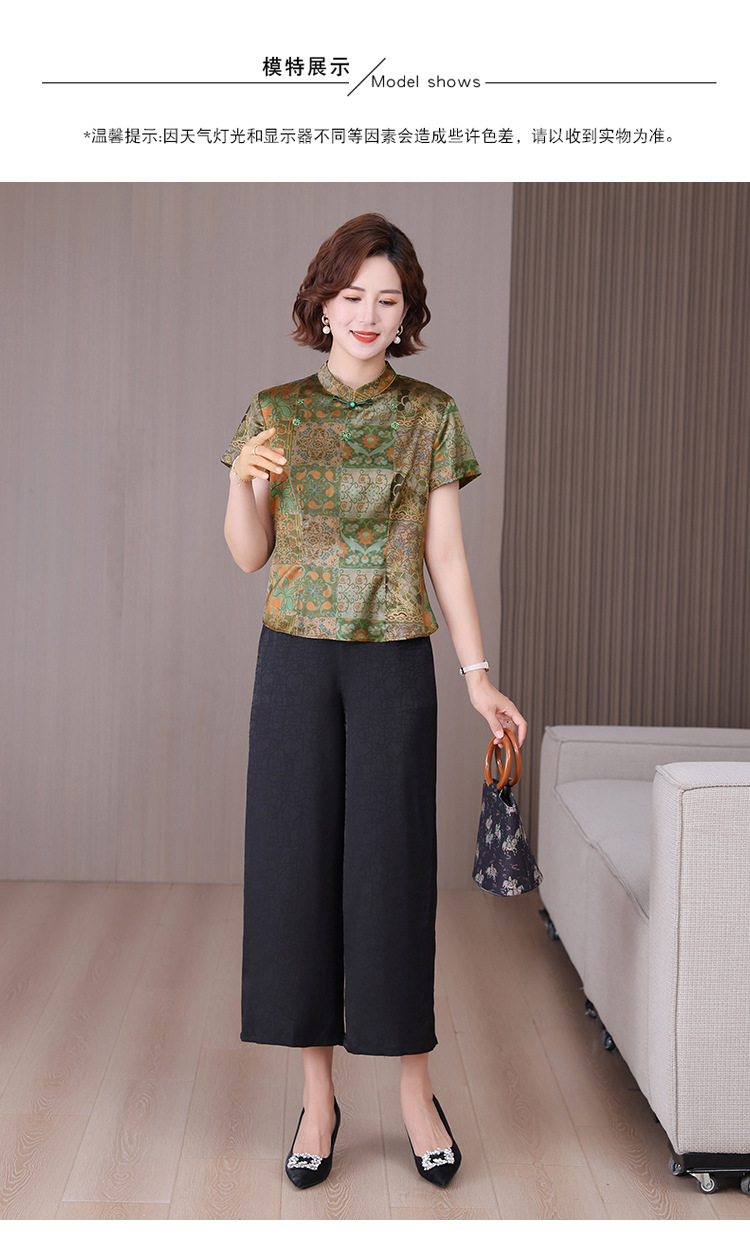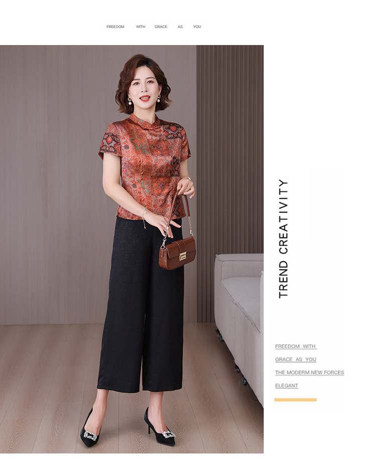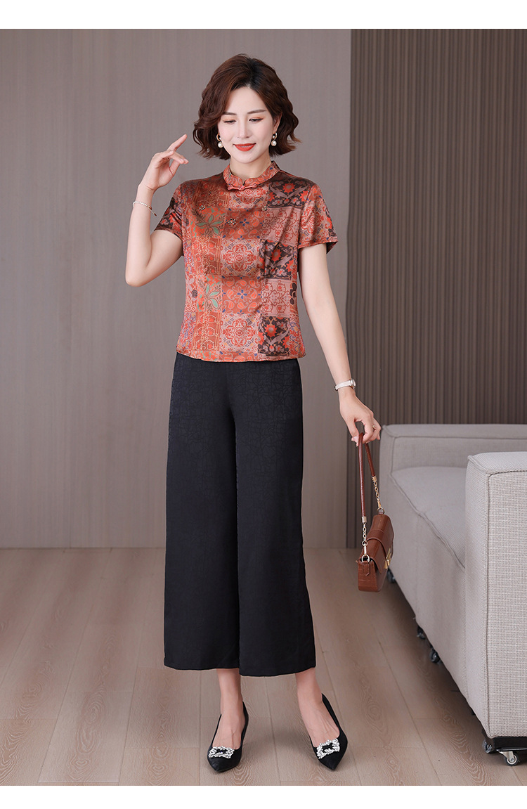 A34494品质气质妈妈新中式时尚复古钉珠真丝短款衬衫阔腿裤二件套装夏