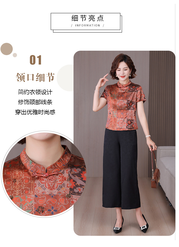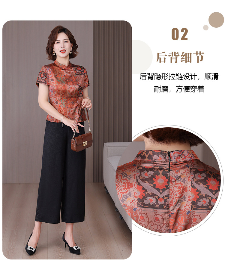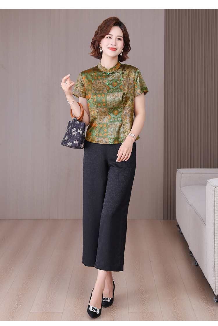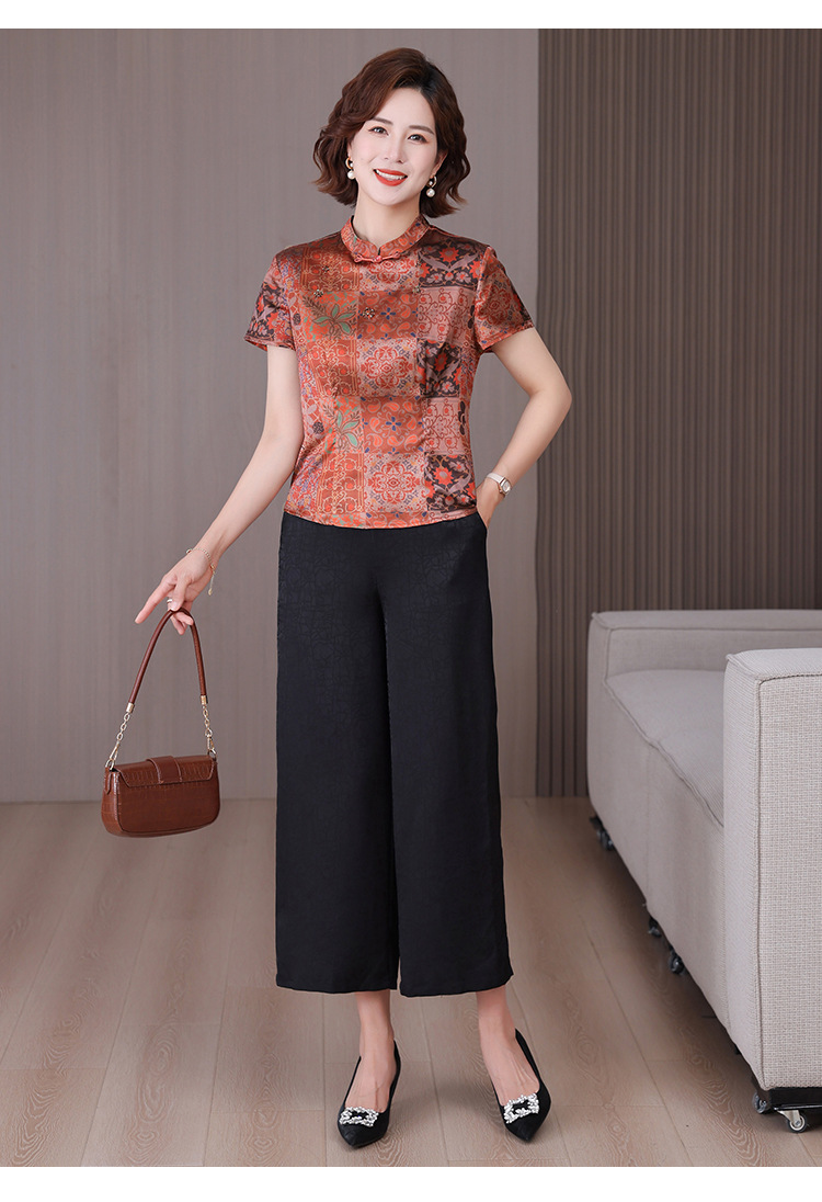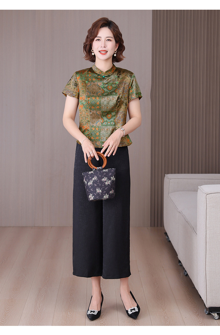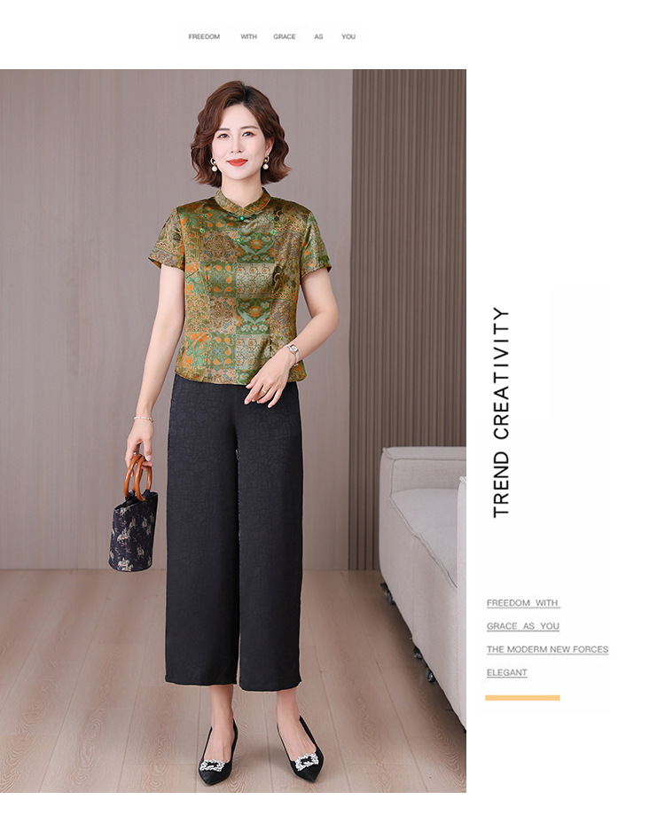 A34494品质气质妈妈新中式时尚复古钉珠真丝短款衬衫阔腿裤二件套装夏