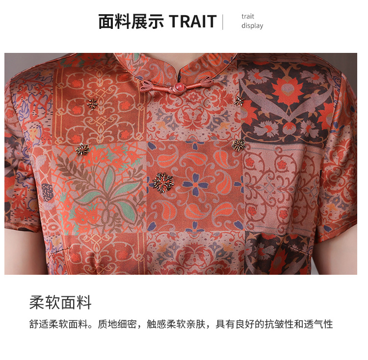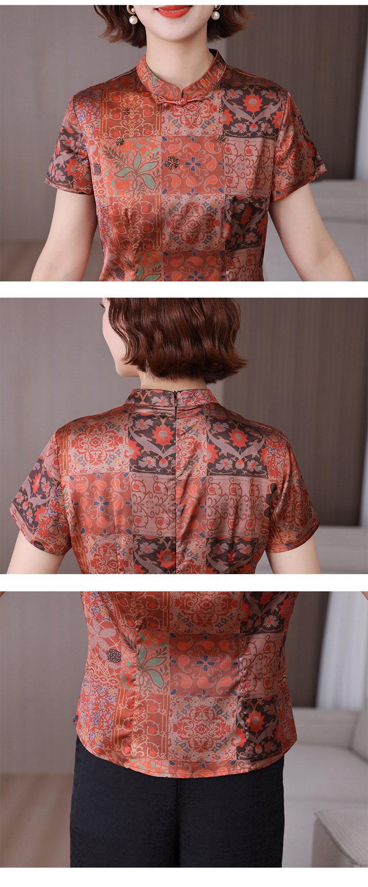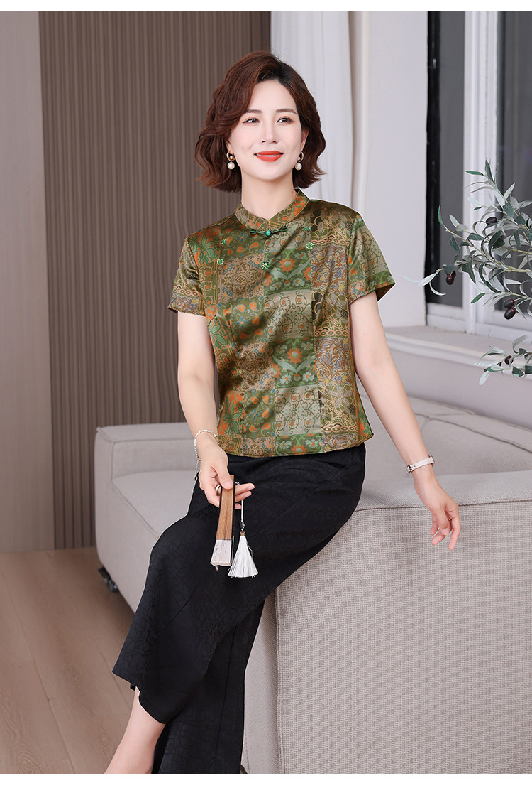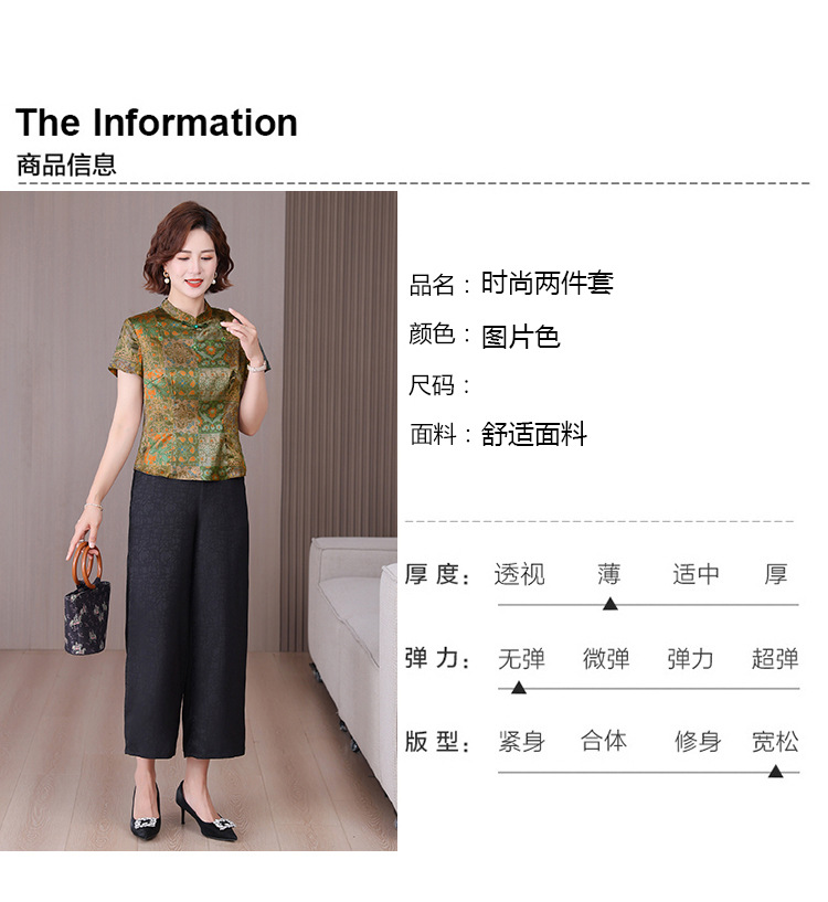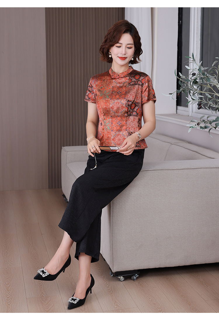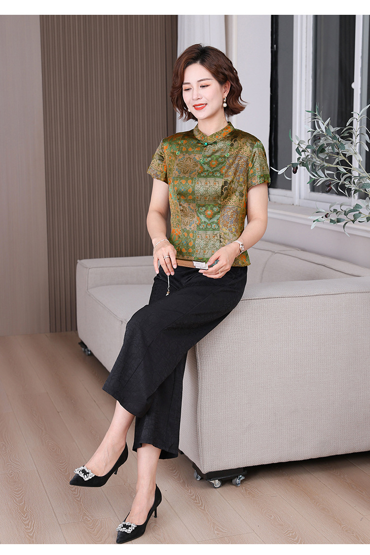 A34494品质气质妈妈新中式时尚复古钉珠真丝短款衬衫阔腿裤二件套装夏