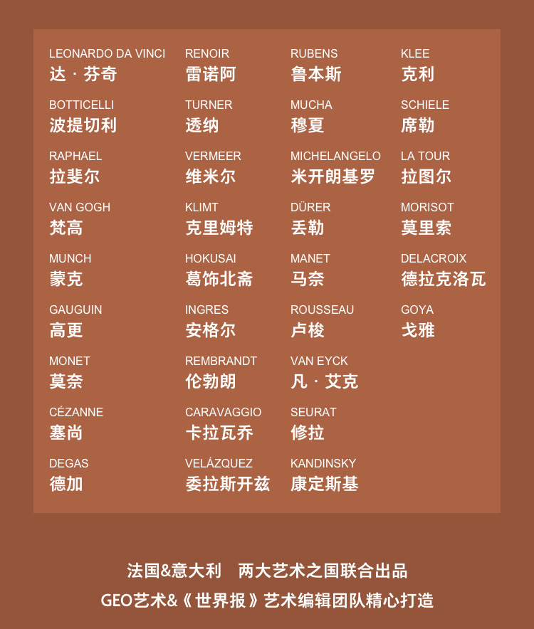 达芬奇、梵高、莫奈、透纳、蒙克、安格尔、雷诺阿、葛饰北斋、塞尚、伦勃朗、德加、委拉斯开兹、卡拉瓦乔、穆夏、鲁本斯、马奈、高更、丢勒、拉斐尔、克里姆特、凡·艾克、维米尔、米开朗基罗、波提切利、卢梭、康定斯基、修拉、克利、莫里索、德拉克洛瓦、戈雅、席勒、拉图尔