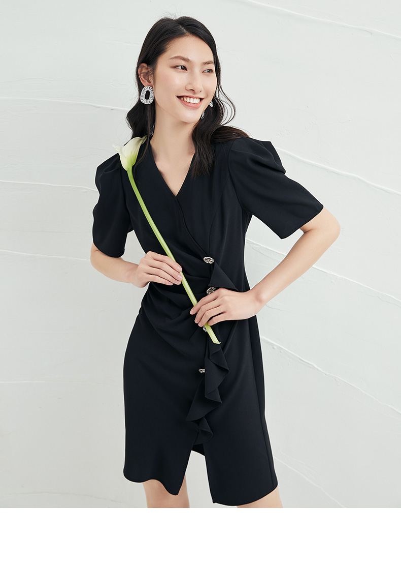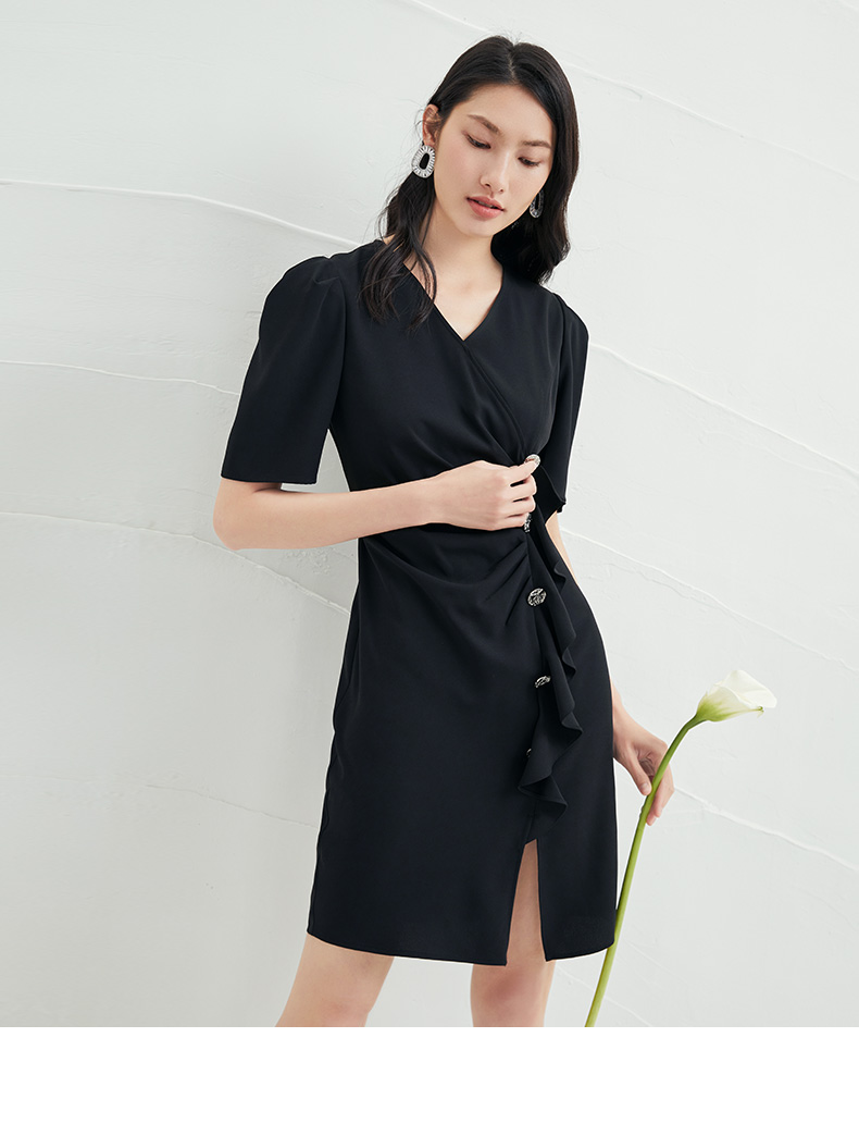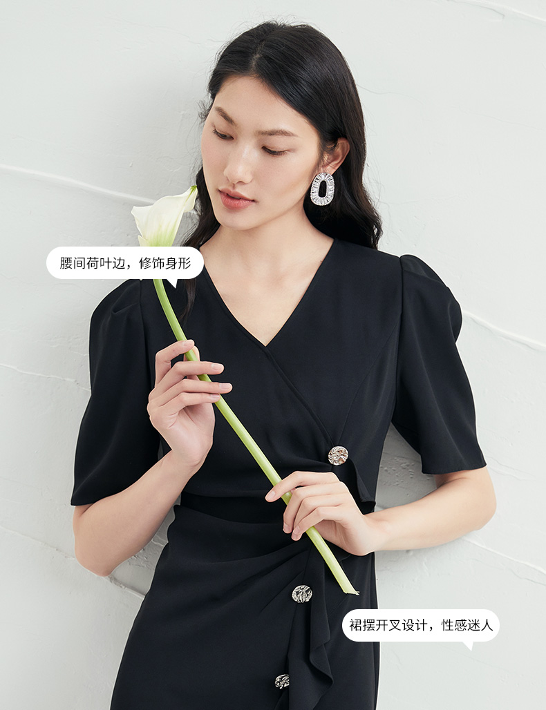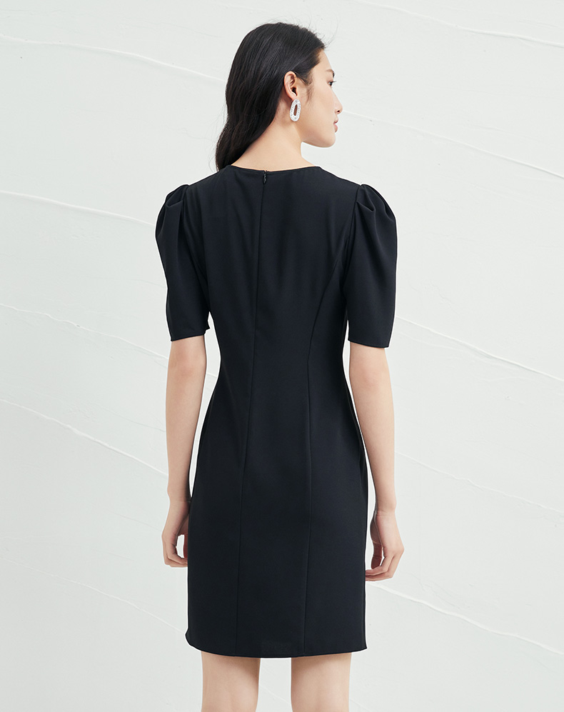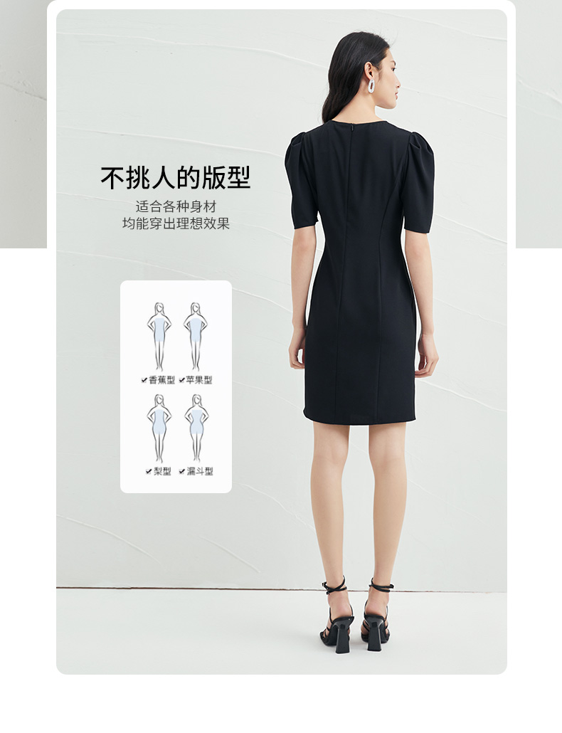 EITIE爱特爱夏季新款时尚泡泡袖开叉裙摆黑色修身a字连衣裙B2207954