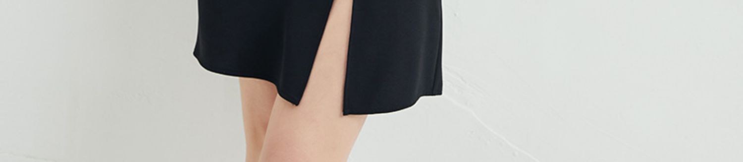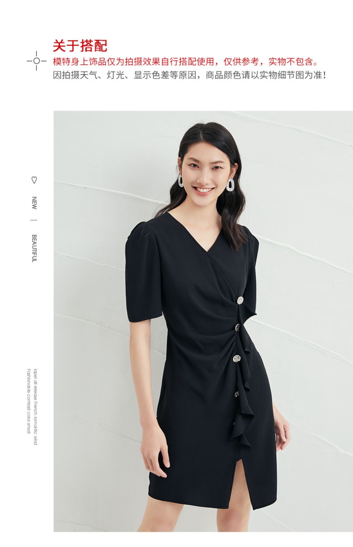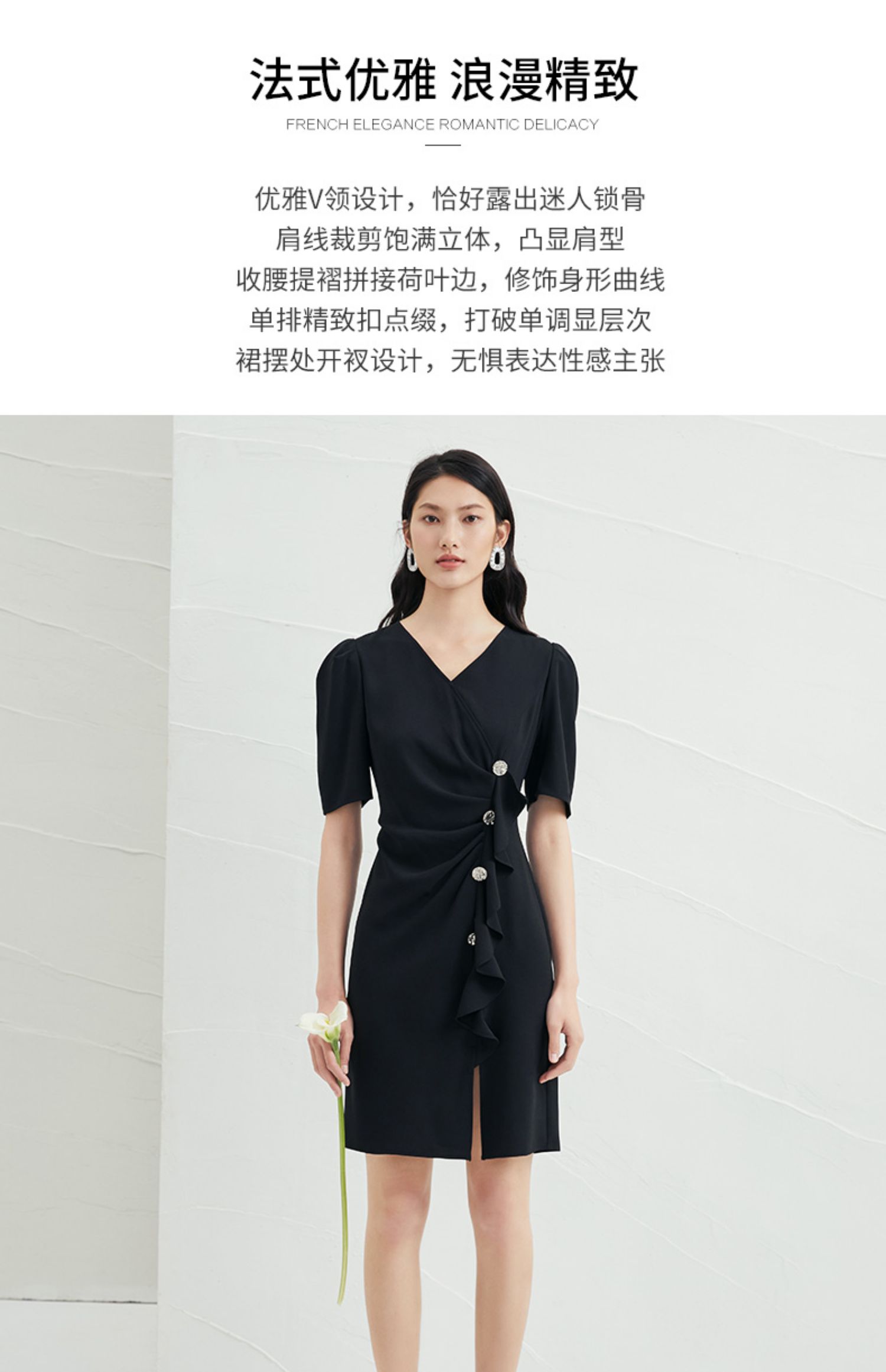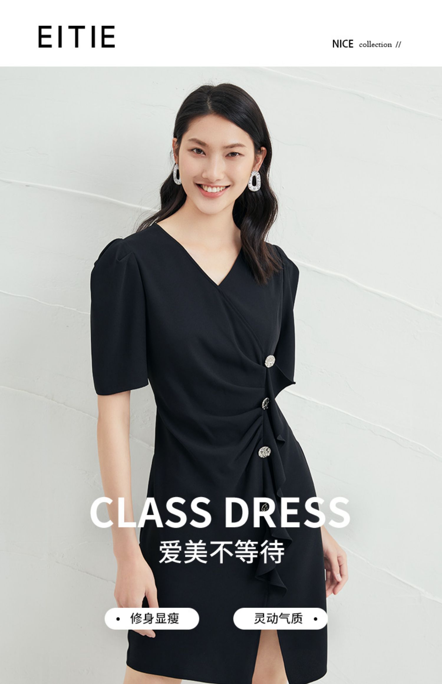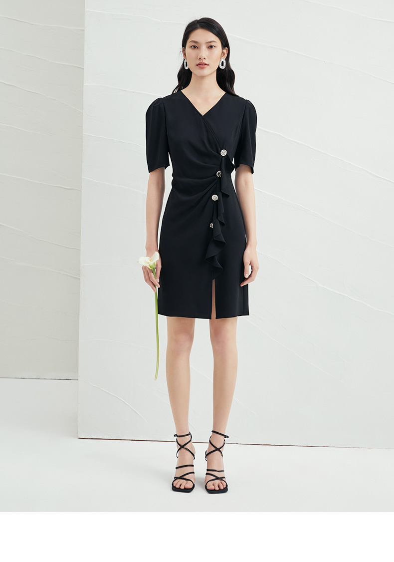EITIE爱特爱夏季新款时尚泡泡袖开叉裙摆黑色修身a字连衣裙B2207954