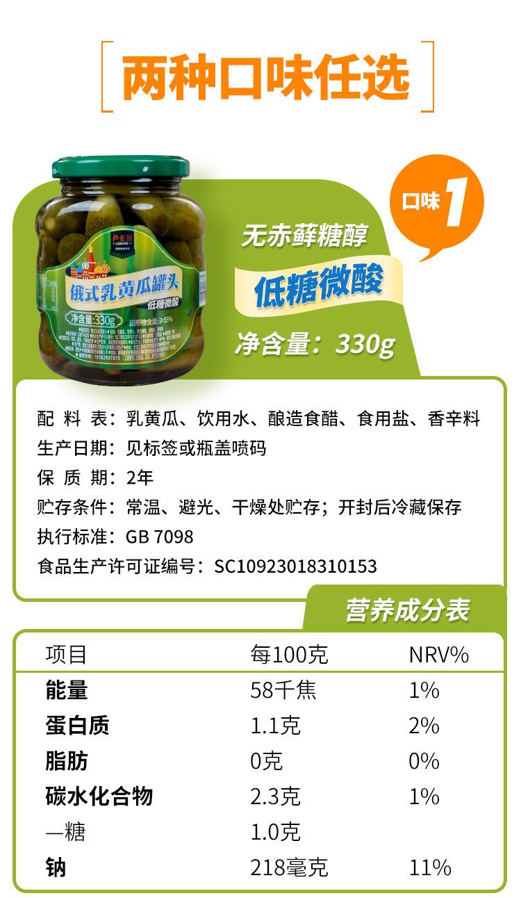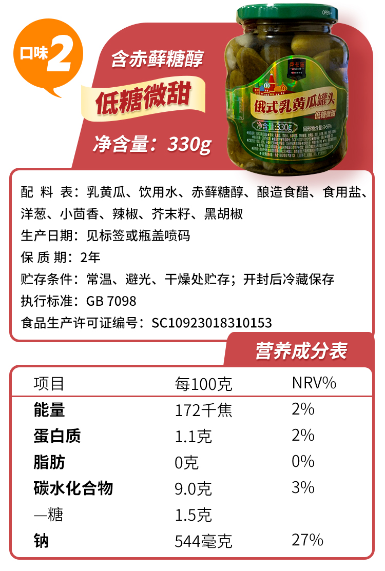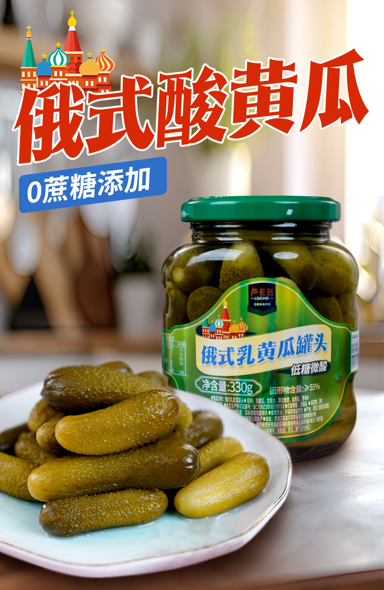 卢卡布无蔗糖俄式乳黄瓜 低糖微酸/微甜酸黄瓜罐头 330g/罐