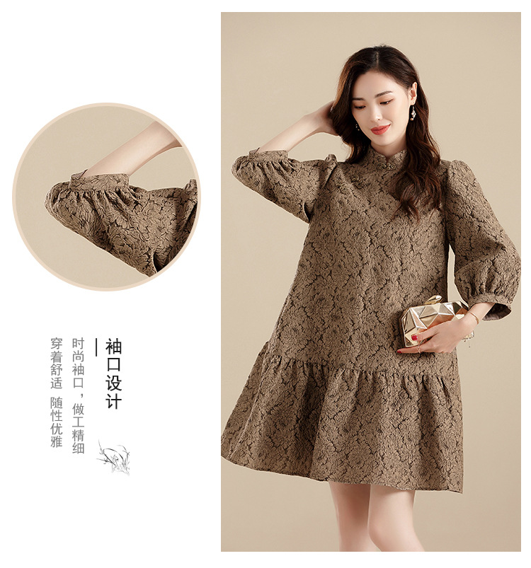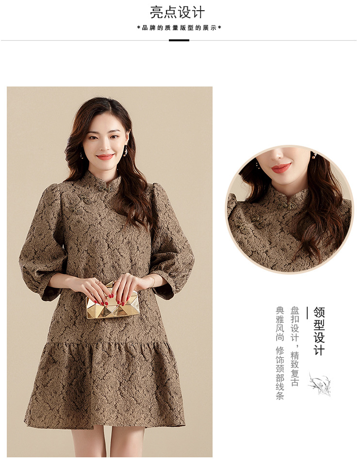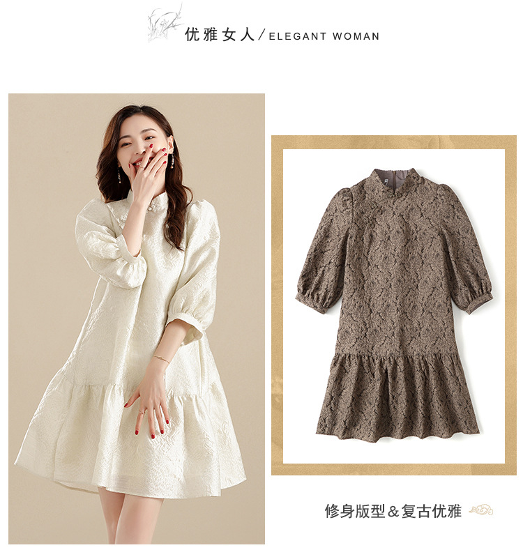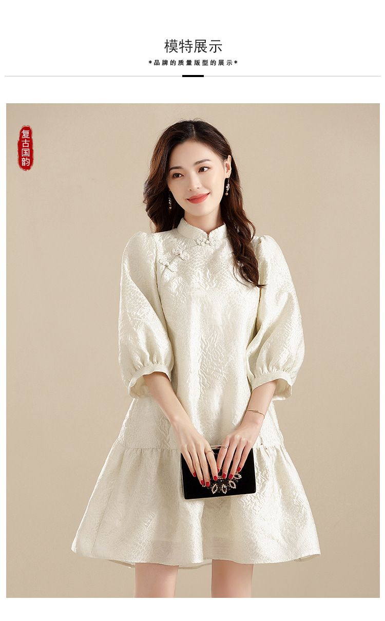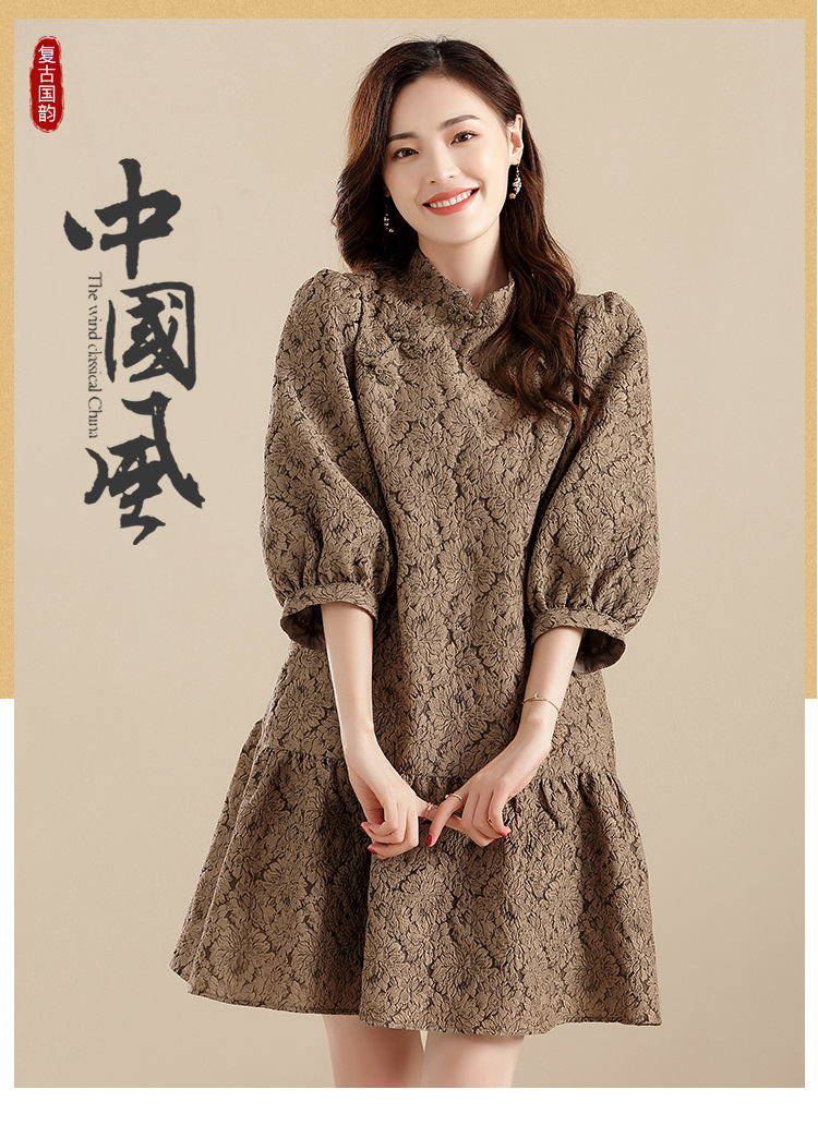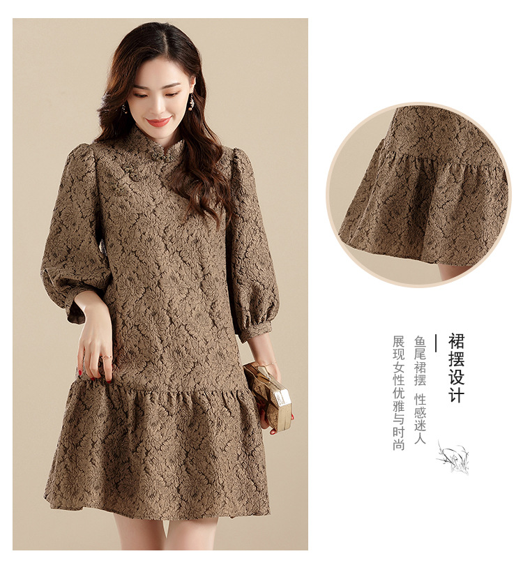 上海旗袍厂AYK-QF-210701金丝牡丹宽松旗袍改良时尚灯笼袖拼接下摆a字连裙2021秋国潮女装