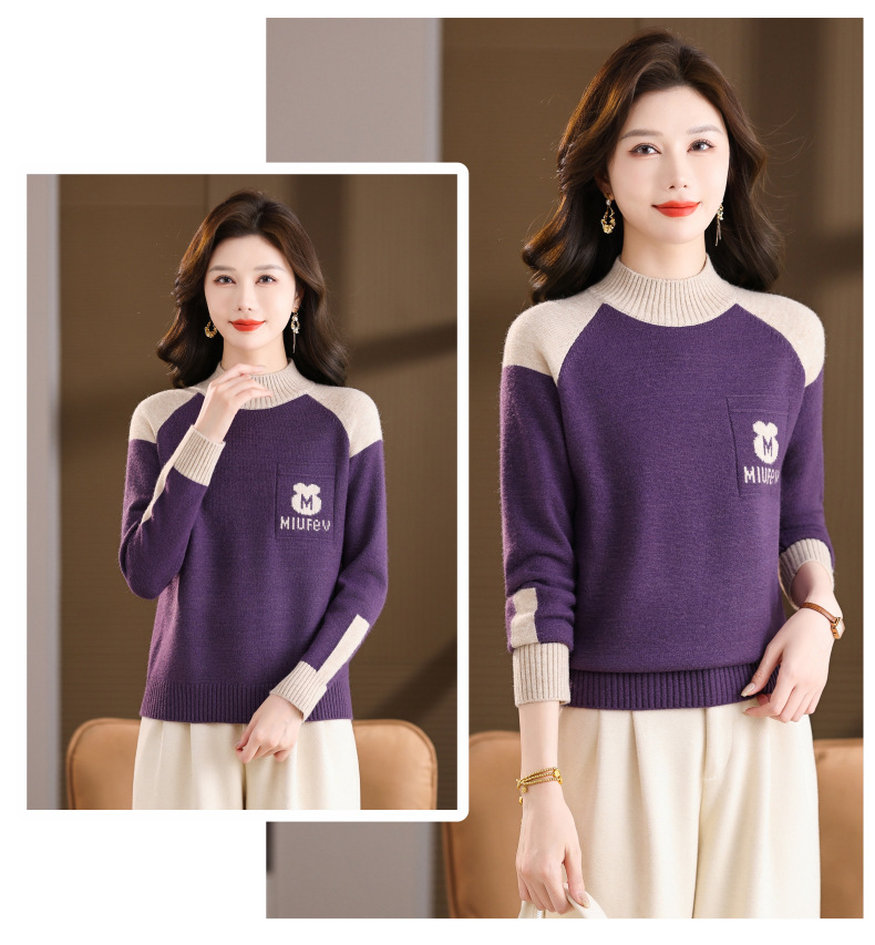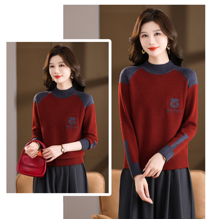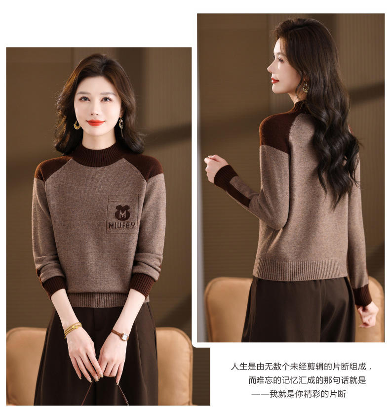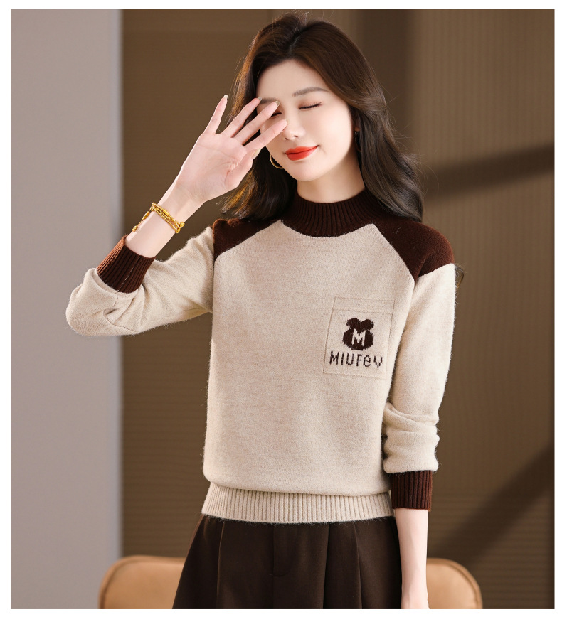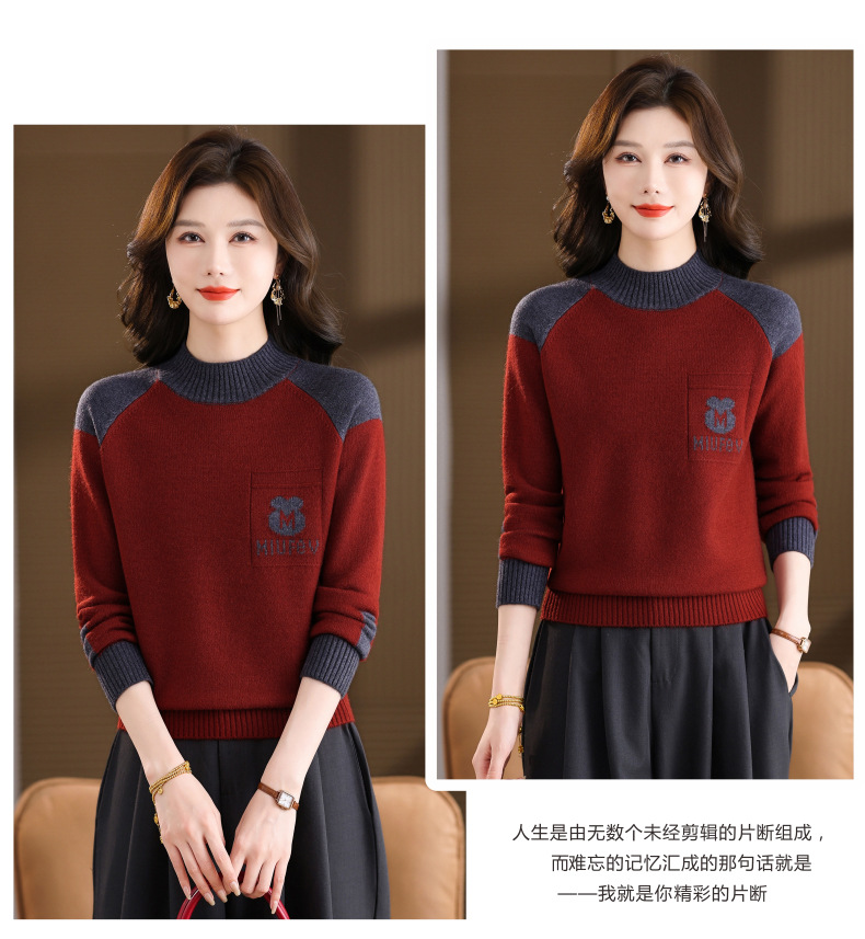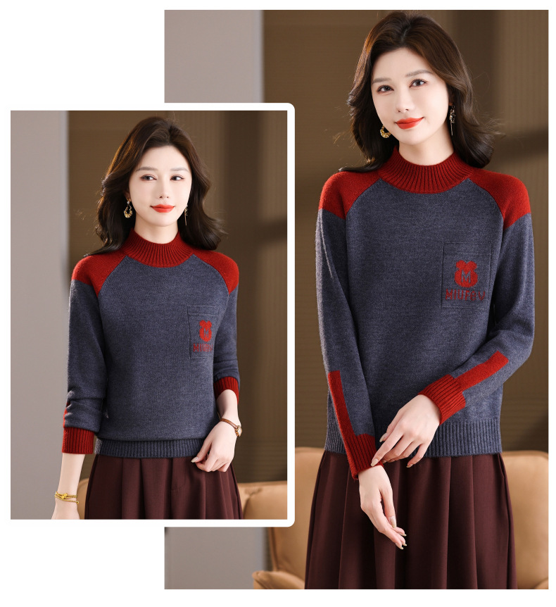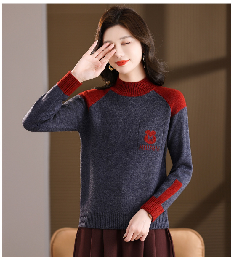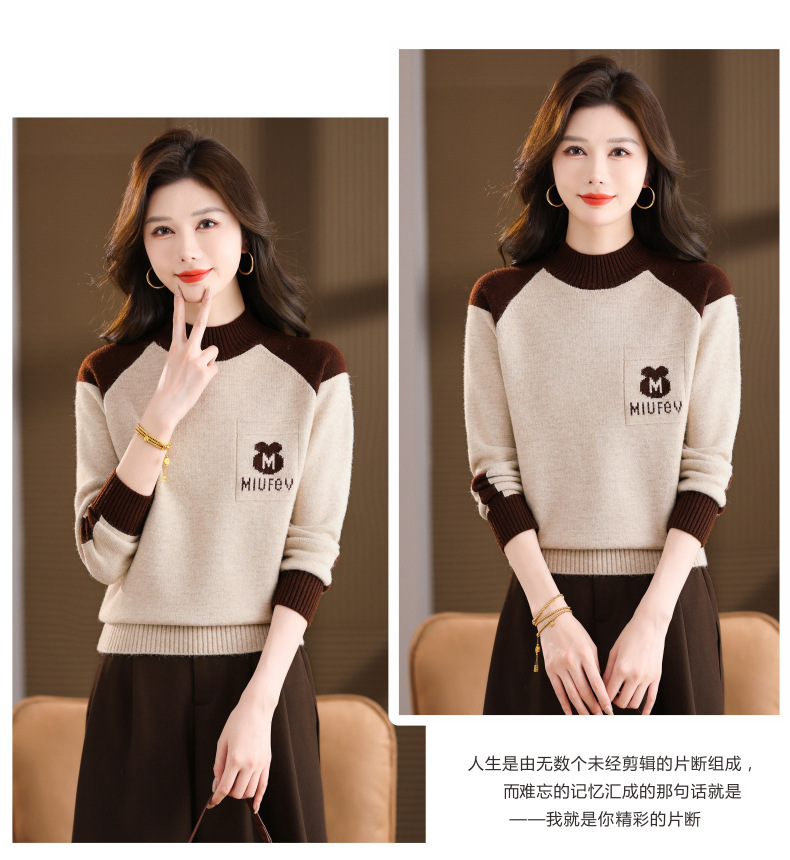 CC2025秋冬拼色半高领毛衣女卡通字母口袋针织衫显瘦长袖内搭打底衫