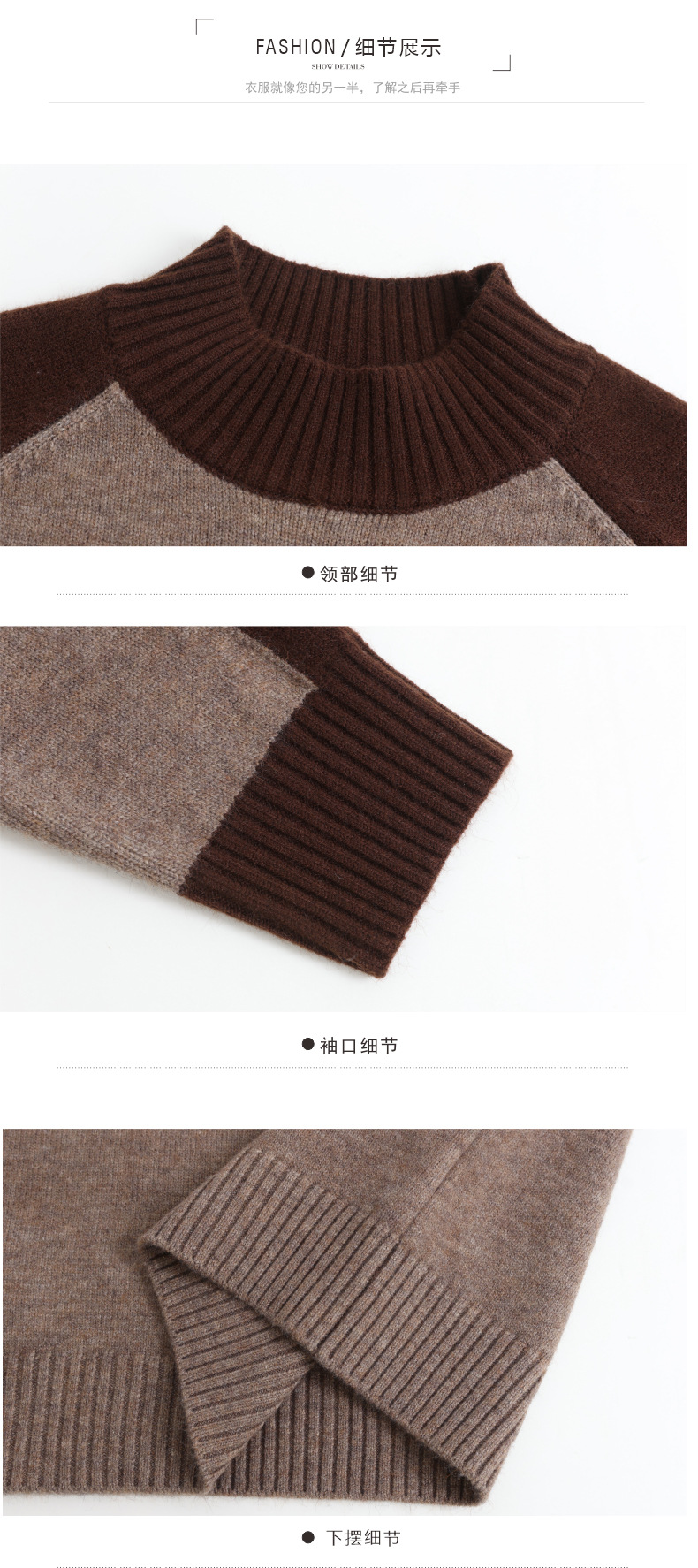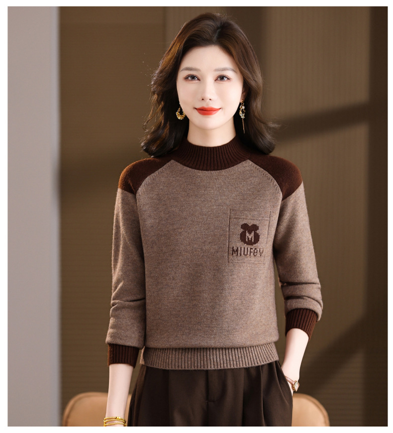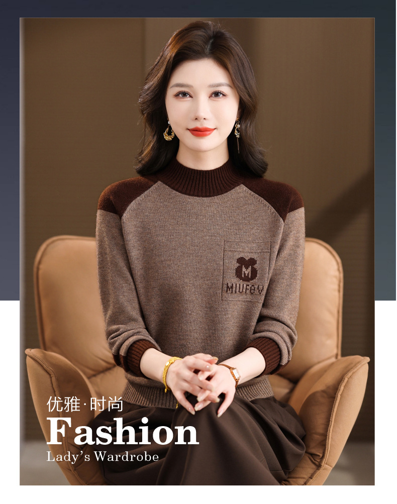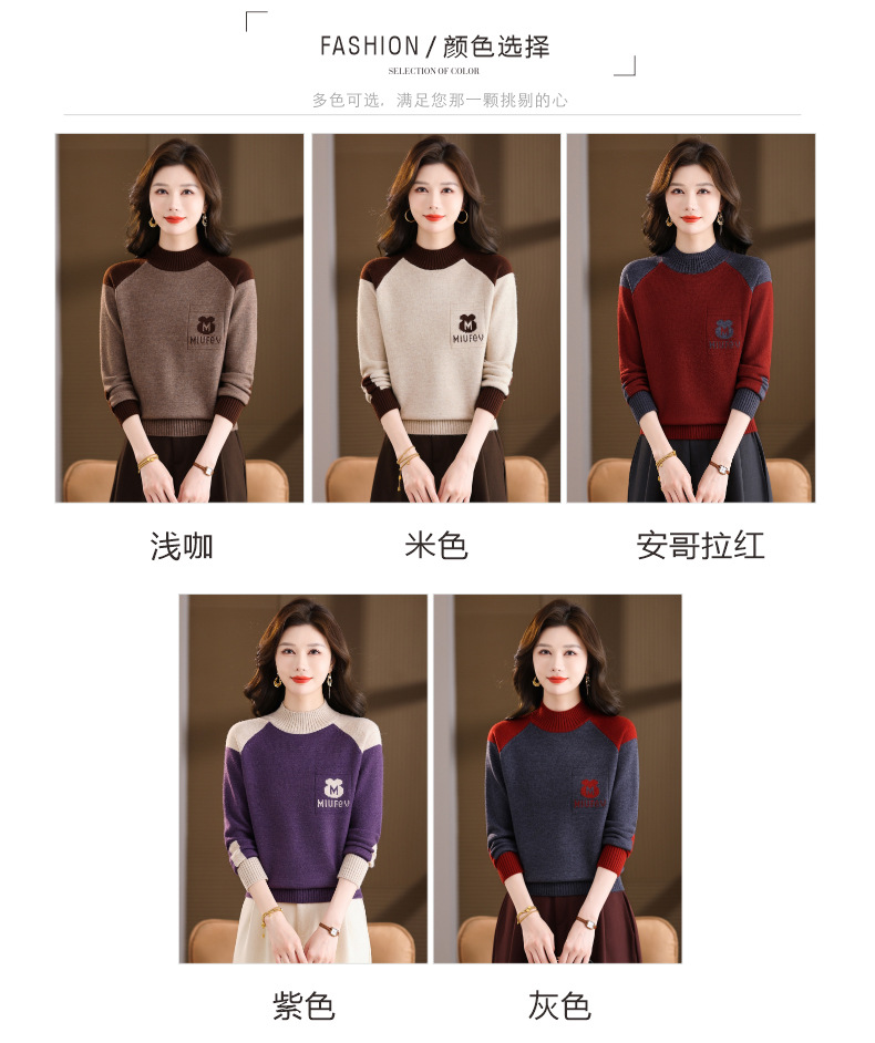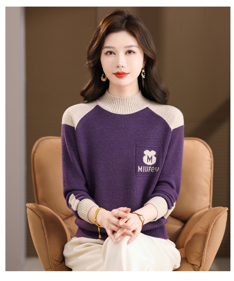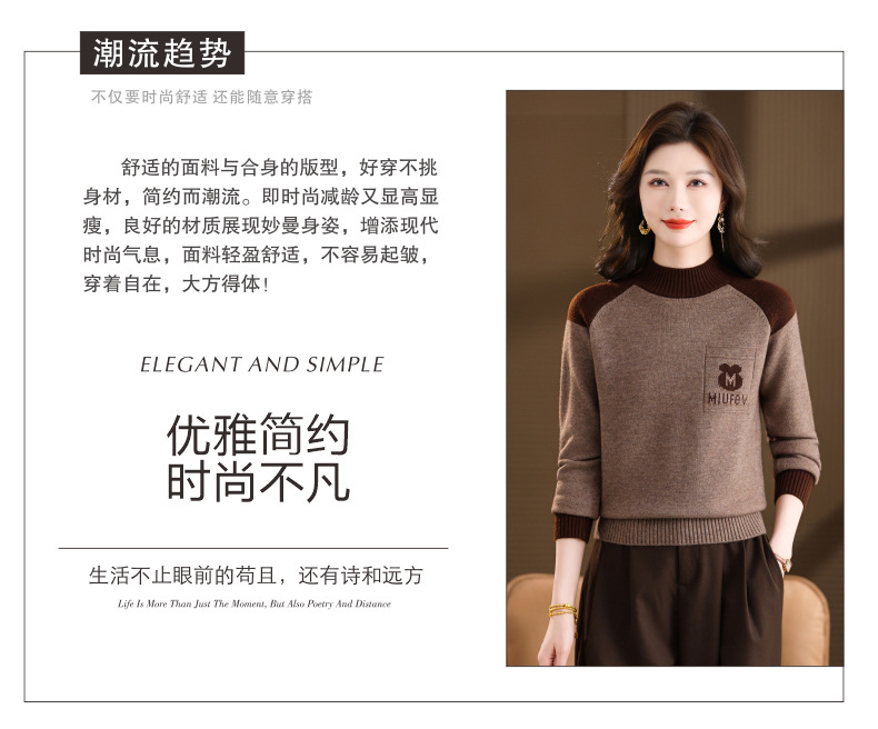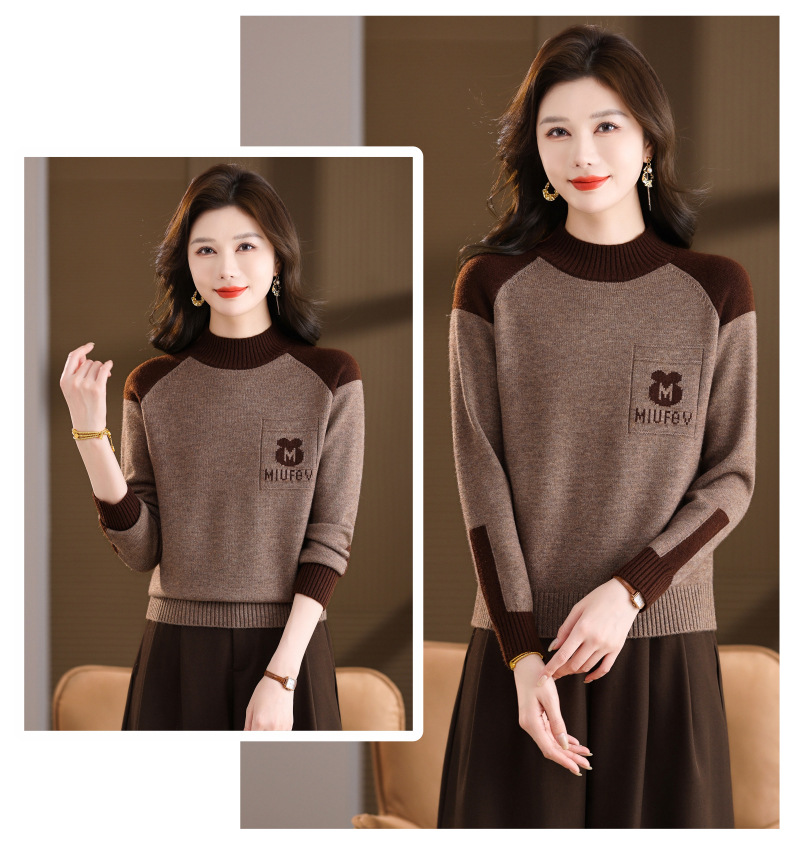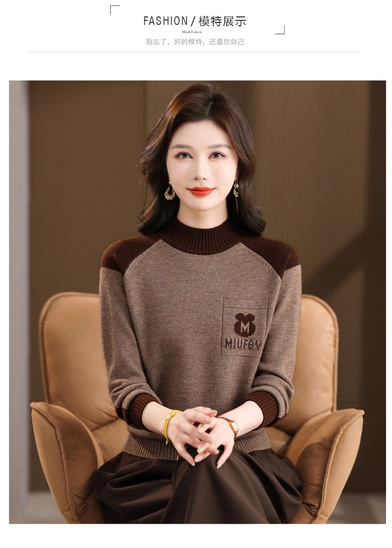 CC2025秋冬拼色半高领毛衣女卡通字母口袋针织衫显瘦长袖内搭打底衫