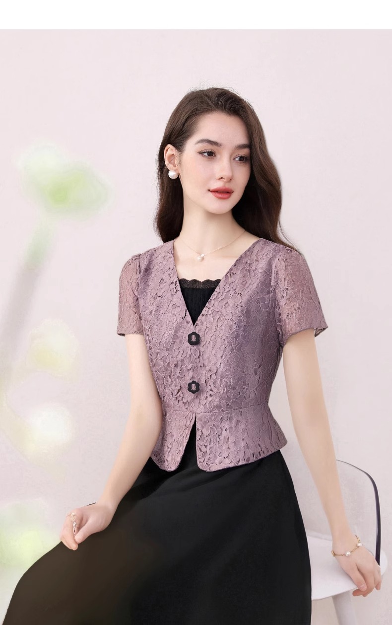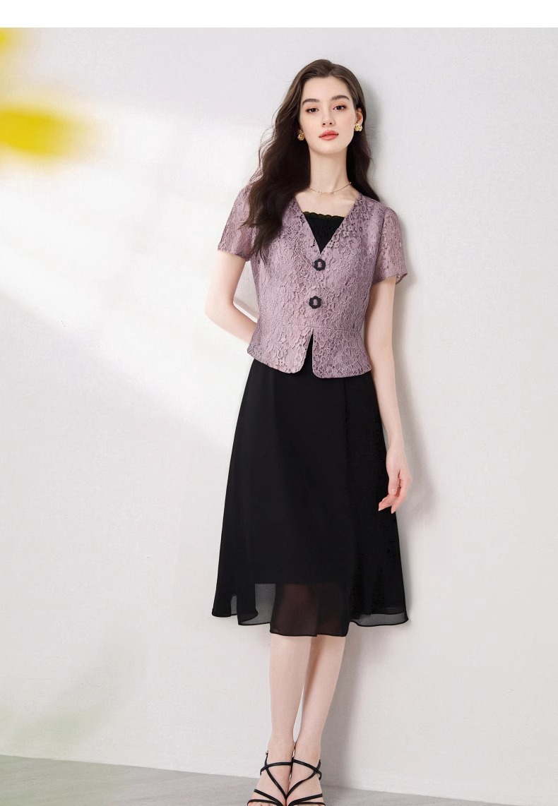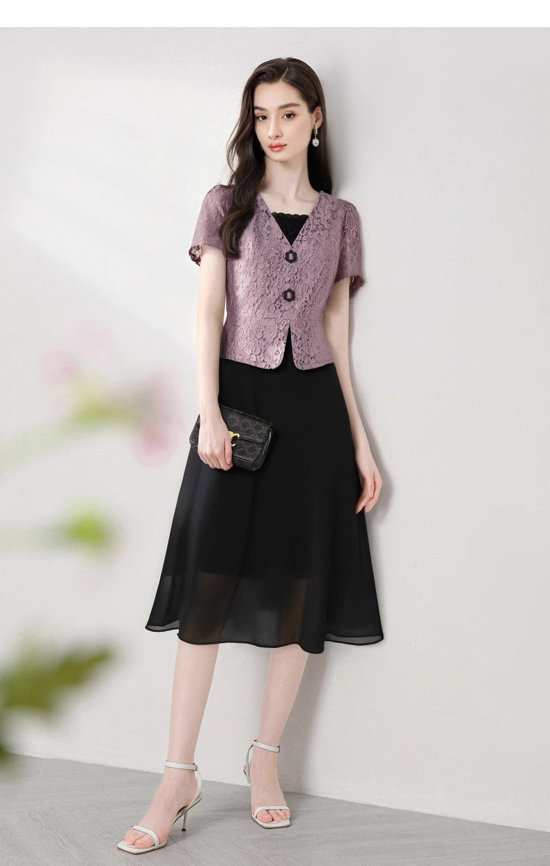 「自」全新升级【铂金会员220/天猫299/差价79】(11623)时尚蕾丝短袖拼接假两件连衣裙女夏季2025新款收腰显瘦裙子