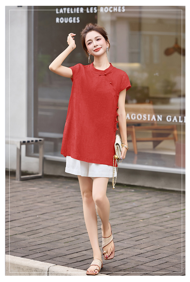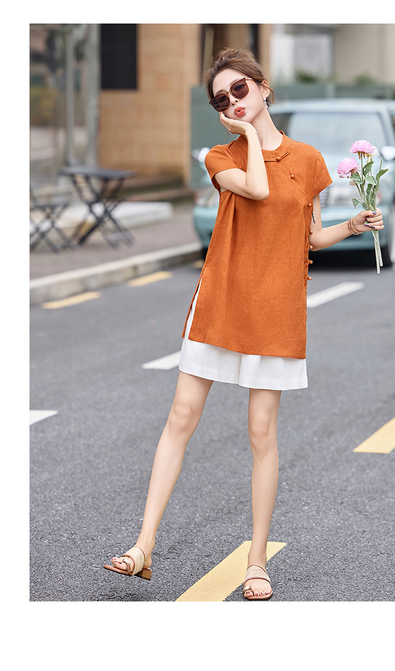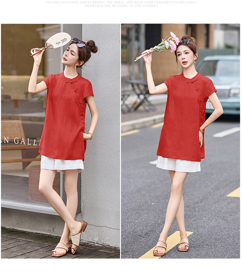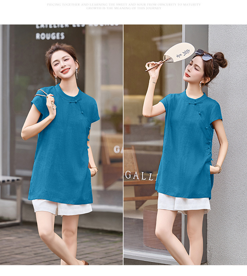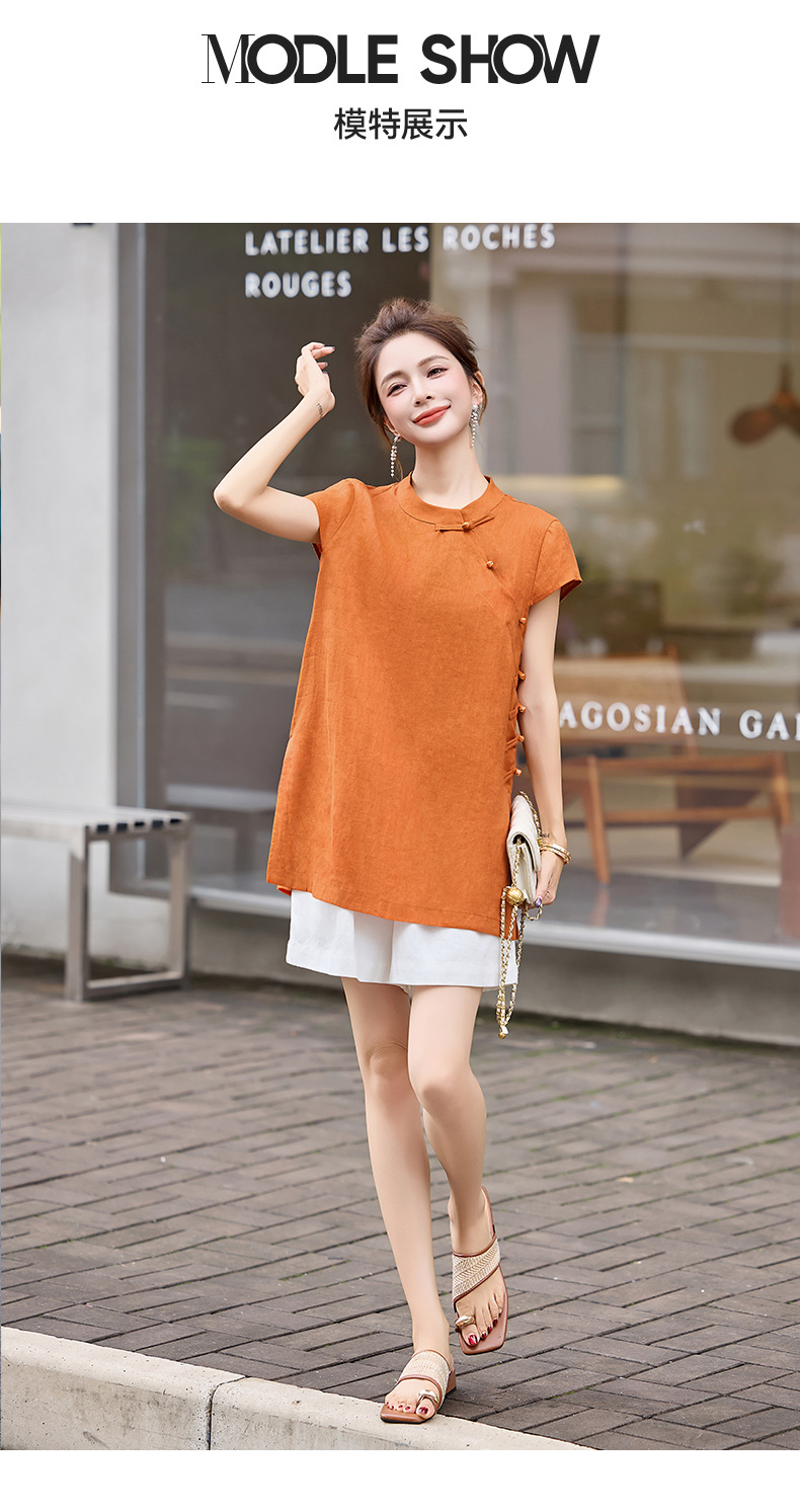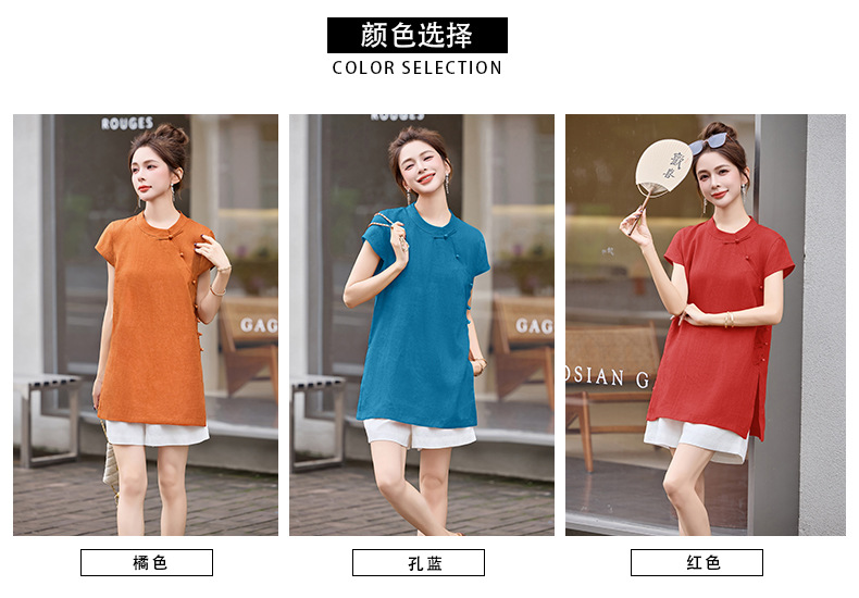 EHJY5089新中式棉麻套装女2025夏新款时尚复古洋气盘扣斜襟上衣短裤两件套