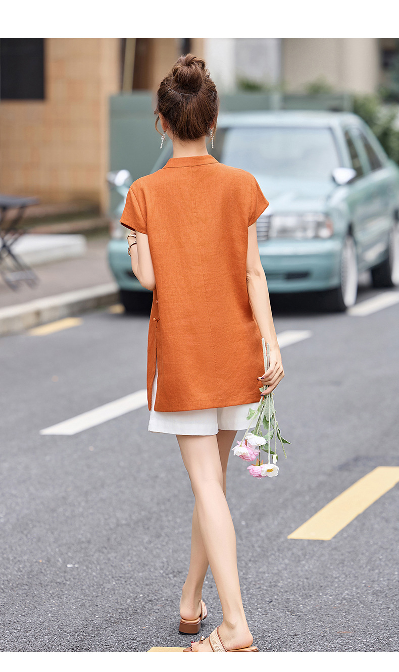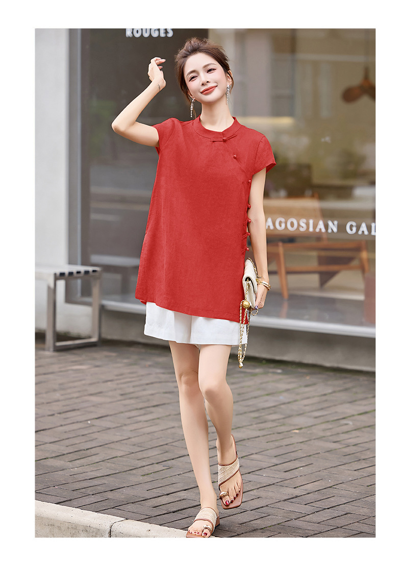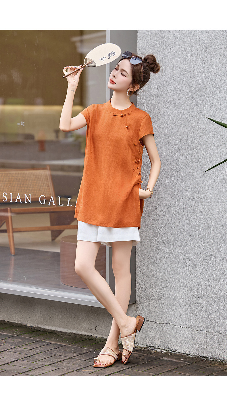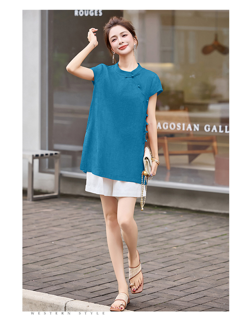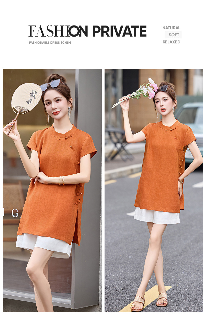 EHJY5089新中式棉麻套装女2025夏新款时尚复古洋气盘扣斜襟上衣短裤两件套