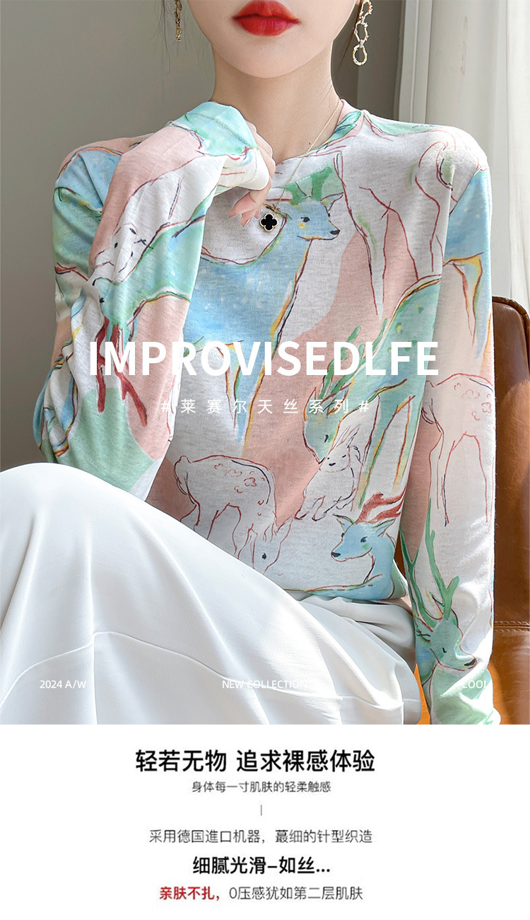 雀说新款天丝防晒打底衫女士轻奢感亲肤透气彩色印花薄款针织上衣AL03-163