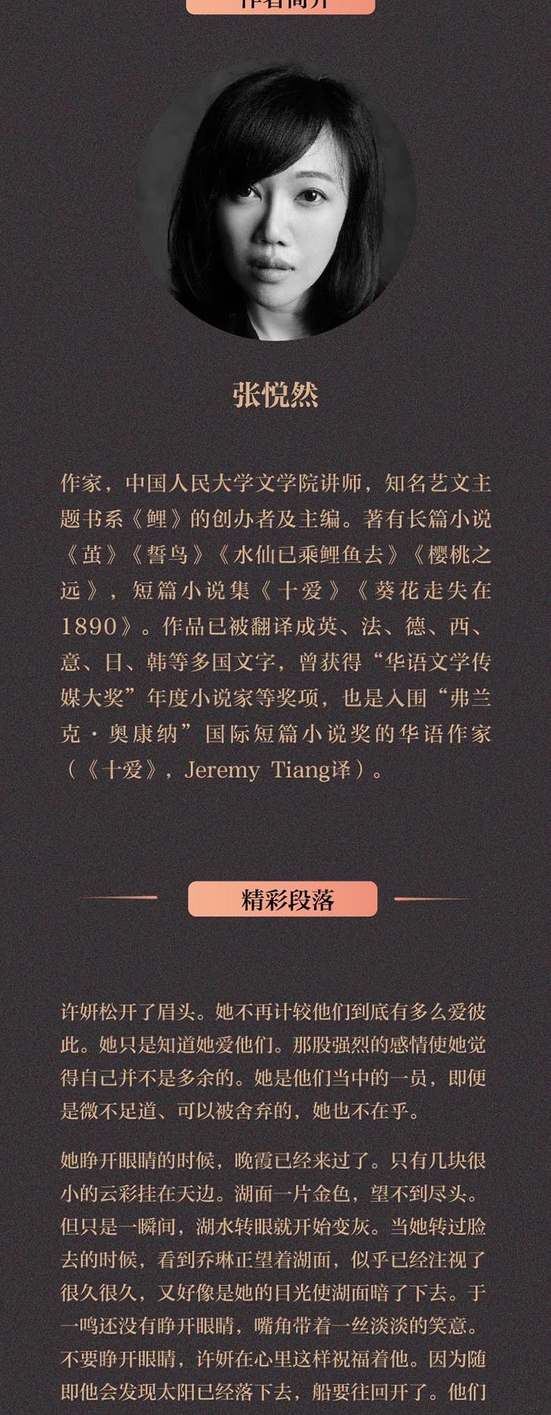 余 华:她对人物的把握准确。“准确”这个词在我这里是较高的赞扬……无论用什么语言、用什么样的方式,准确永远是一个作家的目标。 阎连科:真正能捕捉到人的骨缝幽深处的情感冷暖并在灵魂裂隙中丈量深浅的,怕也就是悦然的这些小说了。 ★继2016年长篇小说《茧》横扫各大图书榜单和文学奖项之后,张悦然推出全新力作。甄选近十年创作的中短篇小说,代表其创作新高峰的中篇小说《大乔小乔》,同名电影正在筹备中。 ★9个关于爱与孤独的故事:一意孤行的爱,自我放逐的孤独,突如其来的离别,微茫不灭的信仰……每一个故事都会让你探寻内心深处,遇到那个素未谋面的自己。