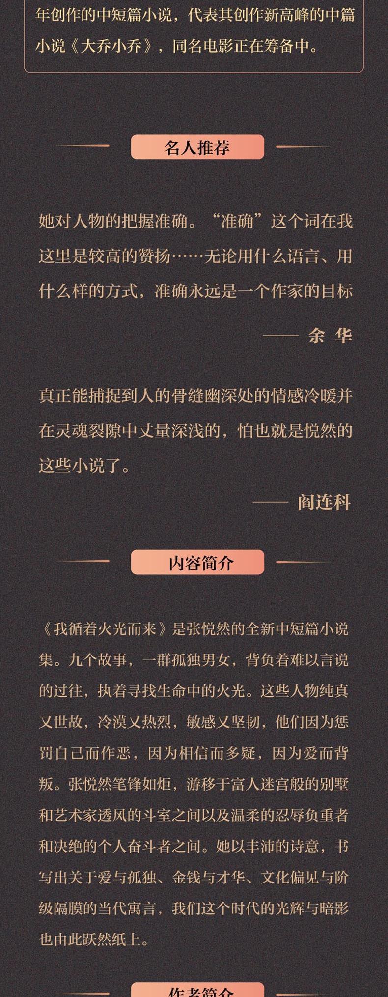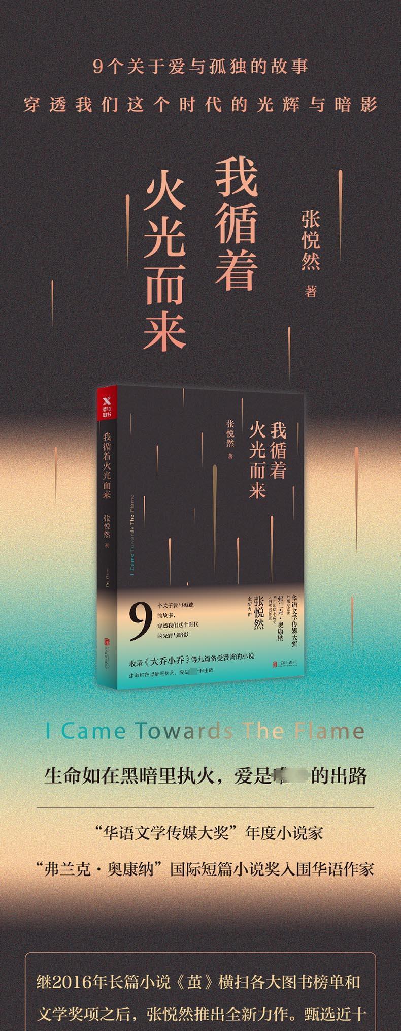 《我循着火光而来》是张悦然的全新中短篇小说集。九个故事,一群孤独男女,背负着难以言说的过往,执着寻找生命中的火光。这些人物纯真又世故,冷漠又热烈,敏感又坚韧,他们因为惩罚自己而作恶,因为相信而多疑,因为爱而背叛。张悦然笔锋如炬,以丰沛的诗意,书写出关于爱与孤独、金钱与才华、文化偏见与阶级隔膜的当代寓言,我们这个时代的光辉与暗影也由此跃然纸上。