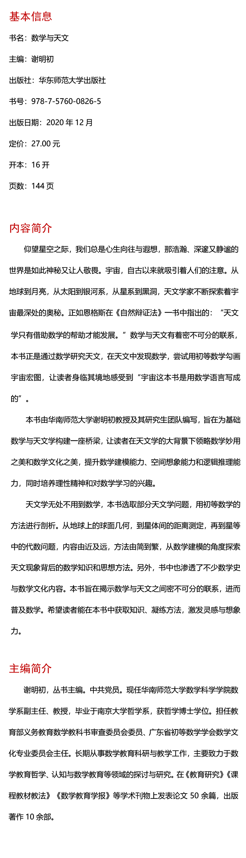 本书由华南师范大学谢明初教授及其研究生团队编写,旨在为基础数学与天文学构建一座桥梁,让读者在天文学的大背景下领略数学妙用之美和数学文化之美,提升数学建模能力、空间想象能力和逻辑推理能力,同时培养理性精神和对数学学习的兴趣。天文学无处不用到数学,本书选取部分天文学问题,用初等数学的方法进行剖析。从地球上的球面几何,到星体间的距离测定,再到星等中的代数问题,内容由近及远,方法由简到繁,从数学建模的角度探索天文现象背后的数学知识和思想方法。另外,书中也渗透了不少数学史与数学文化内容。本书旨在揭示数学与天文之间密不可分的联系,进而普及数学。希望读者能在本书中获取知识、凝练方法,激发灵感与想象力。