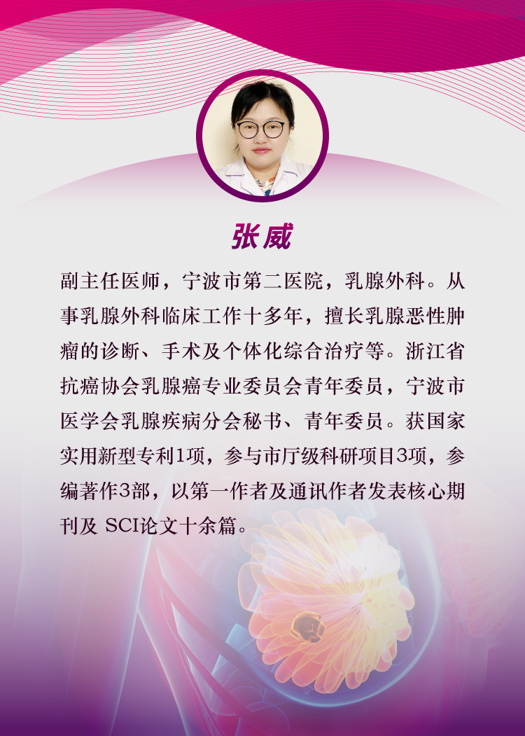 张威,副主任医师,宁波市第二医院,乳腺外科。从事乳腺外科临床工作十多年,擅长乳腺恶性肿瘤的诊断、手术及个体化综合治疗等。浙江省抗癌协会乳腺癌专业委员会青年委员,宁波市医学会乳腺疾病分会秘书、青年委员。获国家实用新型专利 1项,参与市ting级科研项目 3项,参编著作 3部,以di一作者及通讯作者发表核心期刊及 SCI论文十余篇。