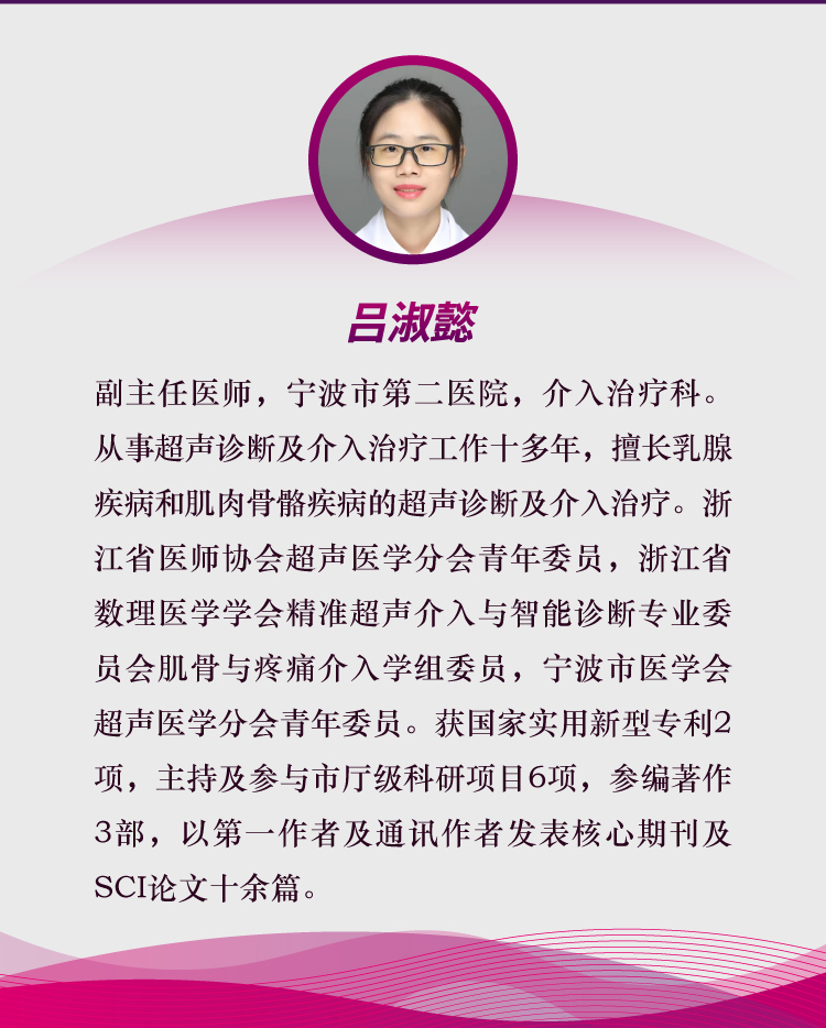 吕淑懿,副主任医师,宁波市第二医院,介入治疗科。从事超声诊断及介入治疗工作十多年,擅长乳腺疾病和肌肉骨骼疾病的超声诊断及介入治疗。浙江省医师协会超声医学分会青年委员,浙江省数理医学学会精准超声介入与智能诊断专业委员会肌骨与疼痛介入学组委员,宁波市医学会超声医学分会青年委员。获国家实用新型专利 2项,主持及参与市厅级科研项目6项,参编著作 3部,以第一作者及通讯作者发表核心期刊及 SCI论文十余篇。