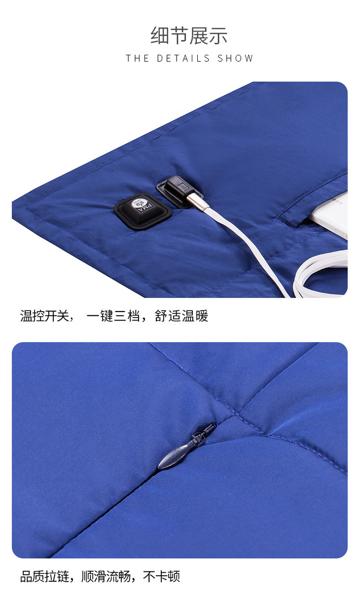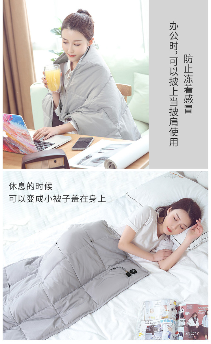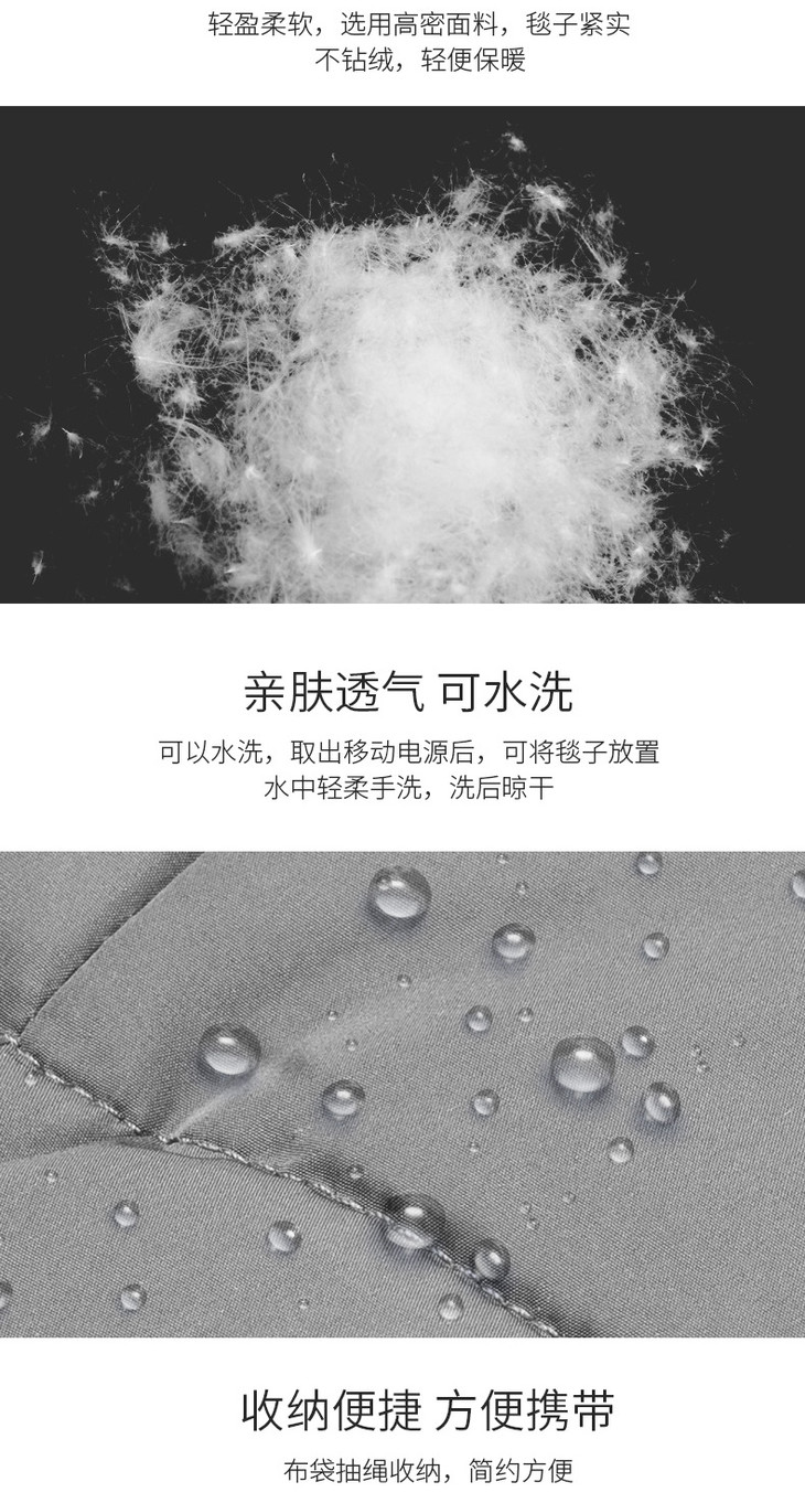 温馨提醒:此产品需配套移动电源或者连接电源使用。 5000毫安以上,电源尺寸为10.5*17.5cm以内的移动电源均可使用(毯子电池袋口10.5*深度17.5cm)。