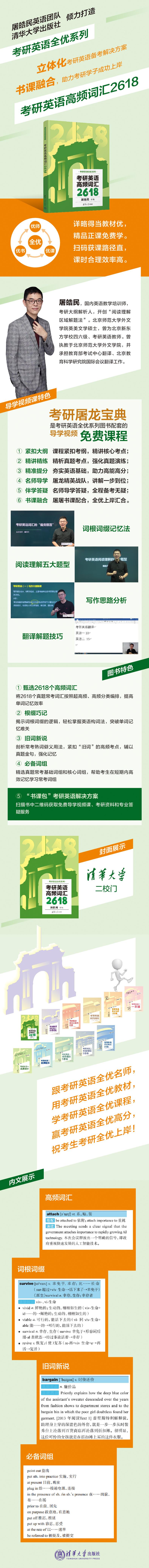 本书是全国硕士研究生招生考试备考用书,全书共包含四个单元。第一单元是高频词汇,编者根据对真题和词汇考查重点的研究,精选2618个高频词汇,帮助考生在短期内高效记忆考研英语词汇。词汇讲解包含单词、音标、词性、中文释义、搭配、巧记、拓展和诵读等内容,内容重点突出。第二单元是词根词缀,编者以考研大纲英语词缀为出发点,揭示词根词缀的逻辑,使考生懂得基本的构词法,突破单词记忆的难关。第三单元是旧词新说,编者依据历年真题对单词熟词僻义的考查重点,通过真题例句讲解单词的基本意思以及常考僻义,帮助考生掌握高频“旧词”的考点。第四单元是推荐词组,编者甄选历年真题常考词组,帮助考生在短时间内高效记忆学习常考词组。